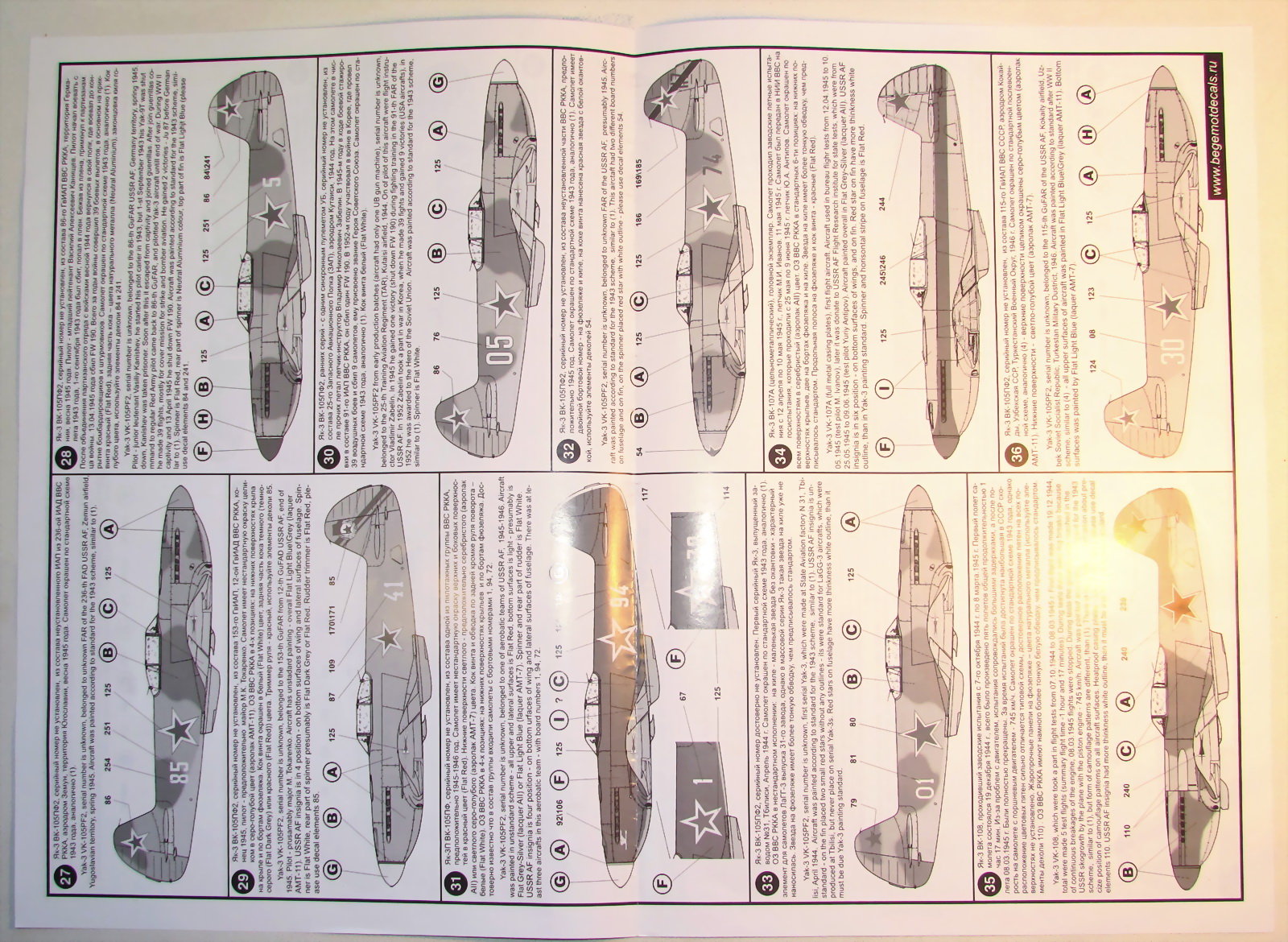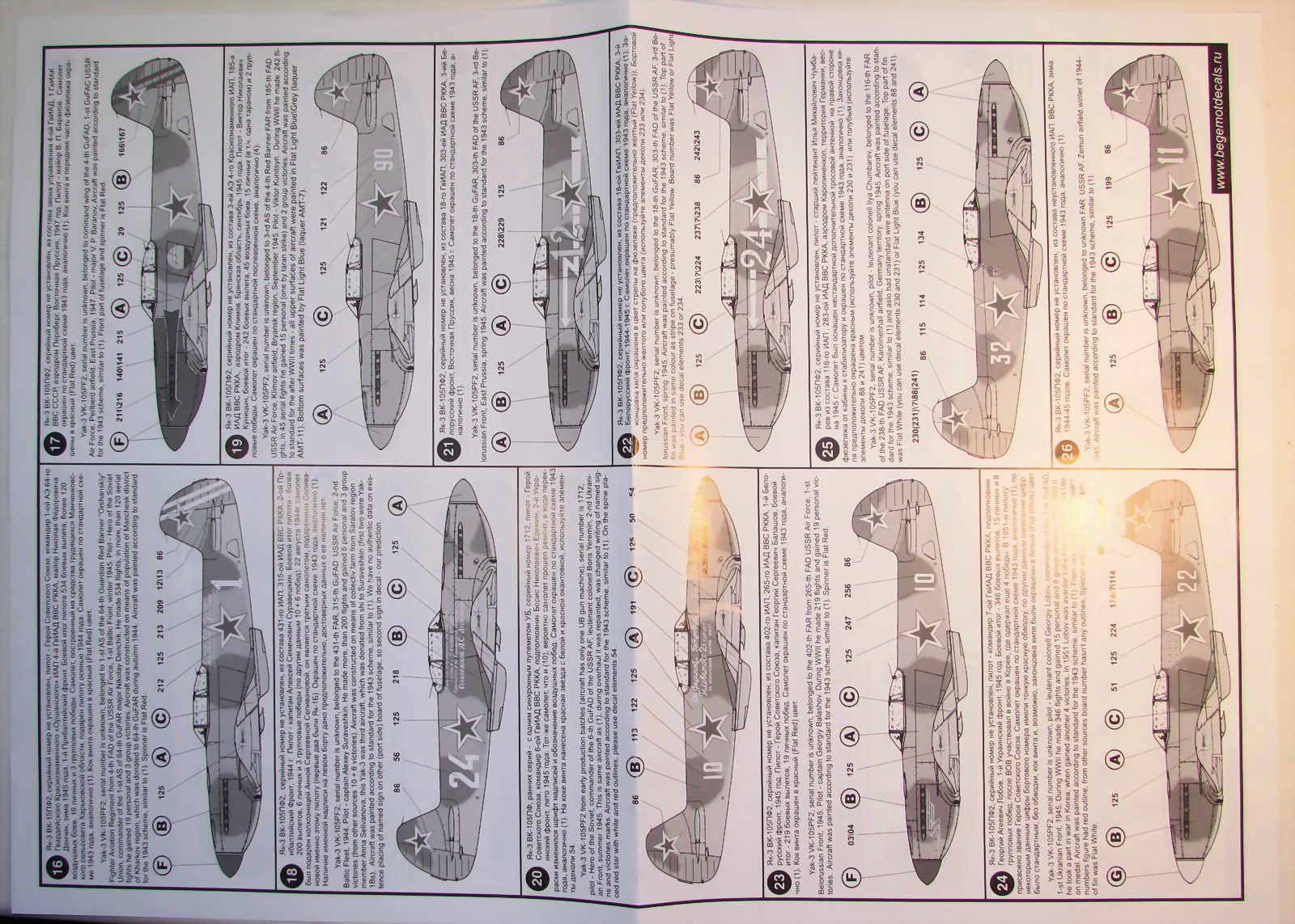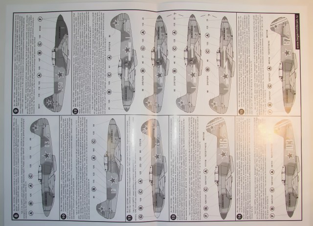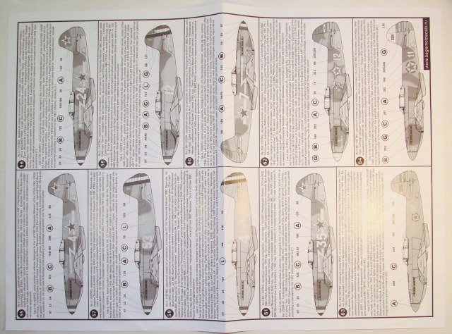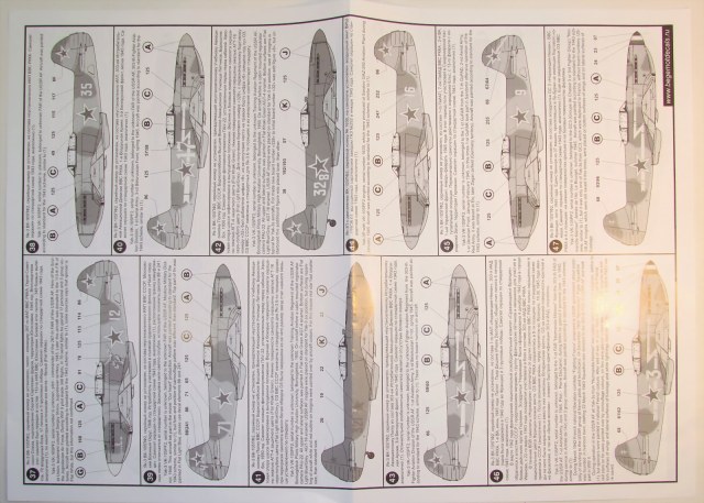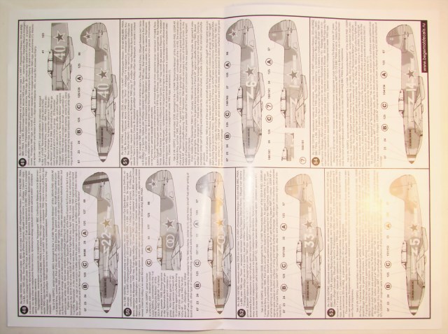 В прозрачном пакете два листа декалей, каждый чуть больше чем А4 и четыре листа глянцевой бумаги с двухсторонней печатью почти А2 размером с описанием. Вариантов самолётов аж 68 штук, проблема выбора стоит очень остро.