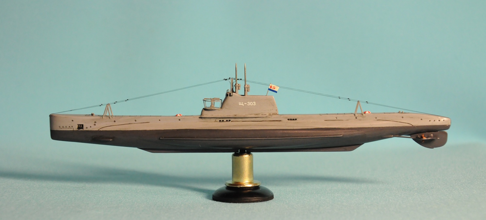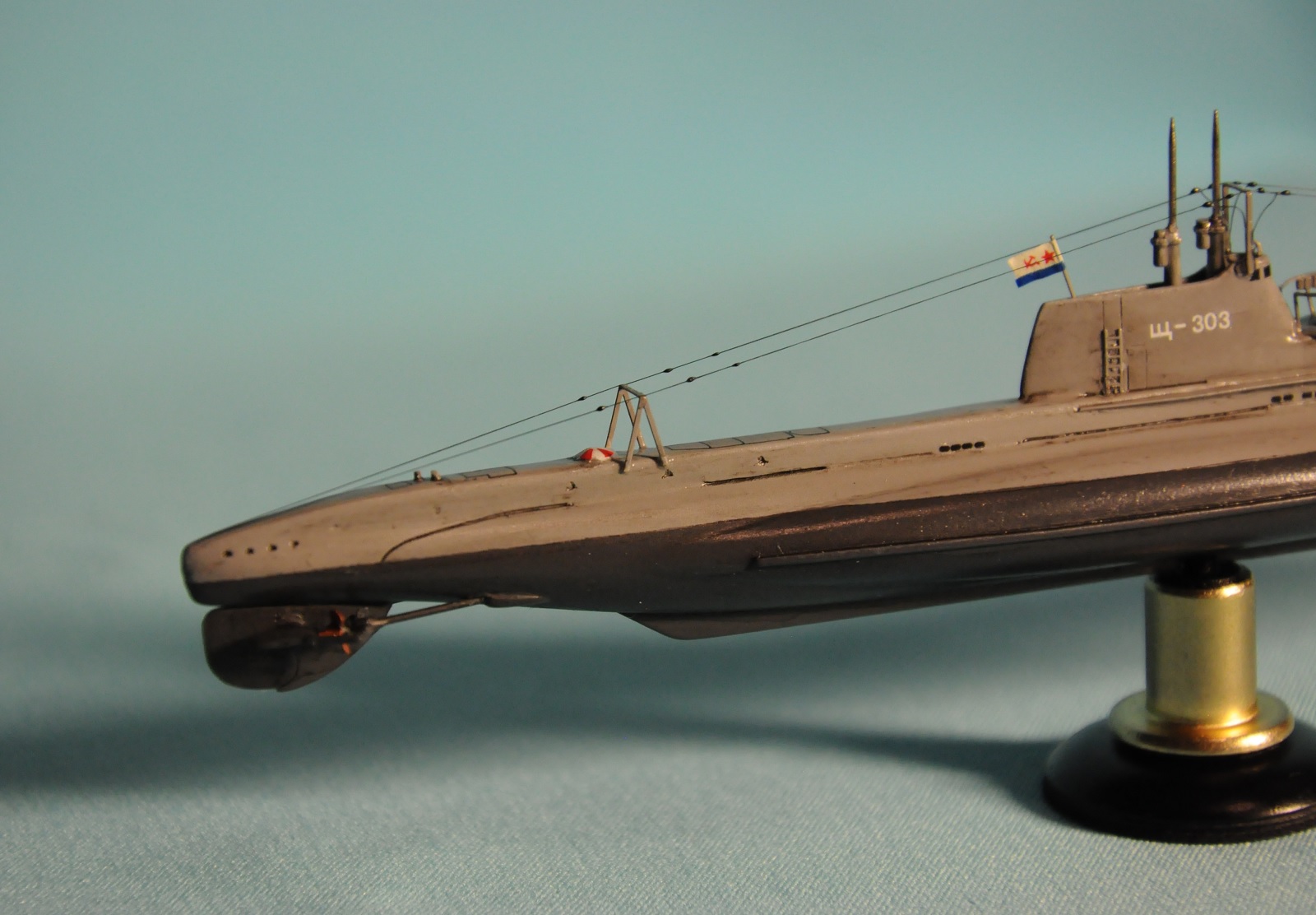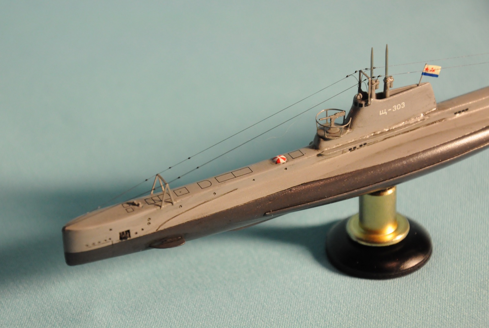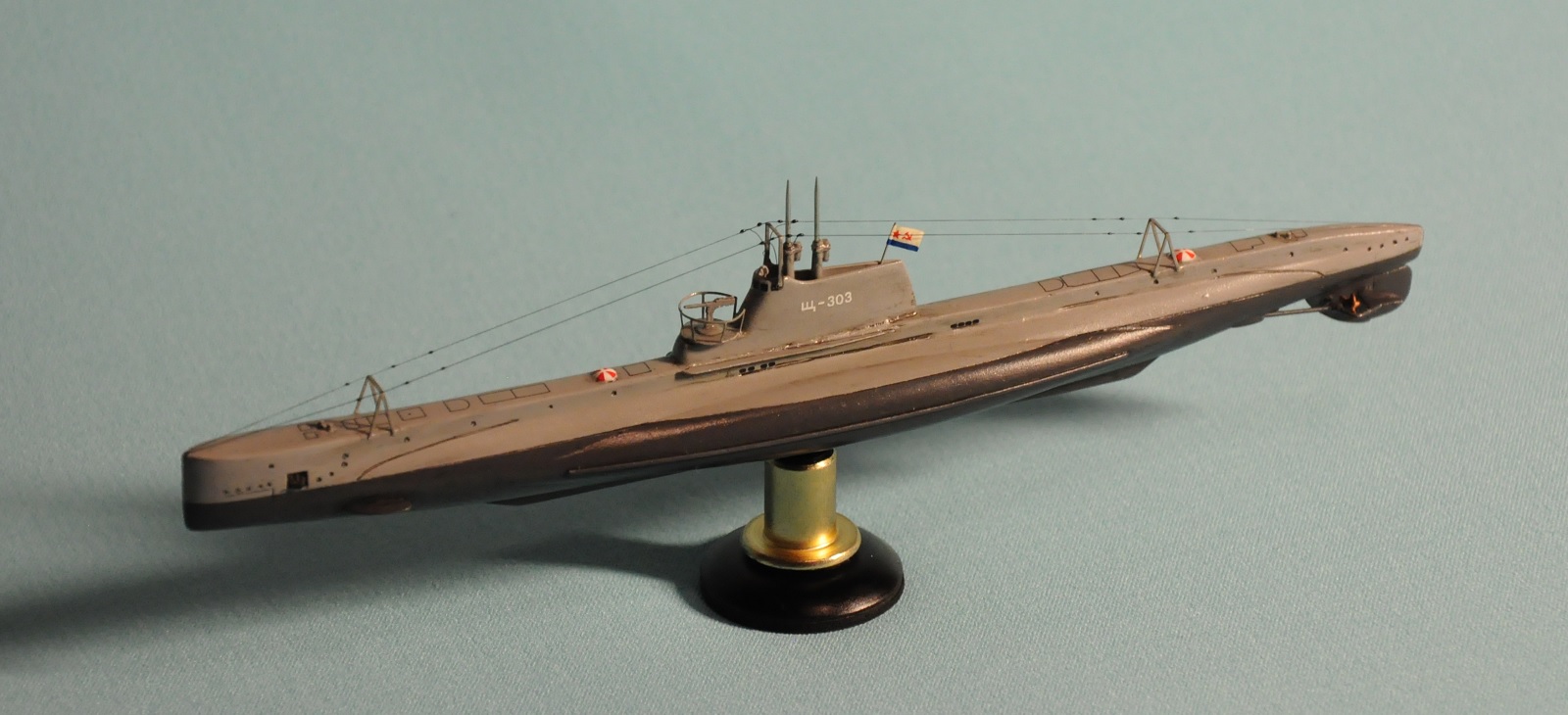 Модель производства фирмы MikroMir. Набор попался откровенно бракованный - был поврежден корпус лодки, не пролиты перископы, валы винтов. Их прошлось заменить на иглы. Краски и материалы в основном фирмы Tamiya, такелаж из спандекса. Декали - сборная солянка из декалей из комплекта лодки (палубные элементы и мелкие шпигаты), декалей от британского флота (номер), декалей от лодок Щ Х серии (звезда в цифрой на носу рубки) и декалей от немецкой лодки VII серии (флаг ВМС СССР). Фототравление из штатного комплекта, круговая антенна на рубке собрана из 2-х иллюминаторов. Во время стройки лодка пережила взрыв глубинной бомбы, часть утерянных ограждений винтов пришлось тоже заменить на проволоку. Подставка - самодел.