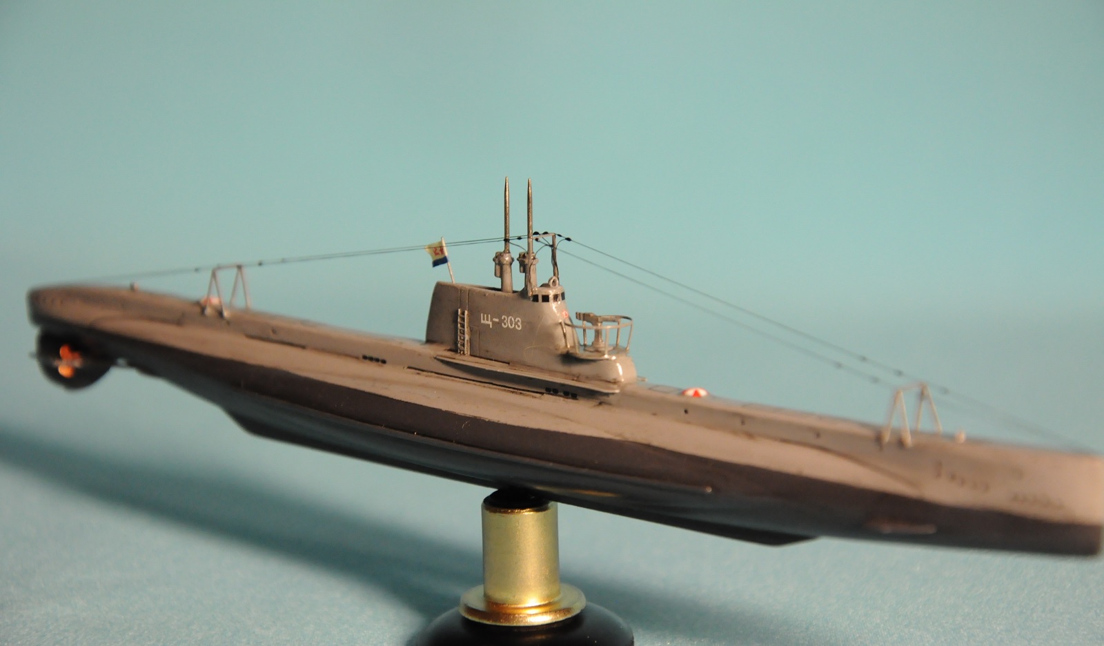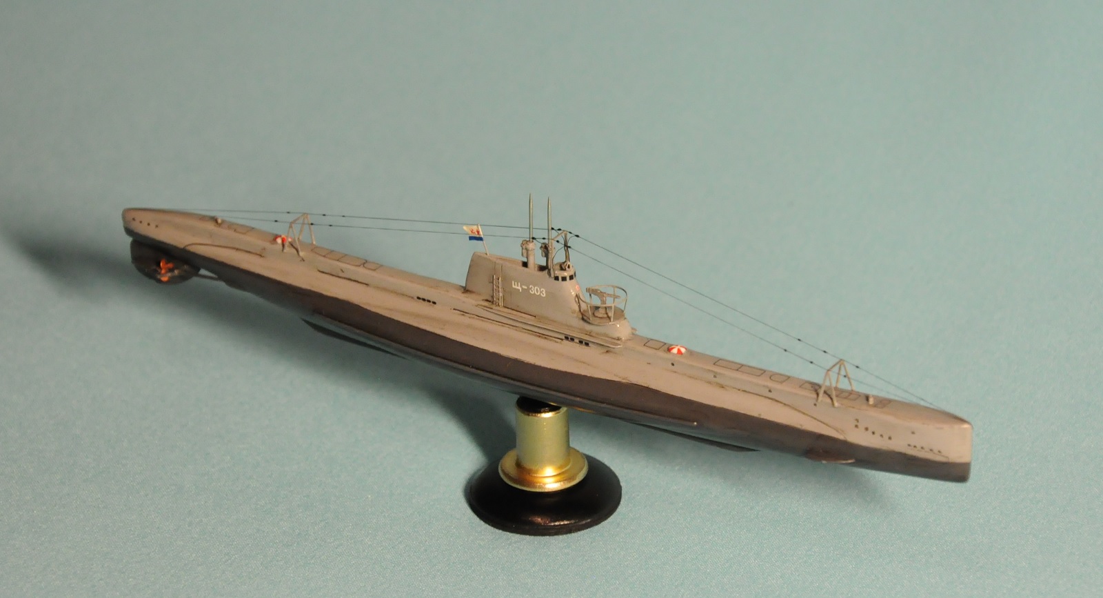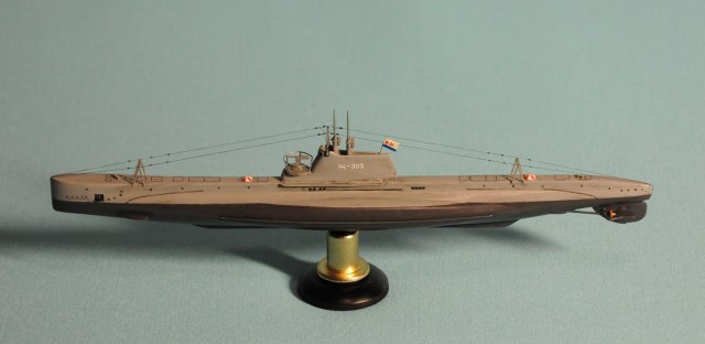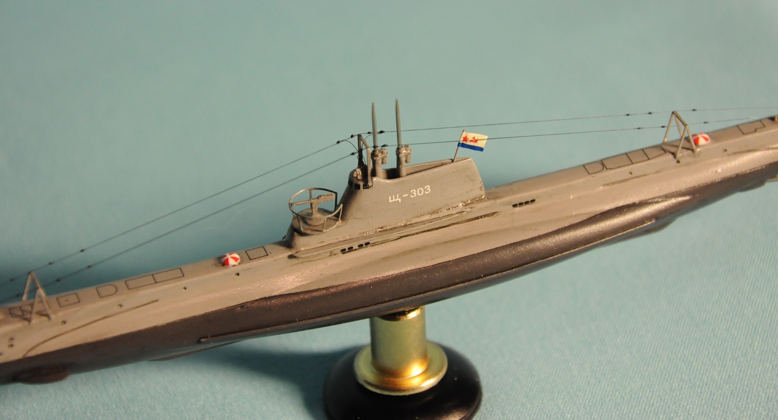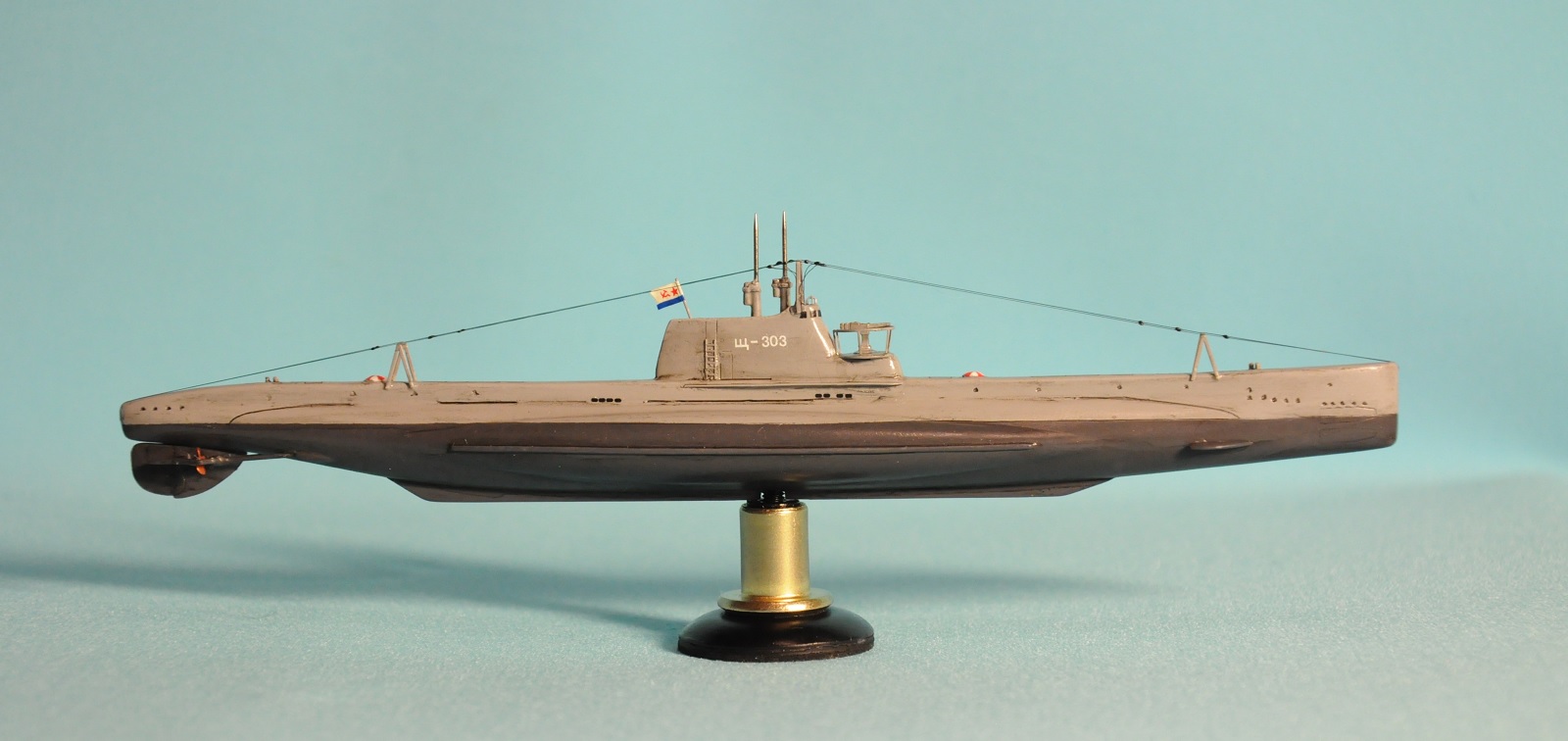Модель производства фирмы MikroMir. Набор попался откровенно бракованный - был поврежден корпус лодки, не пролиты перископы, валы винтов. Их прошлось заменить на иглы. Краски и материалы в основном фирмы Tamiya, такелаж из спандекса. Декали - сборная солянка из декалей из комплекта лодки (палубные элементы и мелкие шпигаты), декалей от британского флота (номер), декалей от лодок Щ Х серии (звезда в цифрой на носу рубки) и декалей от немецкой лодки VII серии (флаг ВМС СССР). Фототравление из штатного комплекта, круговая антенна на рубке собрана из 2-х иллюминаторов. Во время стройки лодка пережила взрыв глубинной бомбы, часть утерянных ограждений винтов пришлось тоже заменить на проволоку. Подставка - самодел.