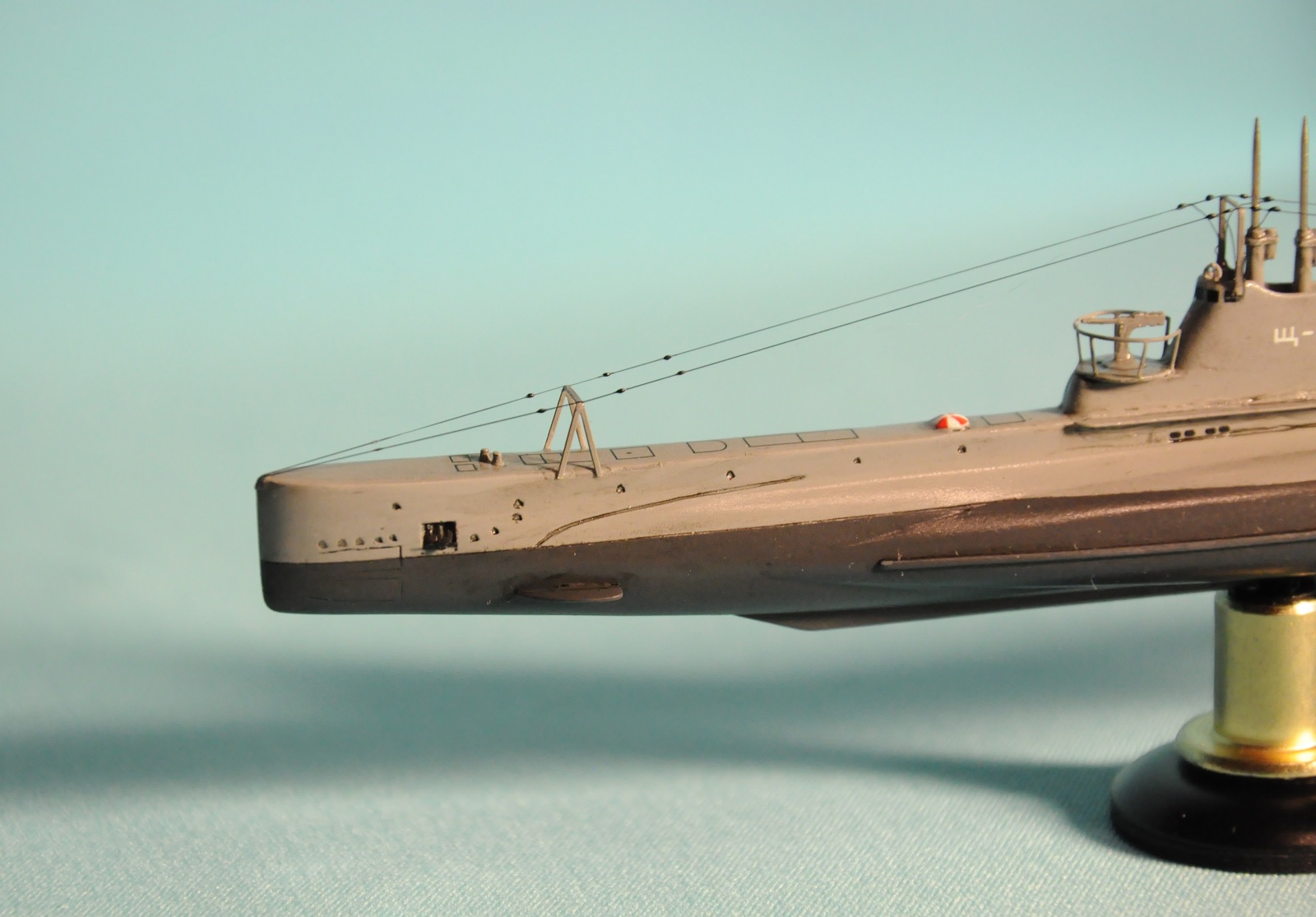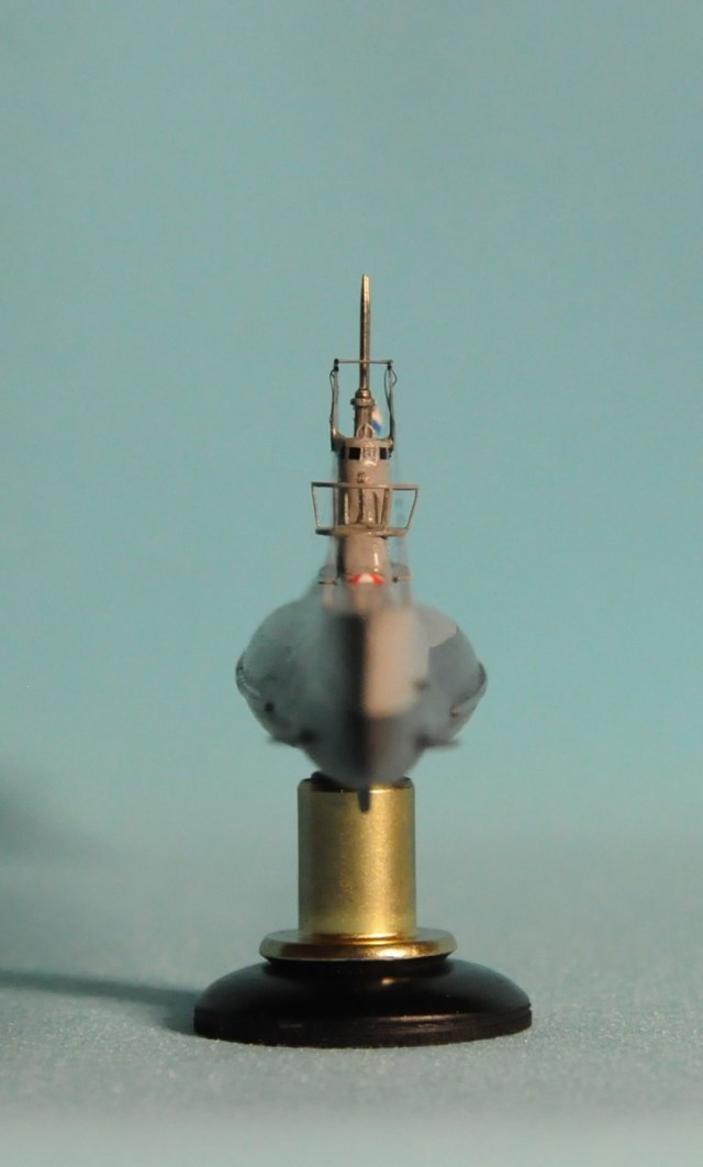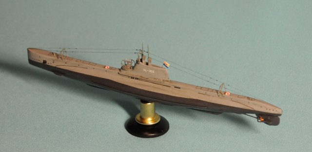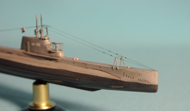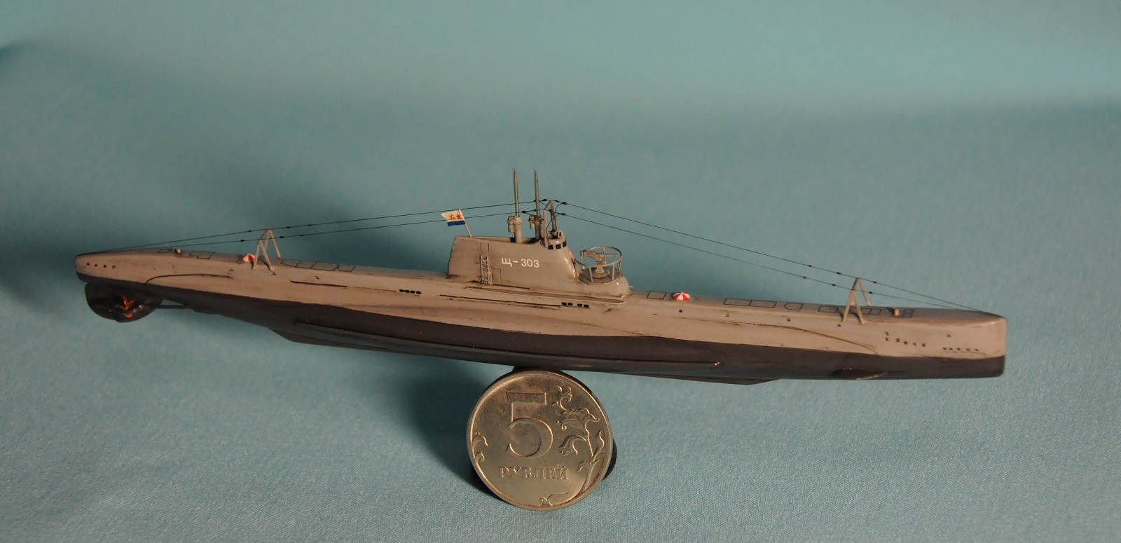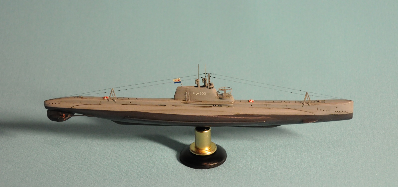 Модель производства фирмы MikroMir. Набор попался откровенно бракованный - был поврежден корпус лодки, не пролиты перископы, валы винтов. Их прошлось заменить на иглы. Краски и материалы в основном фирмы Tamiya, такелаж из спандекса. Декали - сборная солянка из декалей из комплекта лодки (палубные элементы и мелкие шпигаты), декалей от британского флота (номер), декалей от лодок Щ Х серии (звезда в цифрой на носу рубки) и декалей от немецкой лодки VII серии (флаг ВМС СССР). Фототравление из штатного комплекта, круговая антенна на рубке собрана из 2-х иллюминаторов. Во время стройки лодка пережила взрыв глубинной бомбы, часть утерянных ограждений винтов пришлось тоже заменить на проволоку. Подставка - самодел.