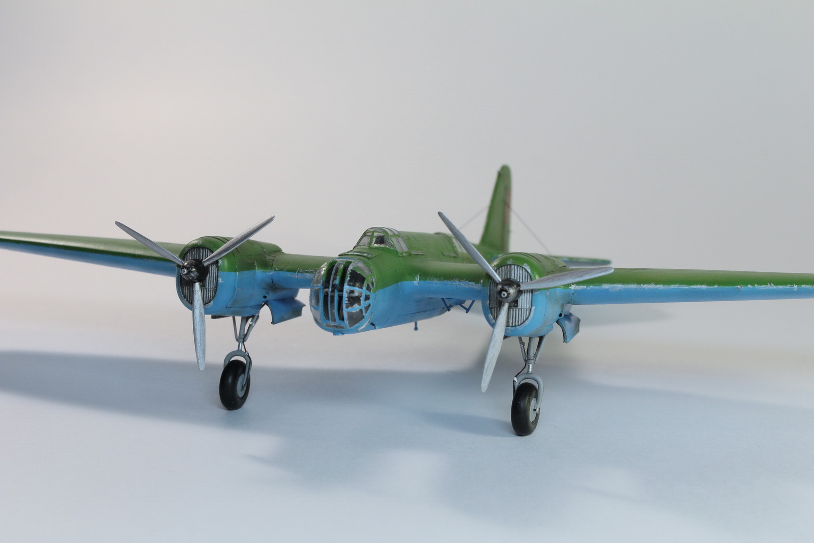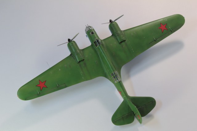 Неплохая модель! Интересно было взглянуть. Вот только зеленый кажется уж сильно натурально травяным. Таков ли был действительный оттенок? Если уж сделали бомбодержатели, хорошо бы и ФАБ-250 к ним подвесить. Повеселей было бы. Сам за этот СБ ещё не брался, поэтому судить не могу. ОЗ на крыльях, поближе бы к передней кромке сдвинуть, но это уже не поправимо.