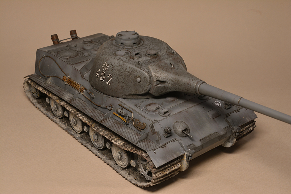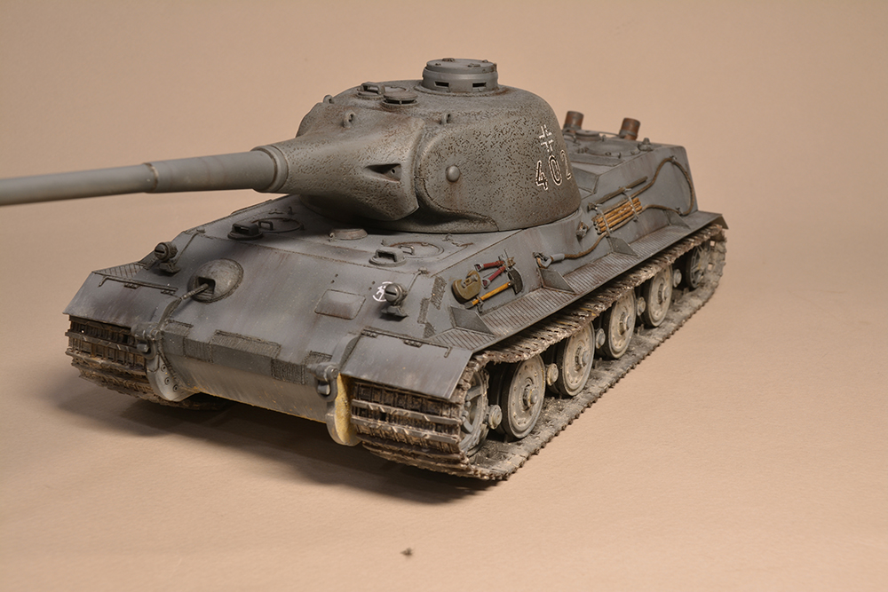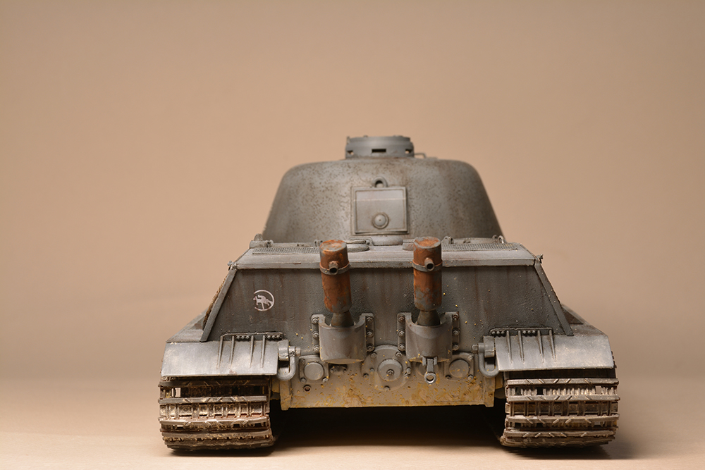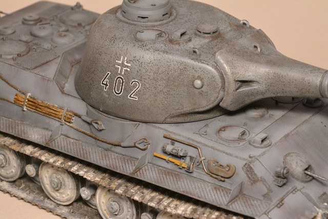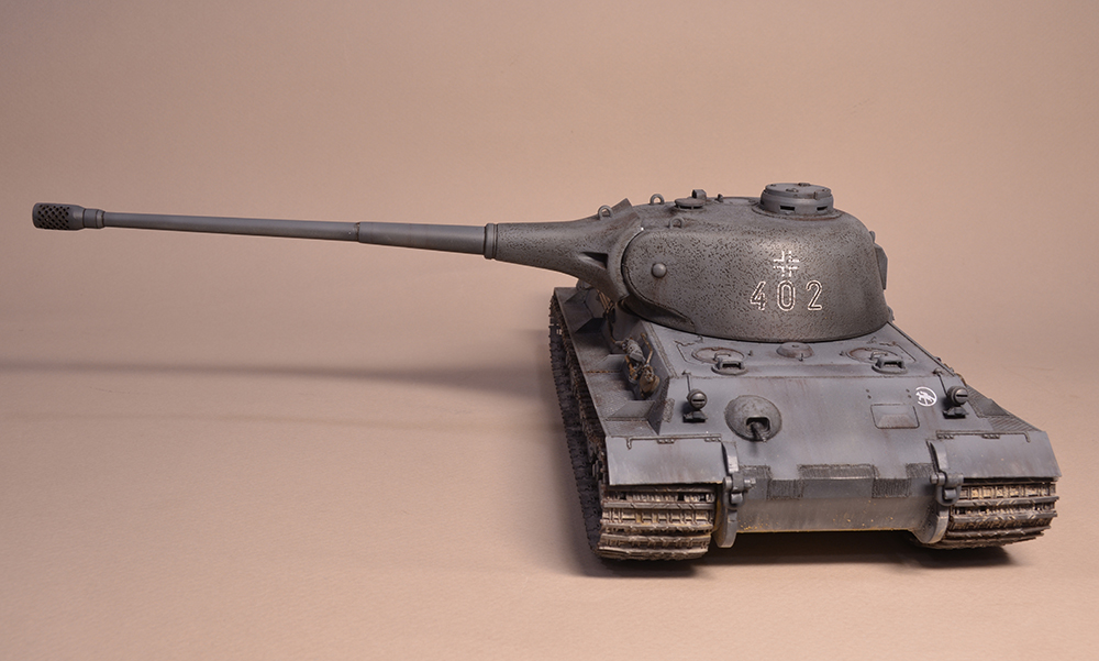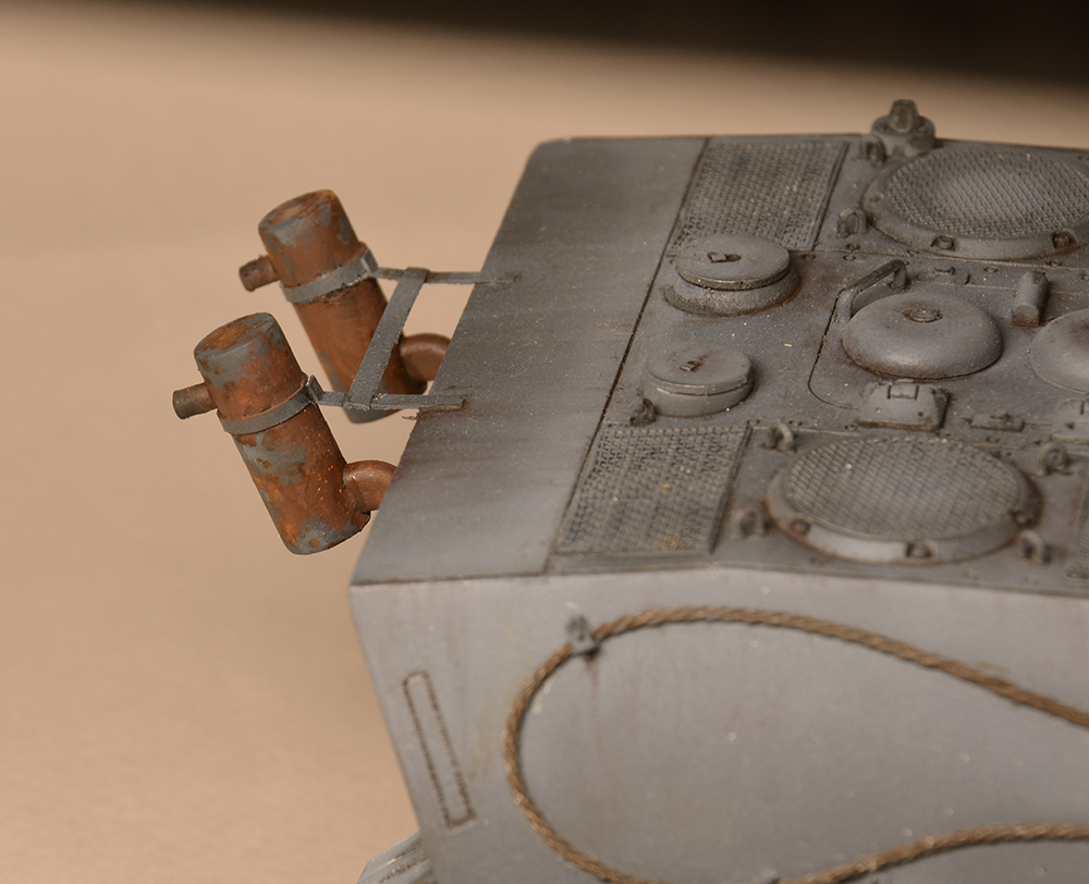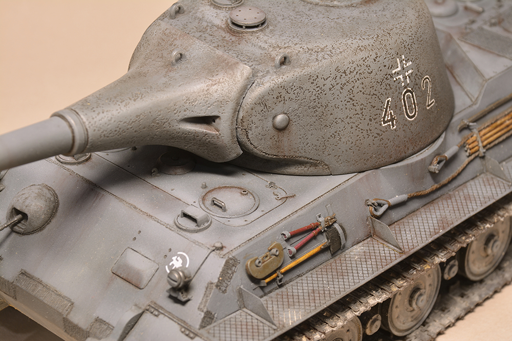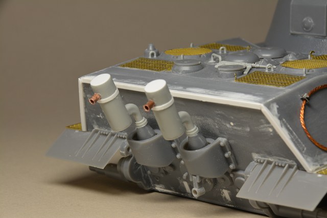 Что мне не понравилось - так это глушители. Получилось не логично, они смысла не имеют. Это и не искропламегаситель как у "Пантеры", и... если б хотели трубы прикрыть, чтоб в ночи не светились - прикрыли бы кожухами, проще и эффективней. По ком.башенке и её сочетанию с другими элементами вышло забавно: классная идея, показать раннюю ком.башенку, вроде как на ранних "пантерах". Да вот только такая шаровая установка появилась всё на тех же "пантерах", но позднее этой ком.башенки, и даже ещё позднее, чем новая привычная нам литая командирская башенка Ausf.A и G. Что на будущее с модели этого танка я бы убирал - это непонятные бляшки на маске орудия.