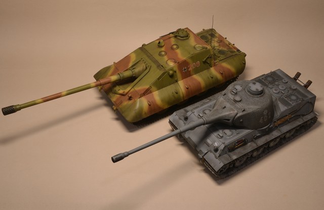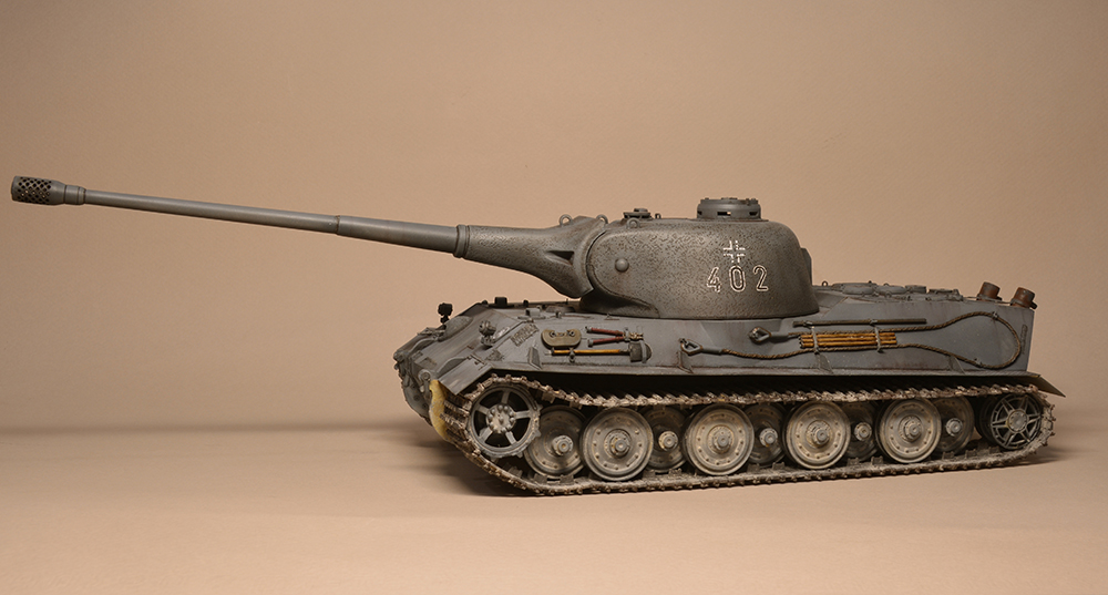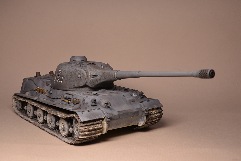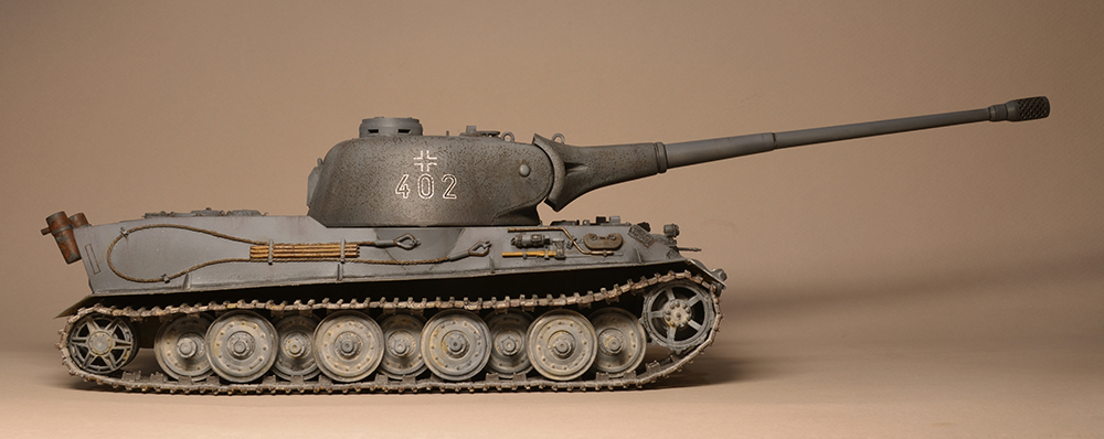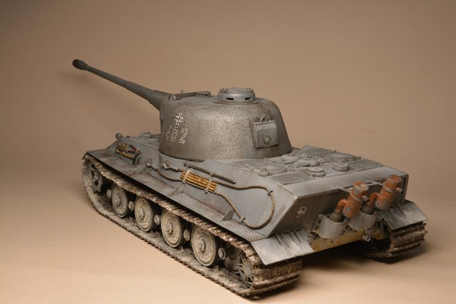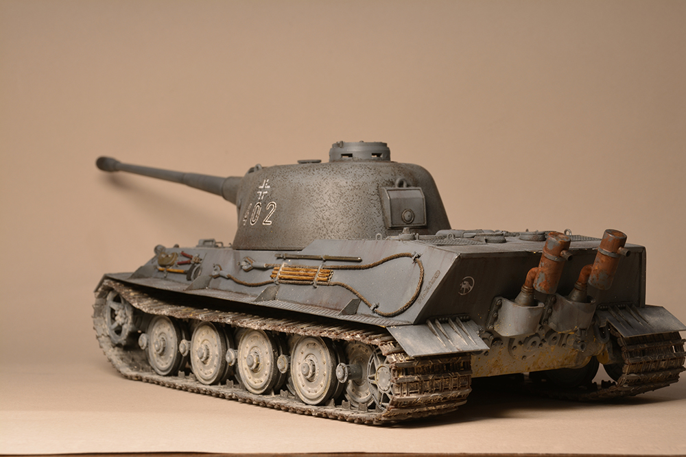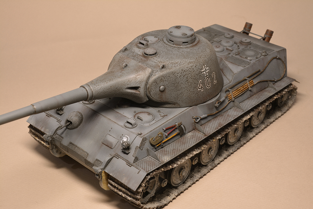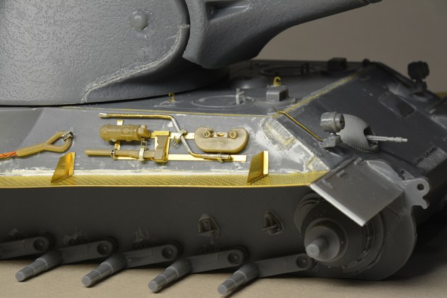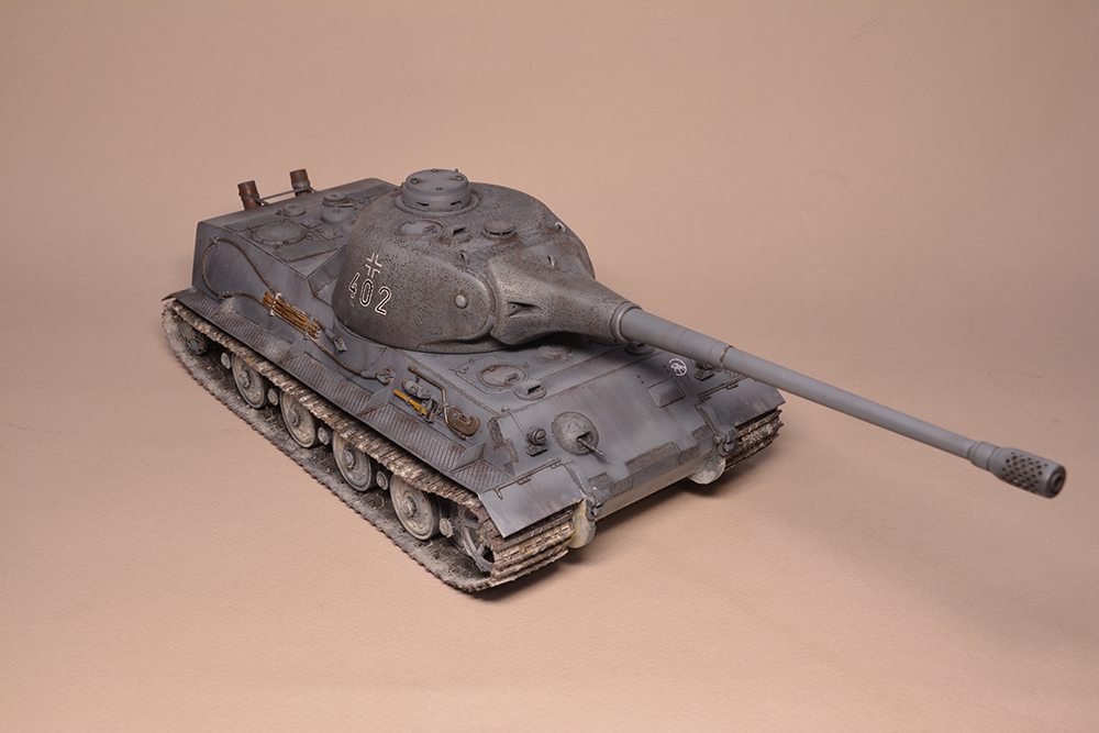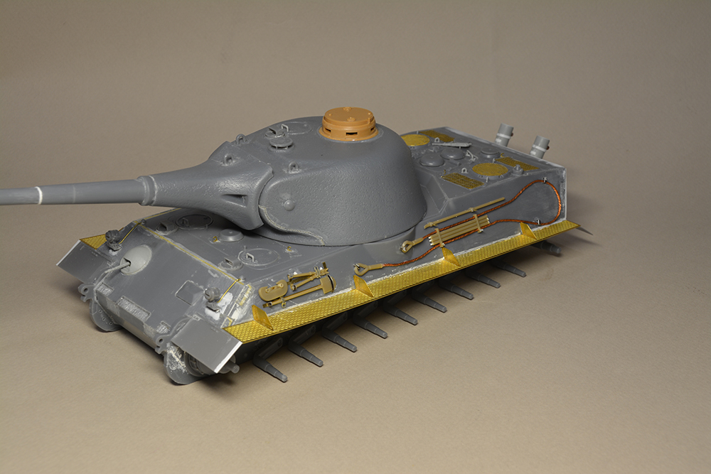 Что мне не понравилось - так это глушители. Получилось не логично, они смысла не имеют. Это и не искропламегаситель как у "Пантеры", и... если б хотели трубы прикрыть, чтоб в ночи не светились - прикрыли бы кожухами, проще и эффективней. По ком.башенке и её сочетанию с другими элементами вышло забавно: классная идея, показать раннюю ком.башенку, вроде как на ранних "пантерах". Да вот только такая шаровая установка появилась всё на тех же "пантерах", но позднее этой ком.башенки, и даже ещё позднее, чем новая привычная нам литая командирская башенка Ausf.A и G. Что на будущее с модели этого танка я бы убирал - это непонятные бляшки на маске орудия.