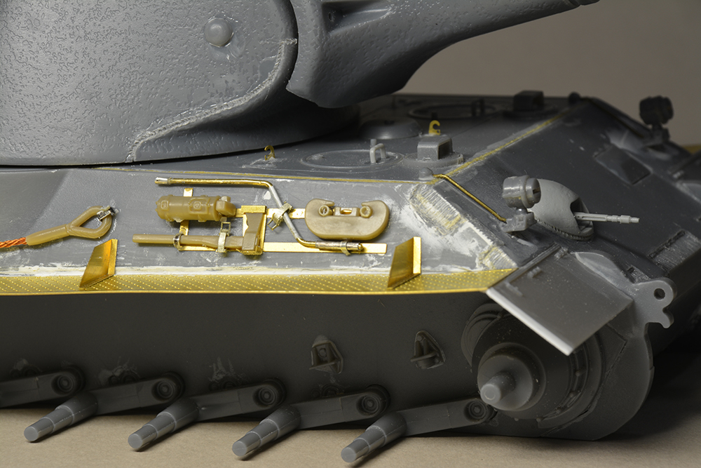 Танк получил почти собранным с кучей косяков, прилично облитый клеем, по этому все что можно разобрал и собрал по новой) сдеал несколько швов, изменил стык ВЛД, НЛД, переделал стык кормы и плиты мто, поменял комбашню на соответствующую 1942г., сплел тросы, поставил травленые рамки для шанца, изменил выхлоп, рассверлил ужасный дульник, в общем пилил больше чем обычно, но эту модель можно пилить просто без остановки) нелогичных вещей хватает.