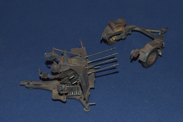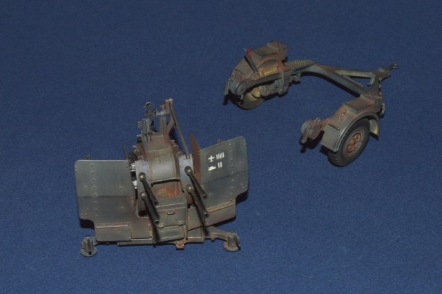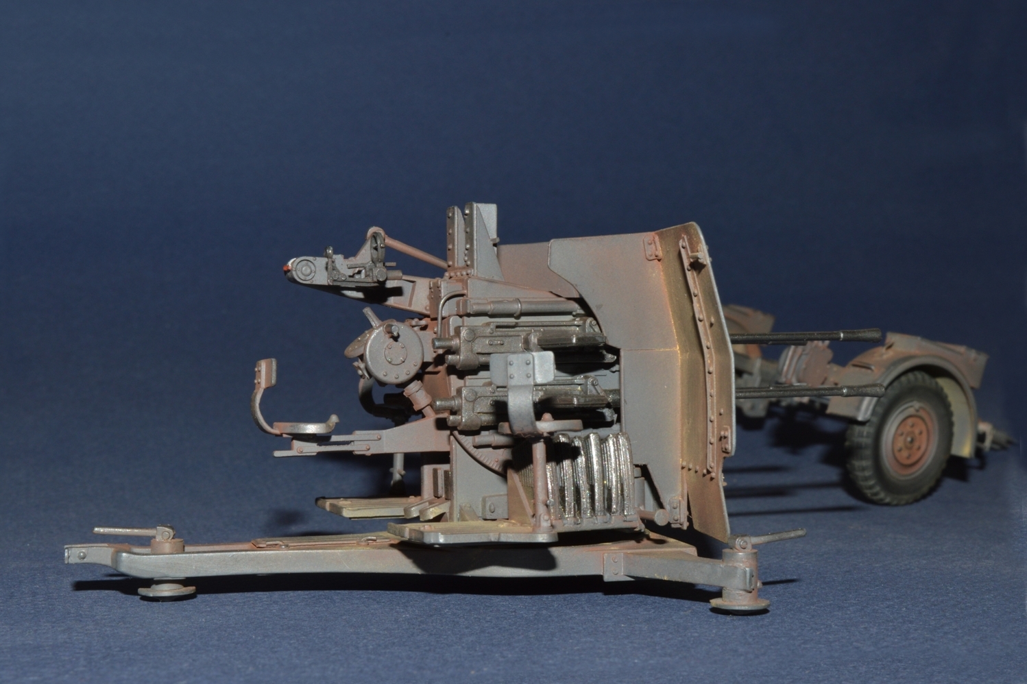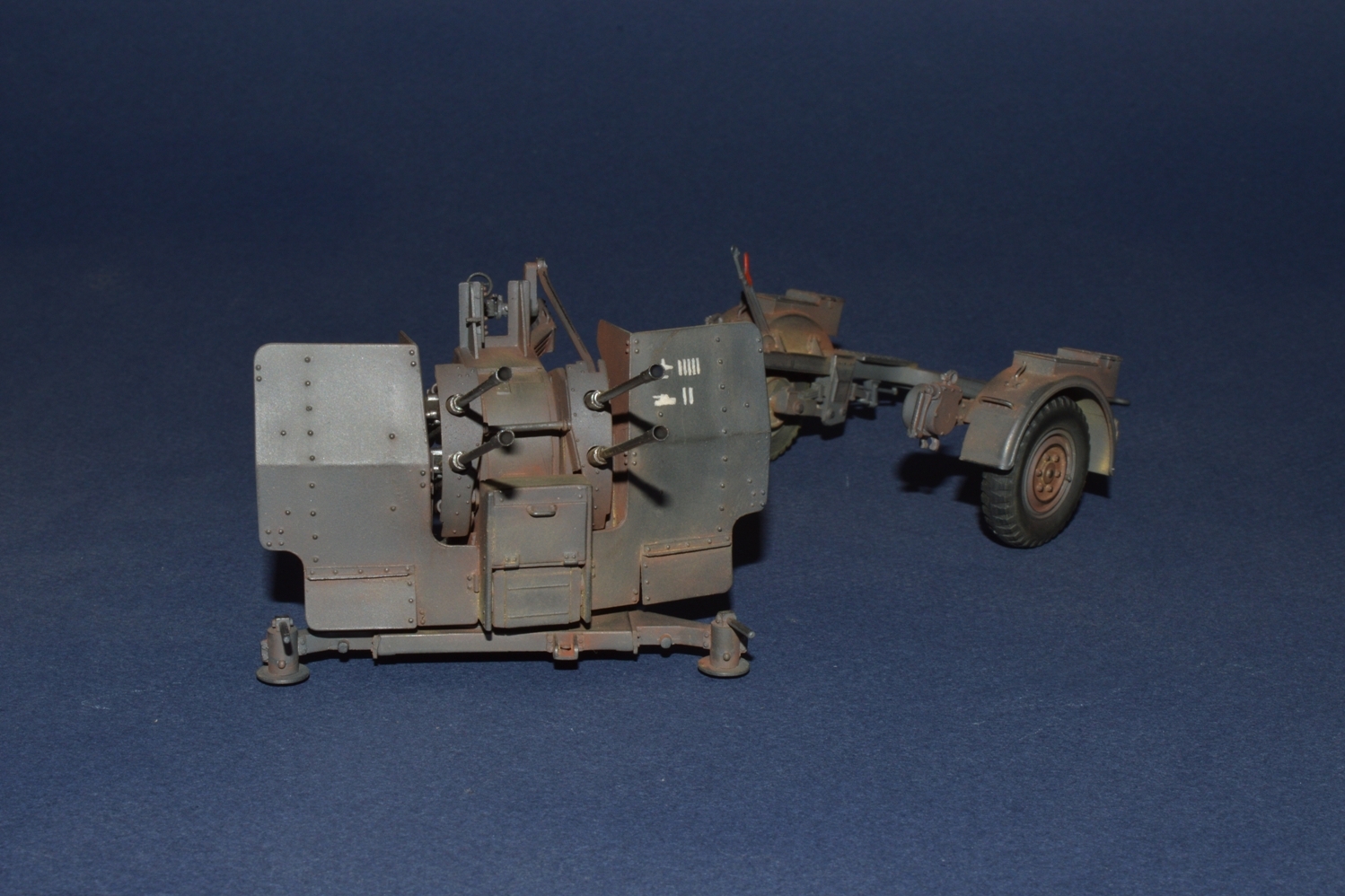 Эта зенитка охраняла портовые военные склады в Гамбурге, там море, соленый воздух. Рыжий налет на краске, это тот тип ржавчины, который образуется не только на металле, но и на окрашенных поверхностях и почти полностью удаляется при протирке масляной ветошью. И ещё, вероятно, красноватая пыль, принесенная ветром с прибрежных шхер.