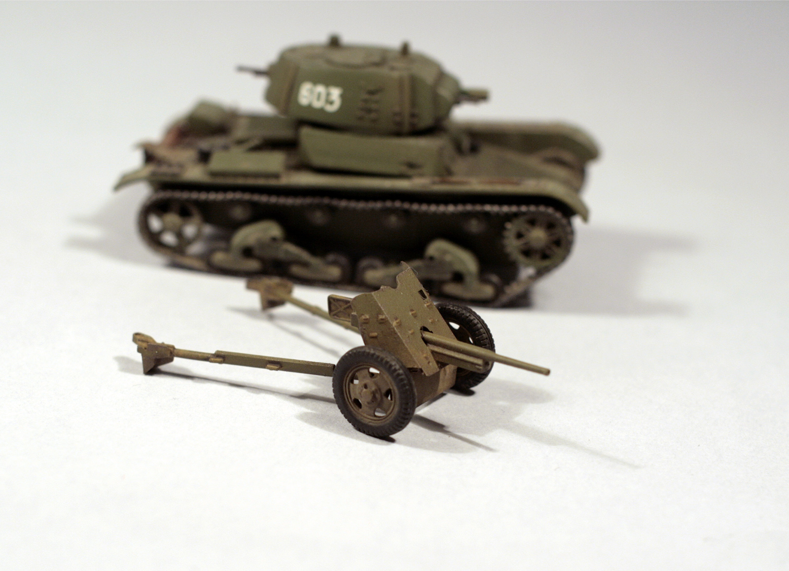 Прототип пушки увидел свет в конце 30ых годов и являлся дальнейшим развитием 37мм противотанковой пушки, разработанный на базе немецкого орудия. Орудие активно использовалось в первый этап войны, когда его бронепробиваемости было достаточно. Были в боекомплекте и противопехотные осколочные снаряды и картечь. В 43 году это орудие, утратившее свою роль, сняли с производства. Подробнее - на Вики.