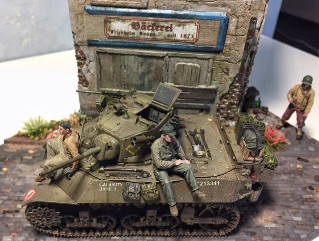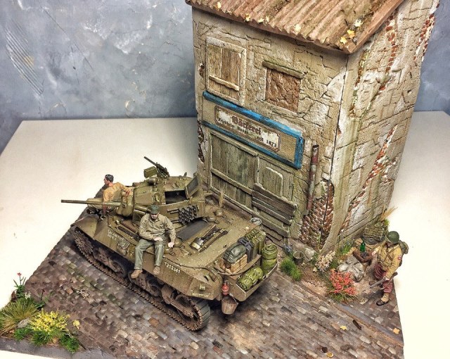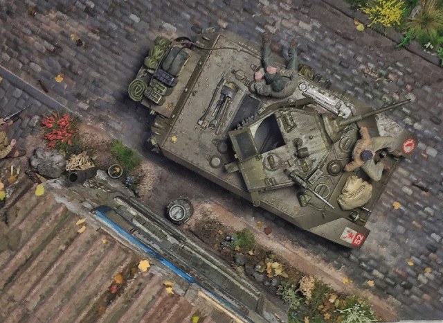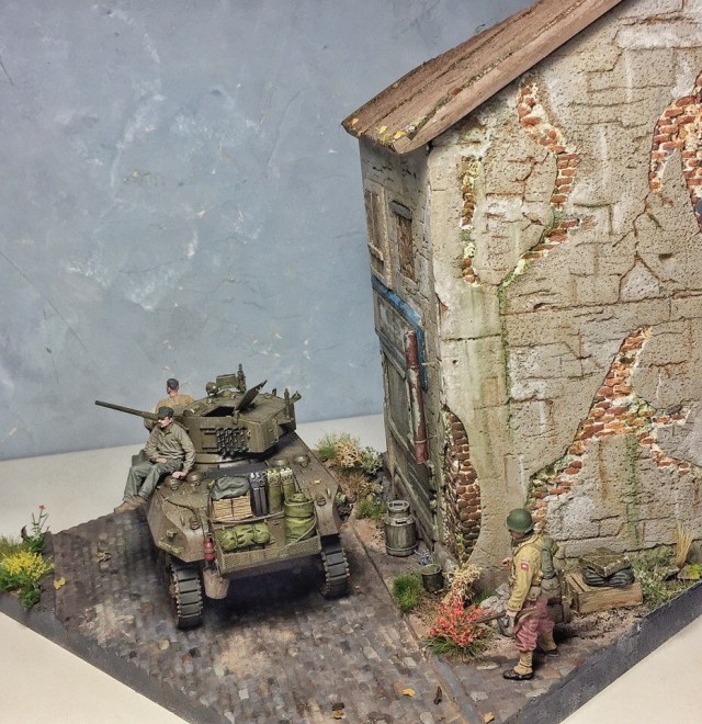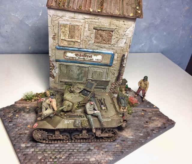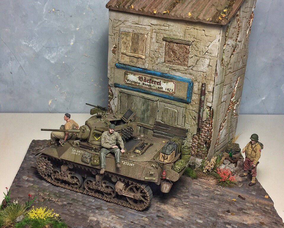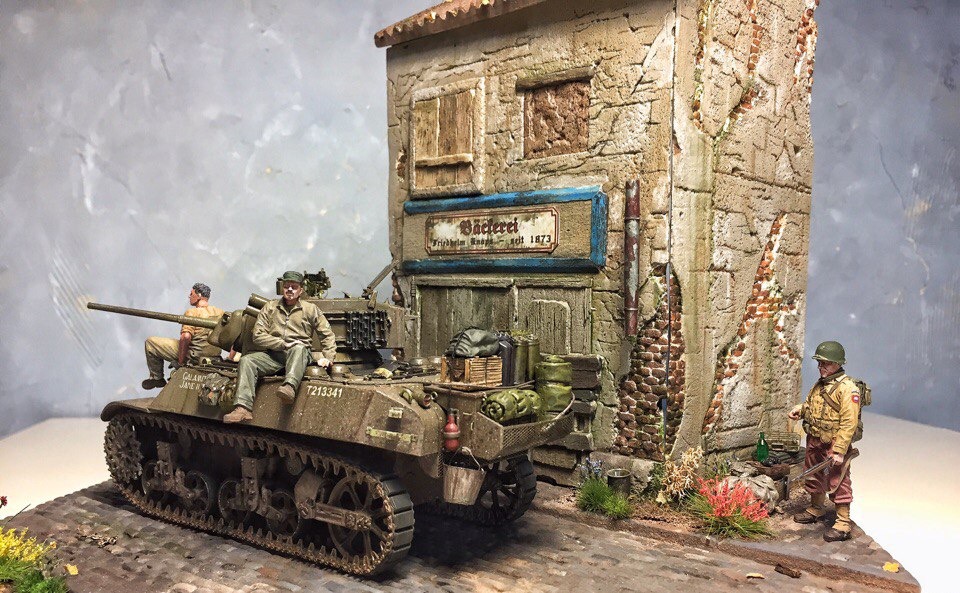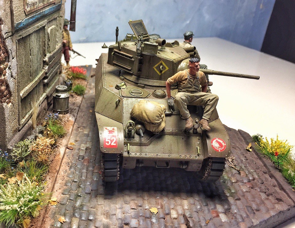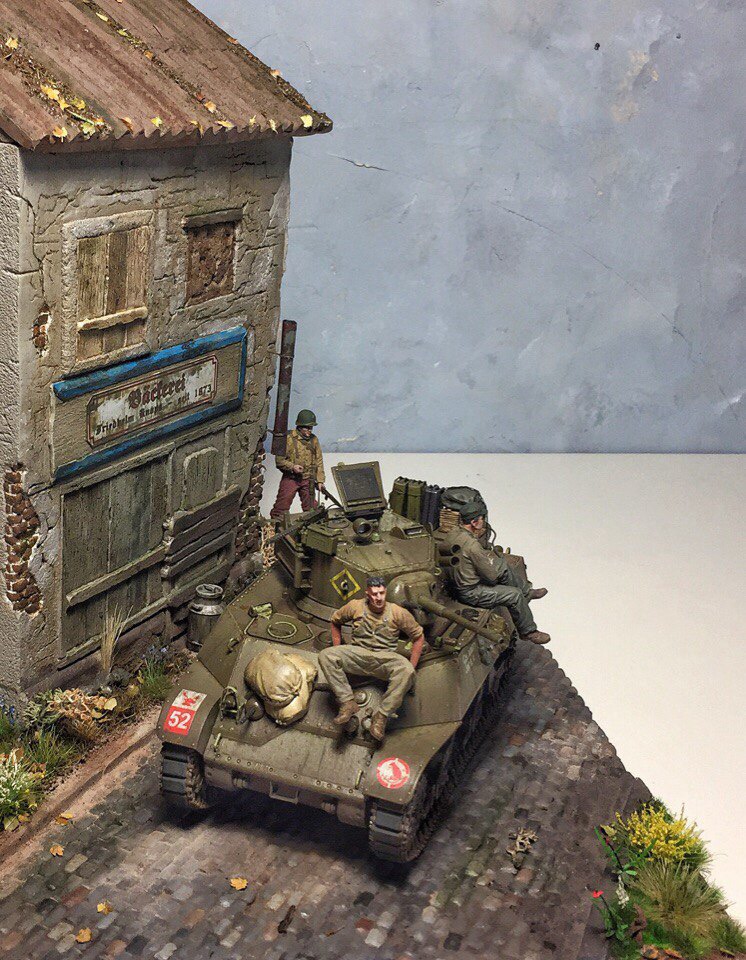 Доброго времени суток, коллеги. Представляю Вашему вниманию первую в жизни диораму. Диорама строилась ~ полгода. Главным помощником является фирма modellers of fortunes - зелень, листики, цветочки, а главное, подставка со стеной. Танк от AFVClub, фигурки - bravo6 и minisoldiers. Здание красилось аэрографом краской Tamiya, остальные мелочи и кирпичики - ak interactive.