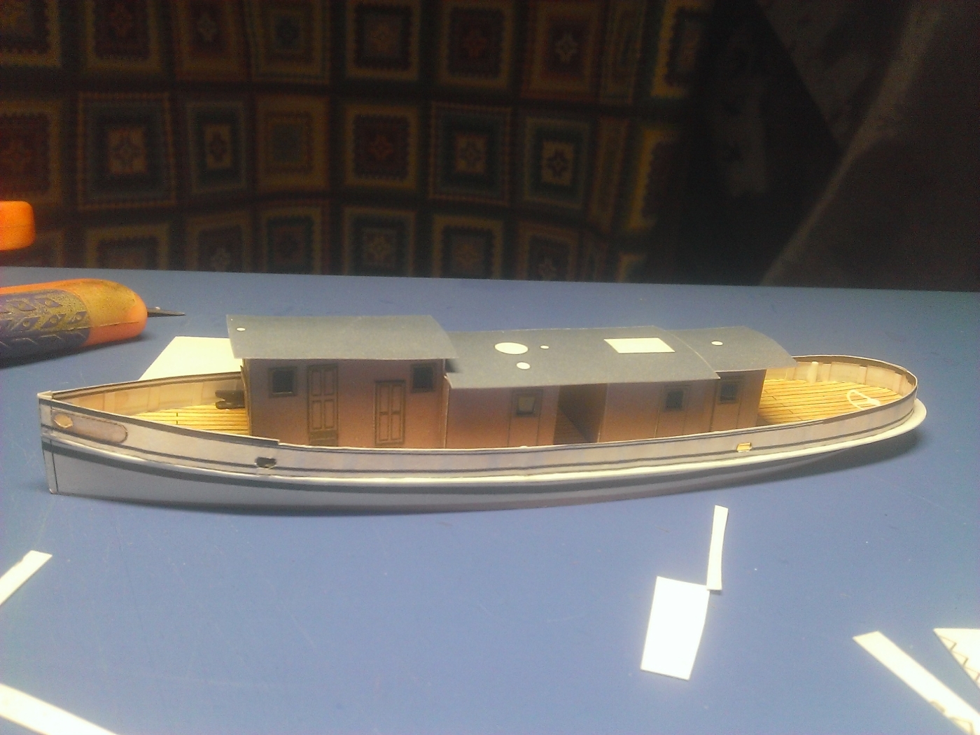 Каркас собирался из миллиметрового пластика (с картоном у меня не ладится - ведёт), заклейка пенопластом, шкурение, шпатлевание и снова шкурение. Палубу разрисовывал сам в фотошопе. дальше оклейка бумагой и сборка бымажных деталей. С телами кручения малых диаметров у меня пока не ладится (с бумагой вожусь год) поэтому на трубу использовал трубку от чупа-чупса, дефлекторы из закромов а шлюпбалки пластинка-фиксатор с пакета с хлебом.