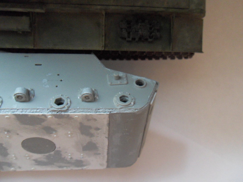 надо учитывать при этом что влд со ступенькой.Бортовые кронштейны.Уменьшена толщина и форма окон,наружные законцовки по фото.Задняя часть крыльев удлинена, она должна выступать за торец бортового листа на корме примерно на 4мм.Сверху и снизу гайки с шайбами и болты МК. Запасные траки.Сделаны кронштейны с травлеными барашками.