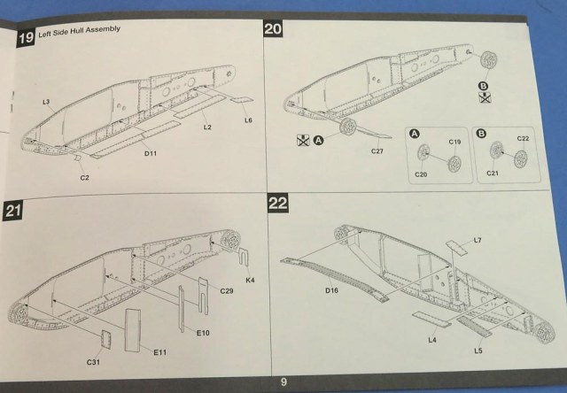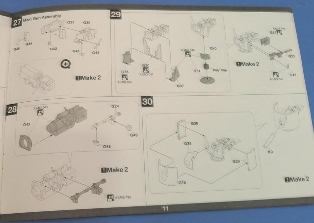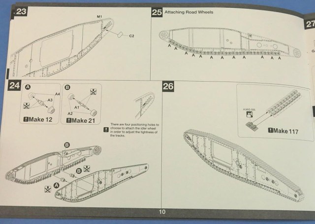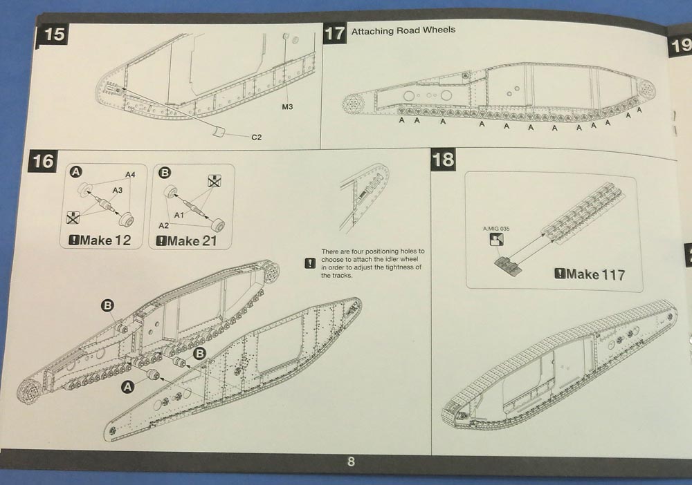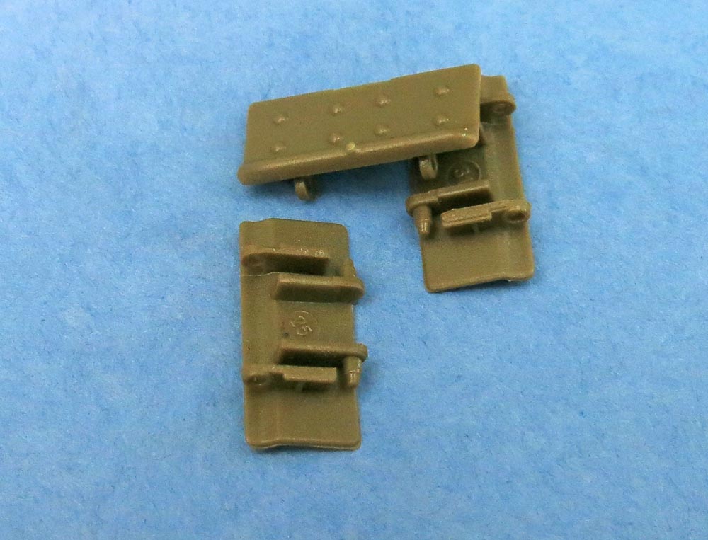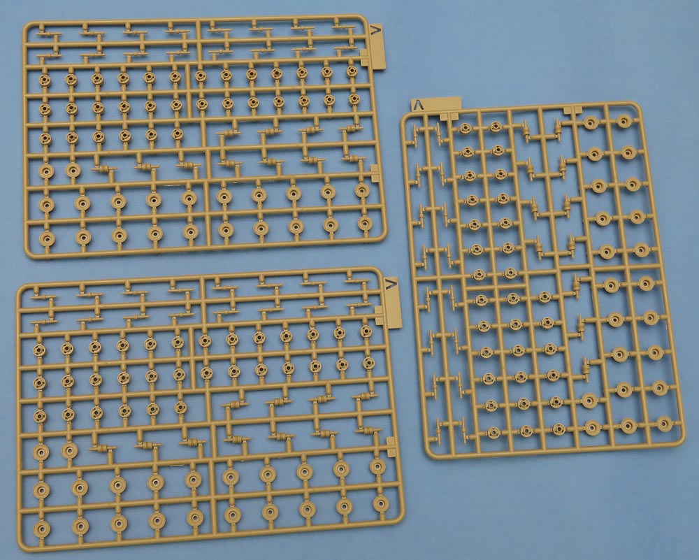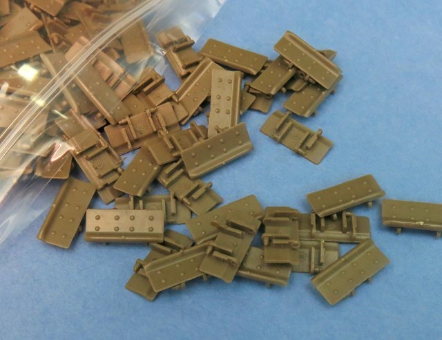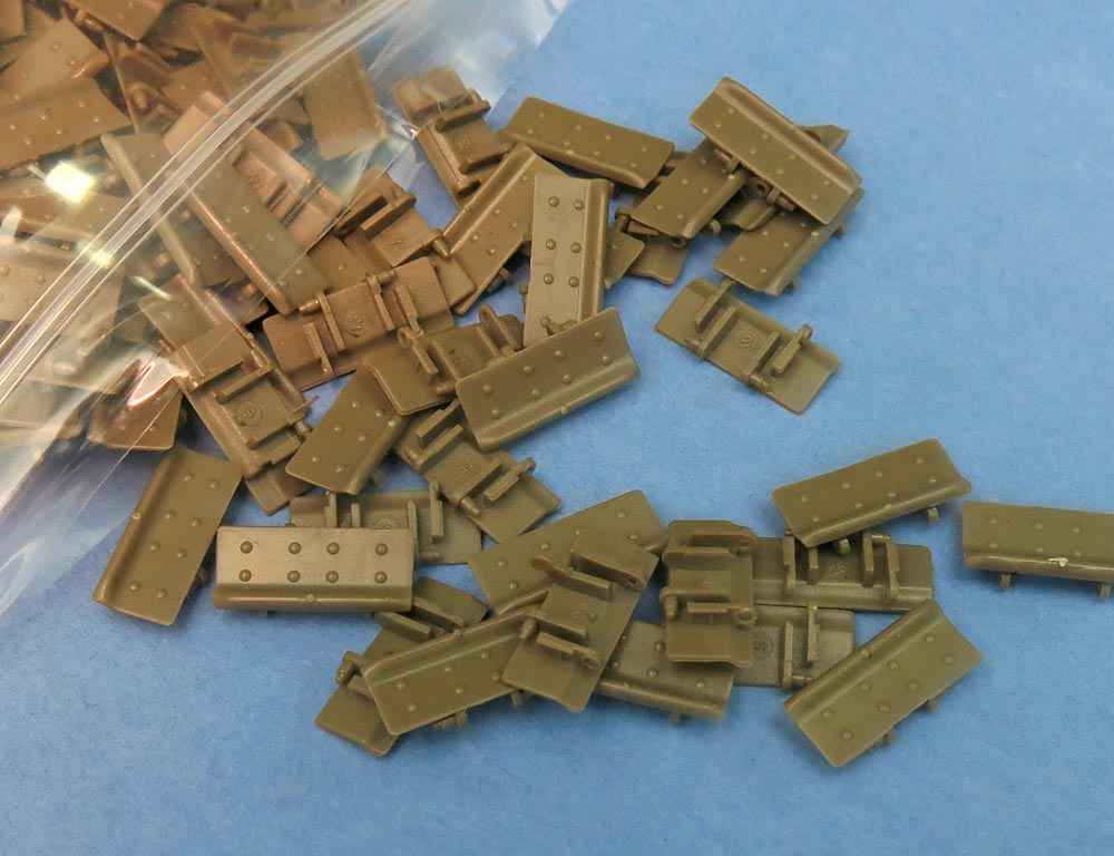 Отдельные пакетик с траками. Траков по инструкции 240 штук. Я не пересчитывал. Отлиты хорошо - требуют самый мизер обработки и очень классно стыкуются в ленту - собрал кусочек не отрываясь от фотографирования вообще;))