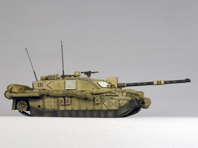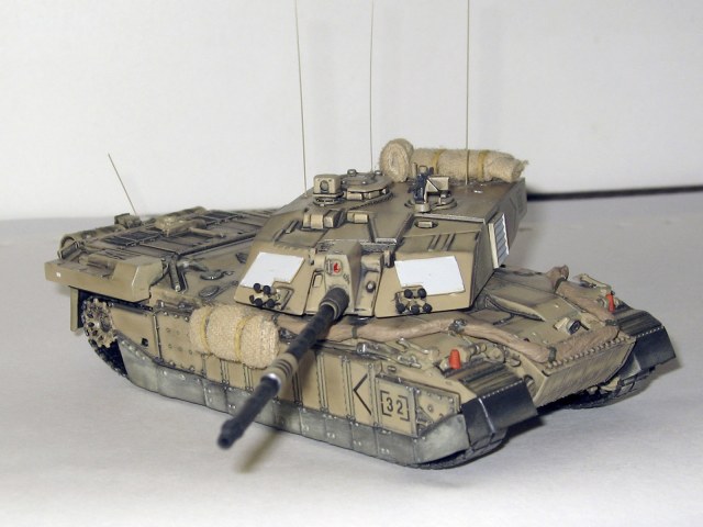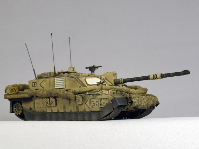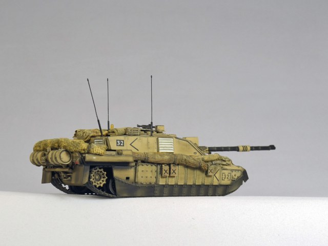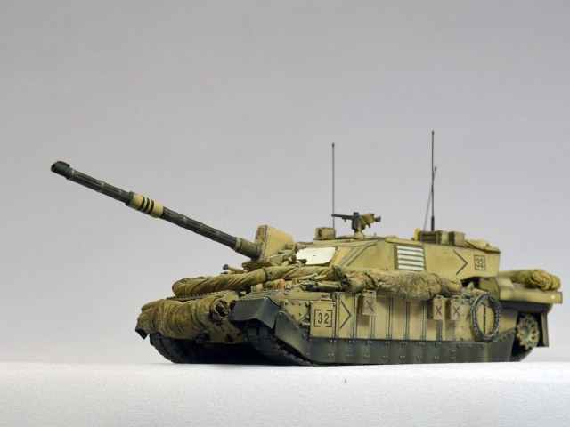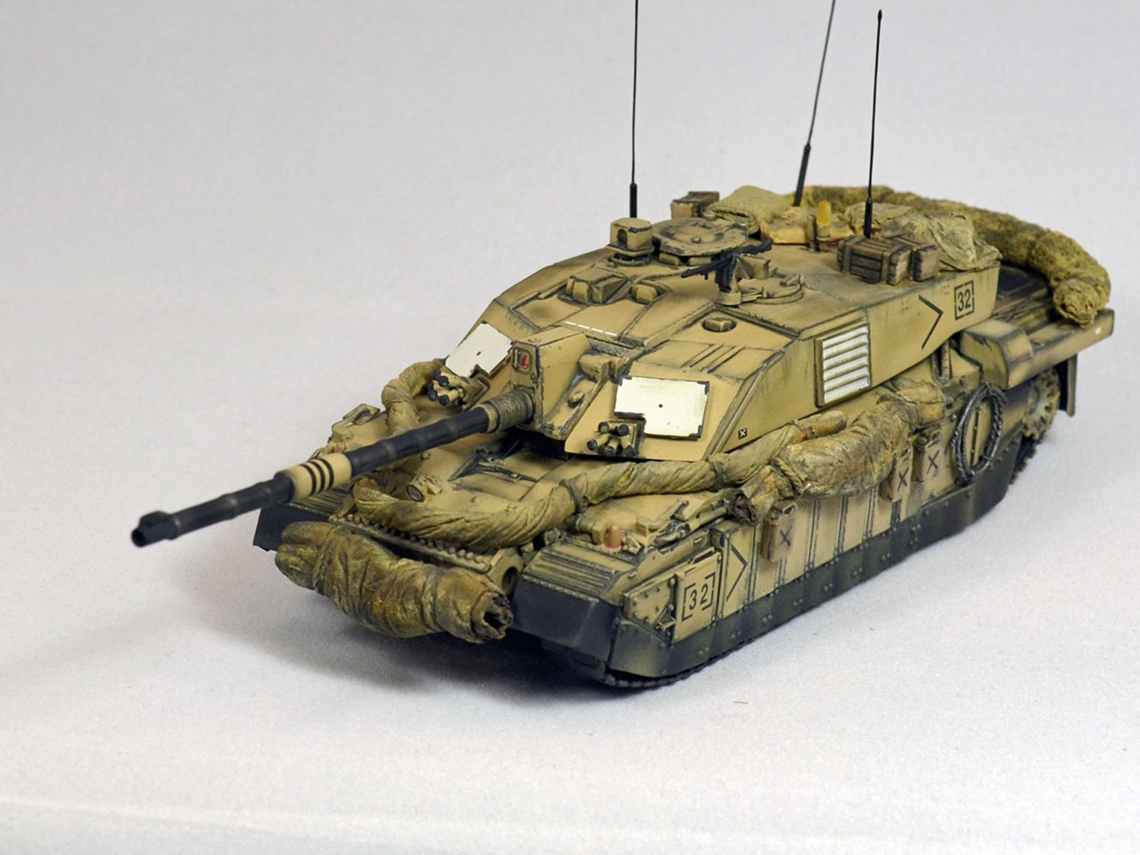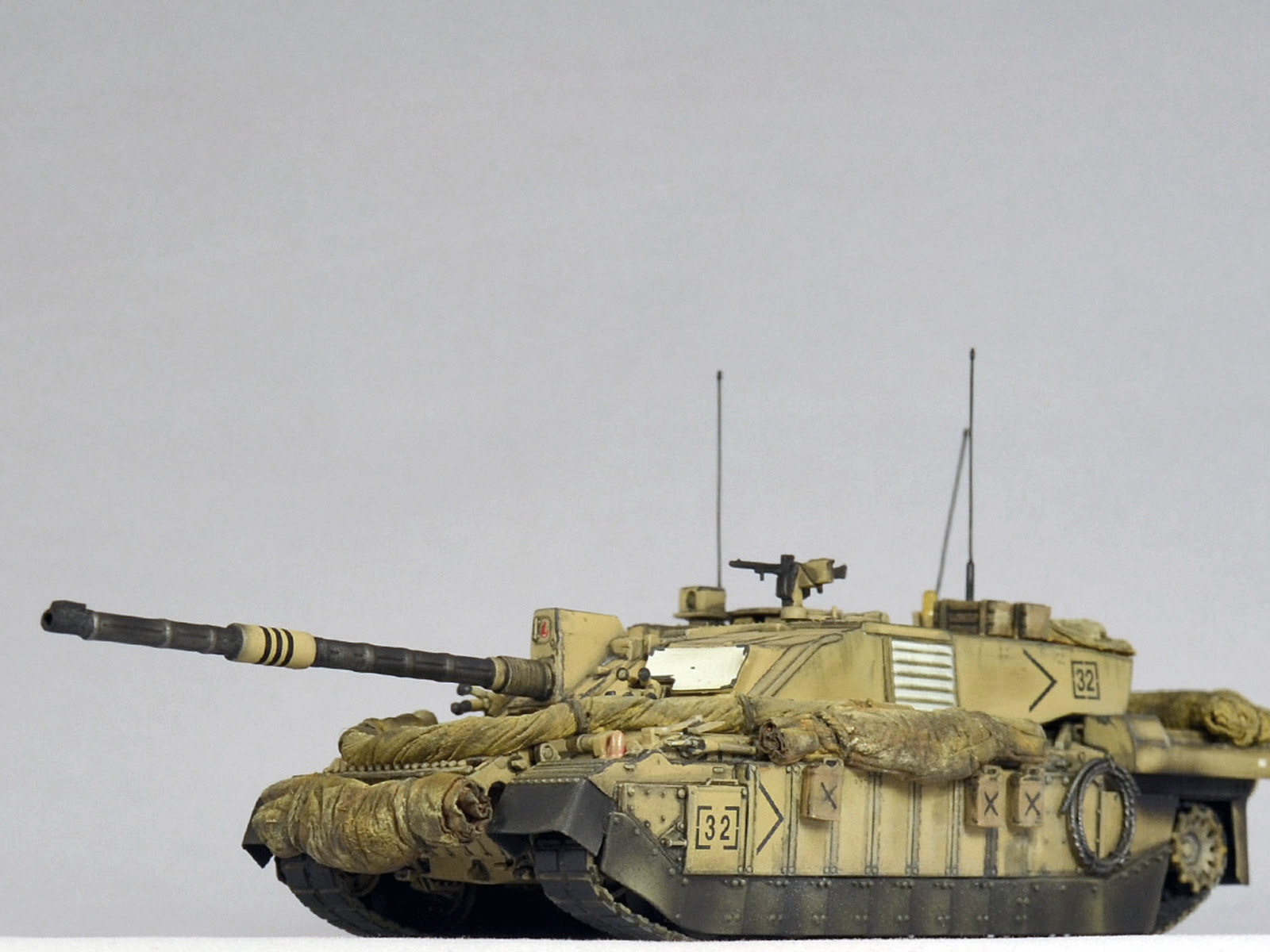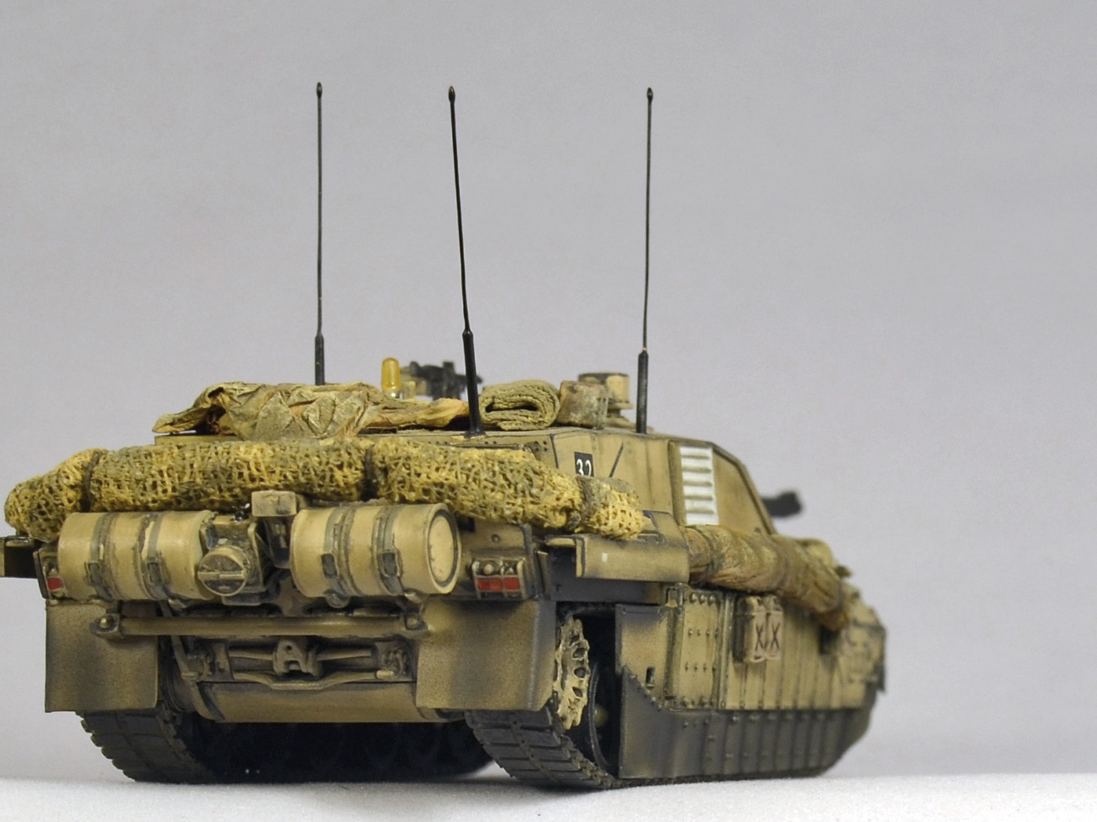 В конце навесил кучу разных чехлов и маск сетей, которыми англичане любили обвесить свои Челенджи в Ираке. Их сделал из туалетной бумаги и ПВА.
