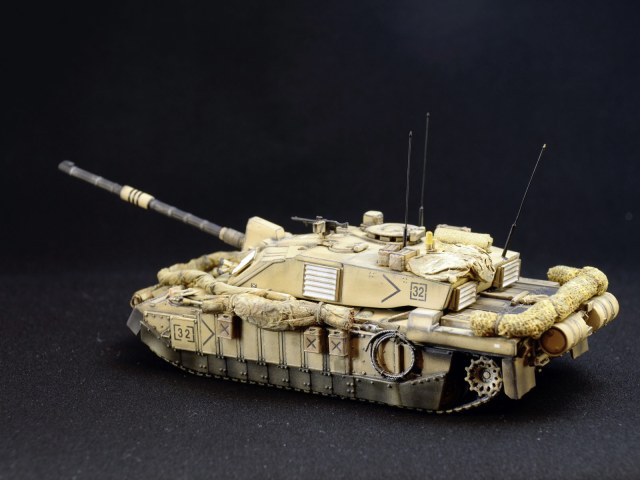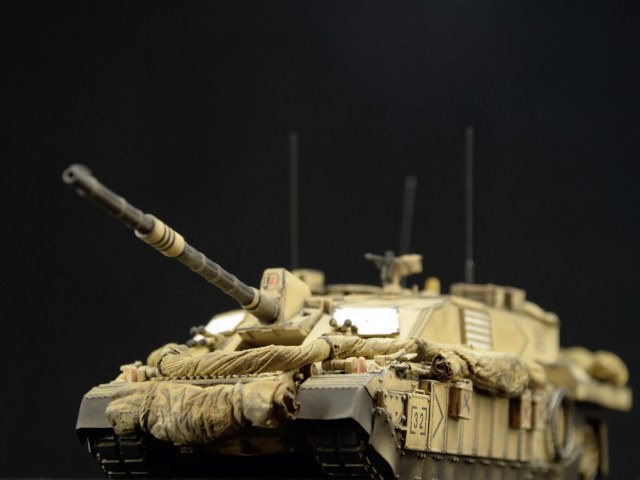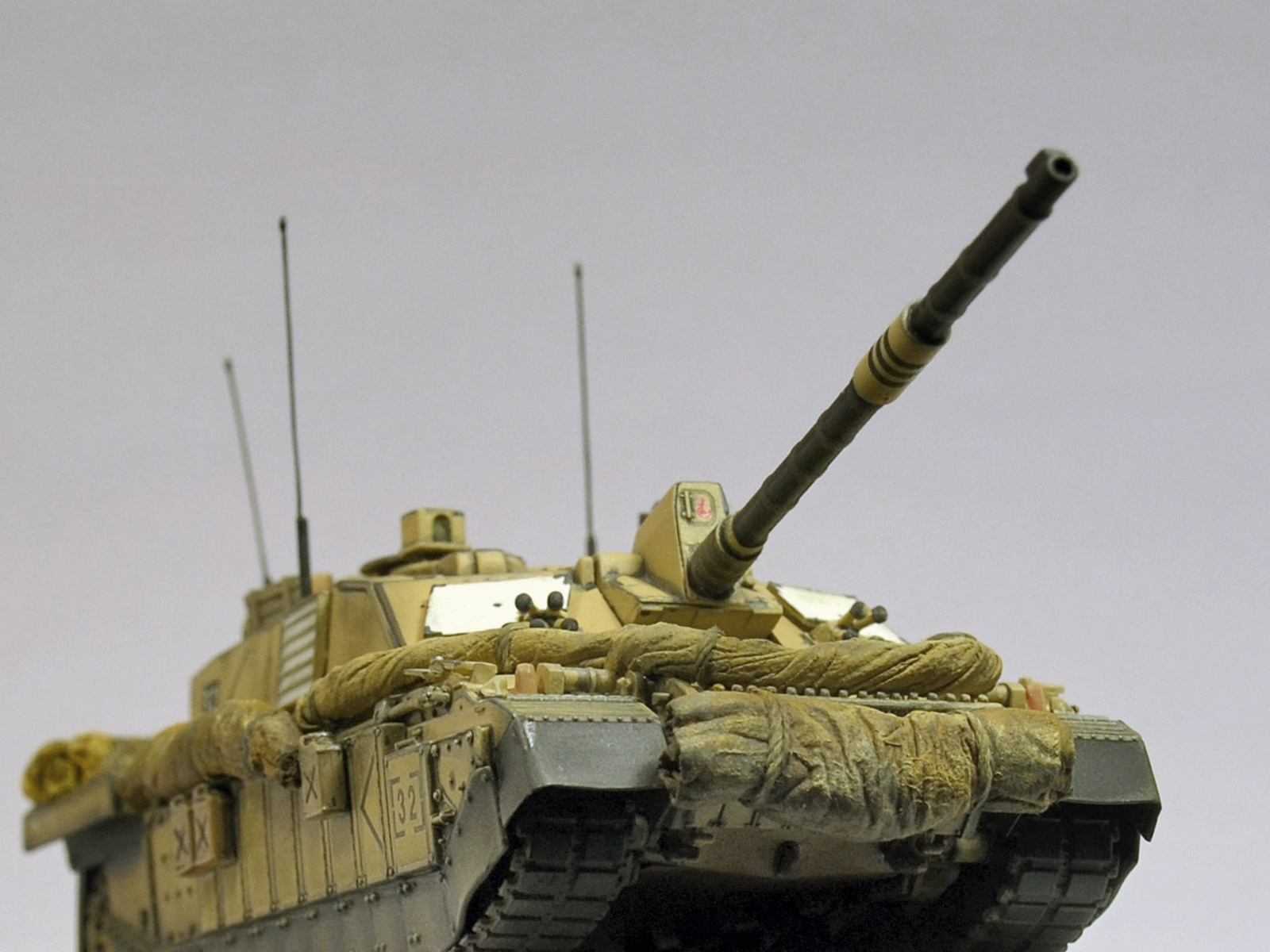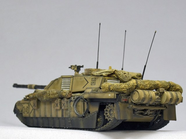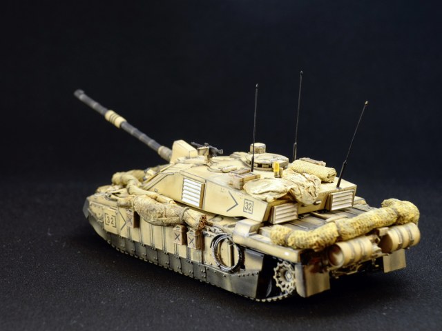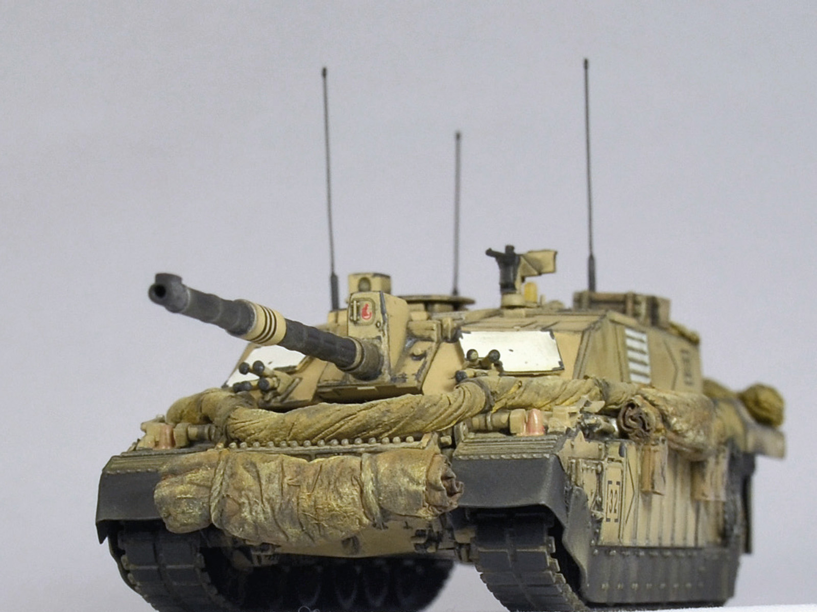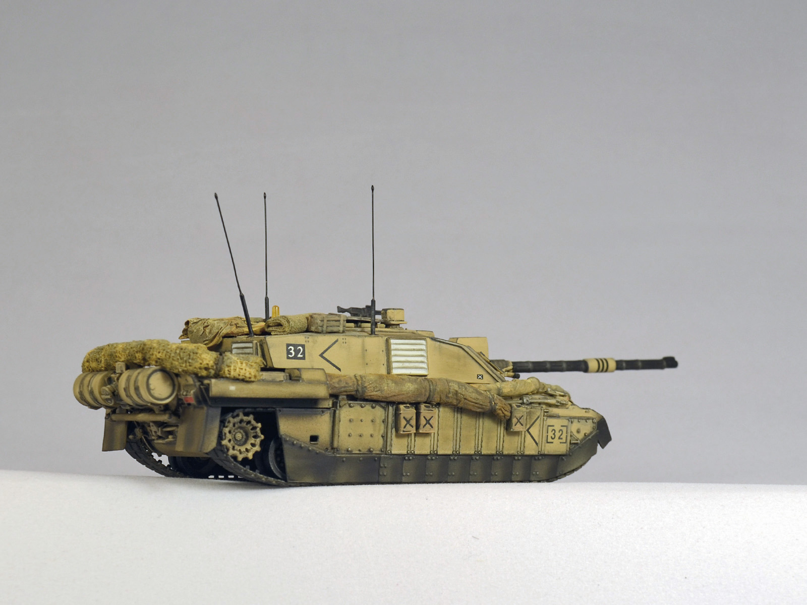 В конце навесил кучу разных чехлов и маск сетей, которыми англичане любили обвесить свои Челенджи в Ираке. Их сделал из туалетной бумаги и ПВА.