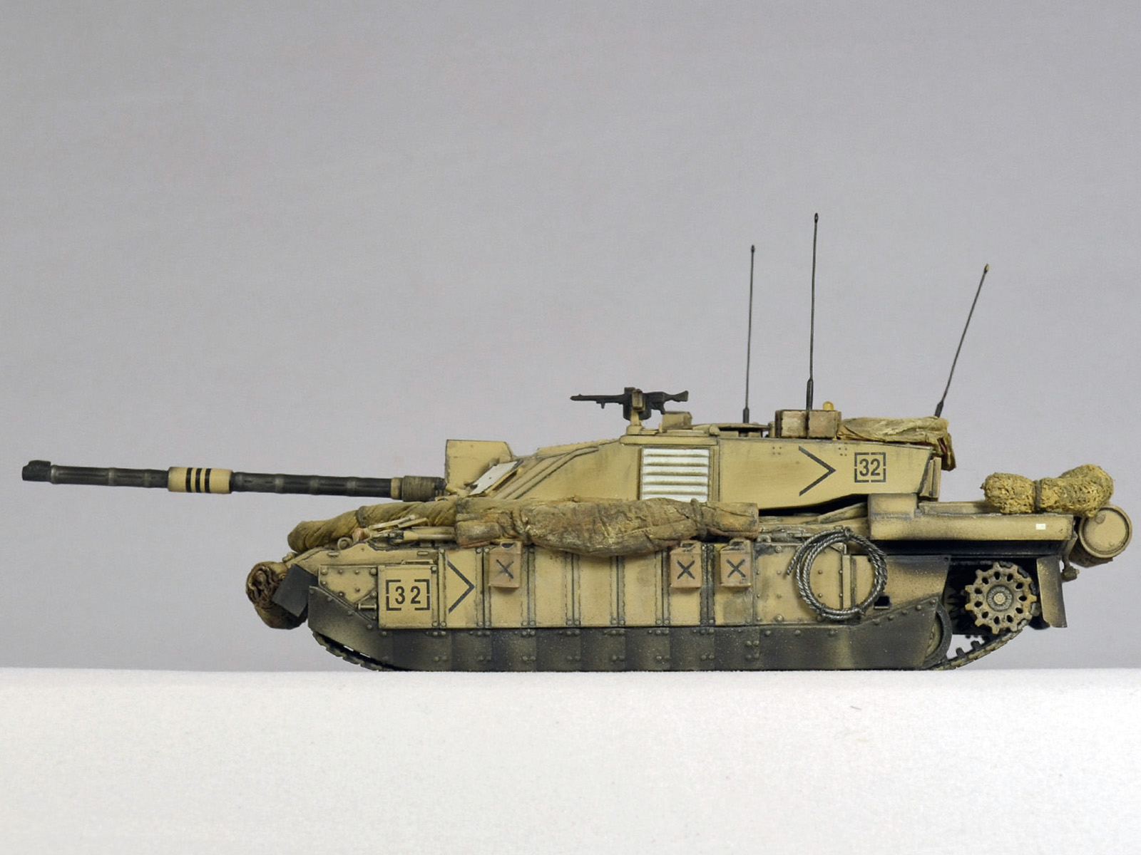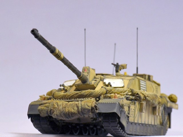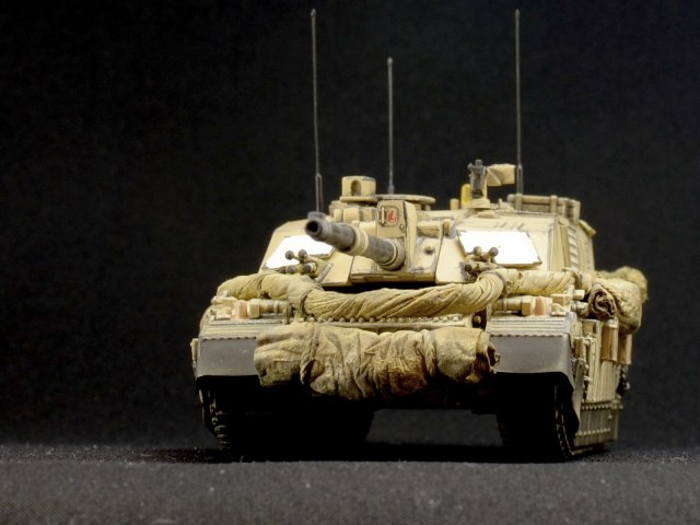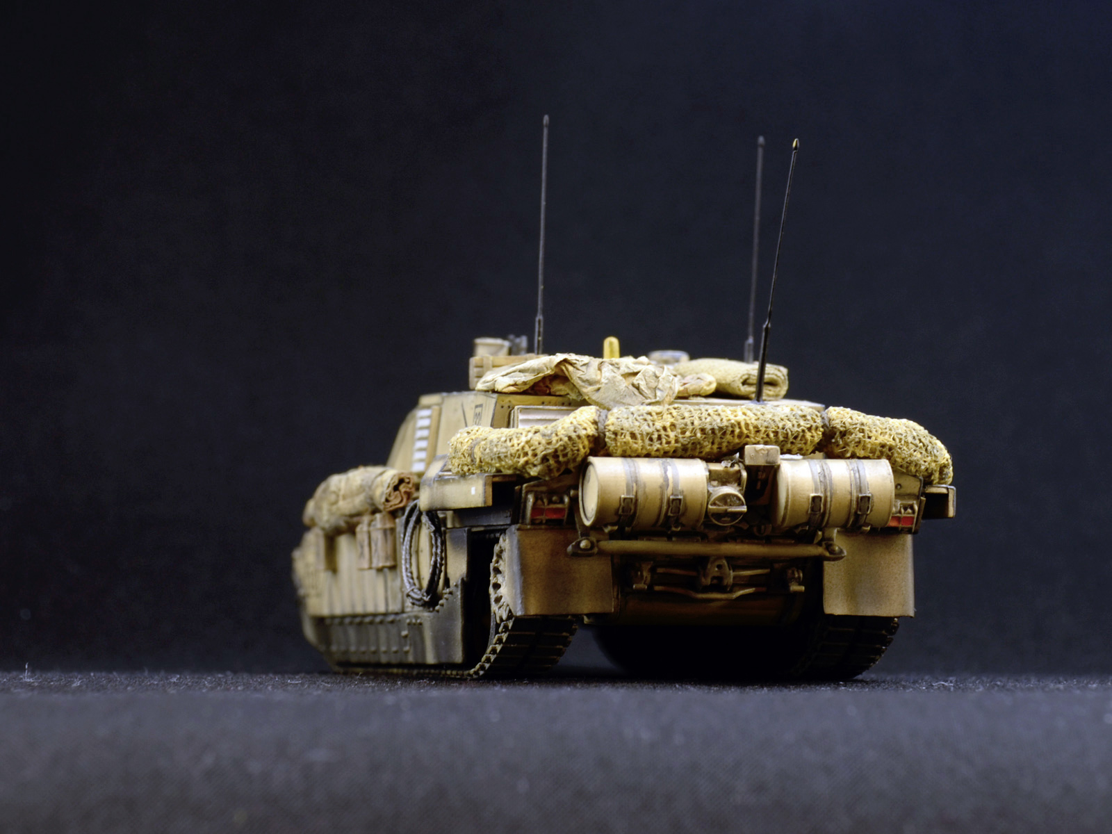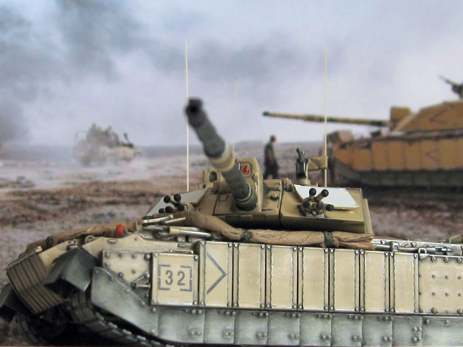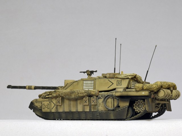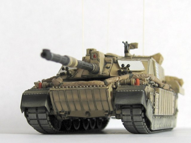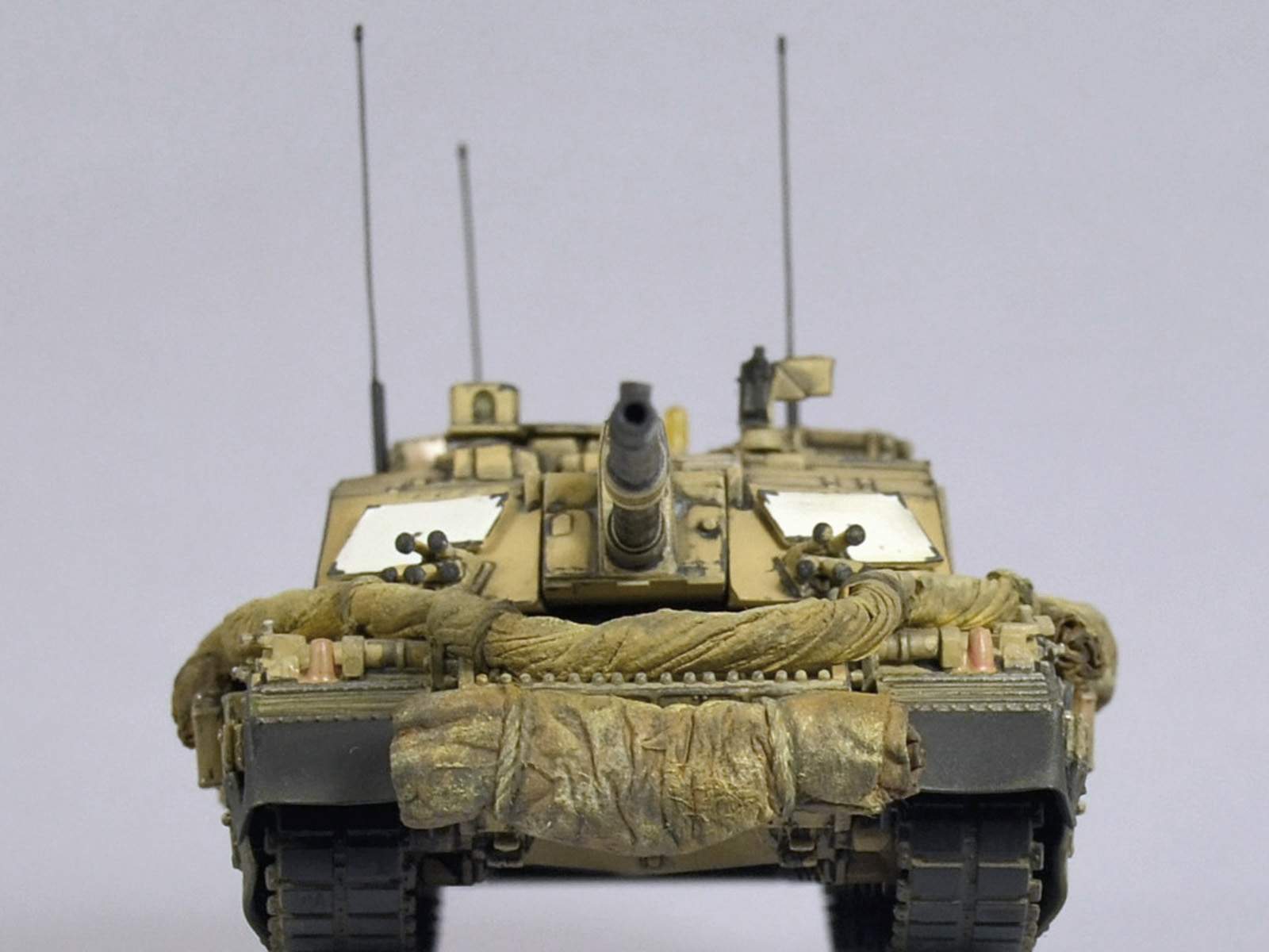 В конце навесил кучу разных чехлов и маск сетей, которыми англичане любили обвесить свои Челенджи в Ираке. Их сделал из туалетной бумаги и ПВА.