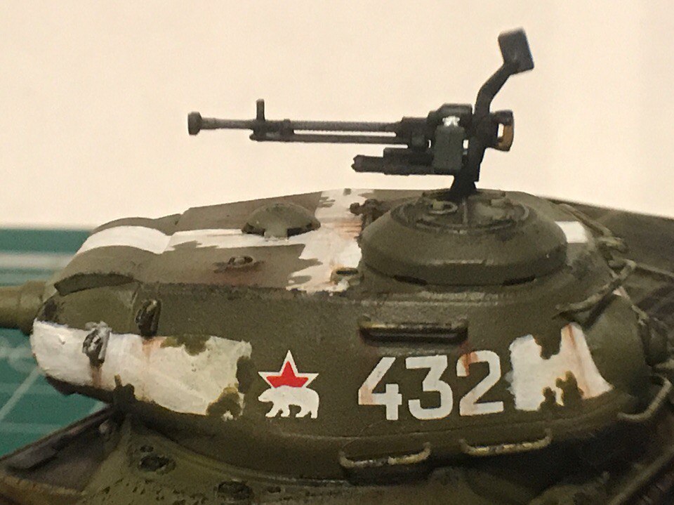 Закончил наконец свой первый танк. Хорошо, что масштаб 72 и он прощает большинство ошибок, но далеко не все. Очень я намучился с траками (как мне подсказали,я установил крепление ленивца вверх-ногами, поэтому и траки еле еле натянул) да и сколы не радуют. Попытался сделать масляные точки, только не маслом, а темперой. Результат приятно удивил, во-первых не пришлось тратиться на покупку масляных красок, а во-вторых итог работ почти как маслом. Для компании разместил двух мужичков, а так же ИС-2 из журнала про танки