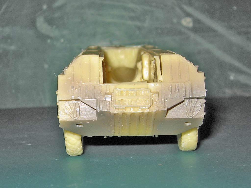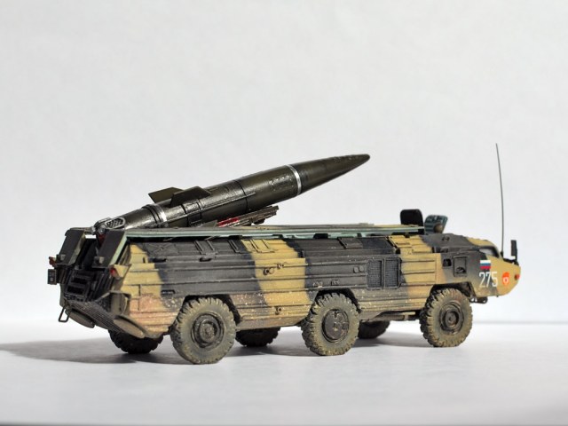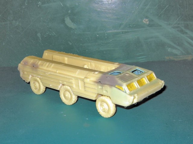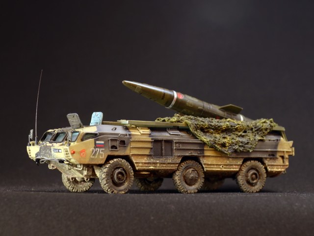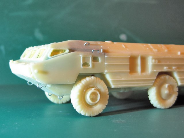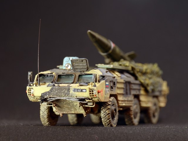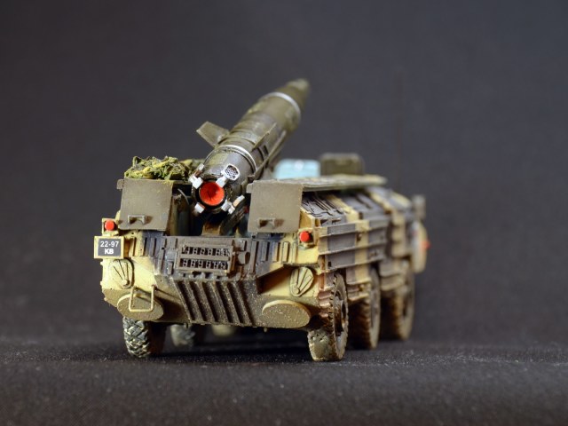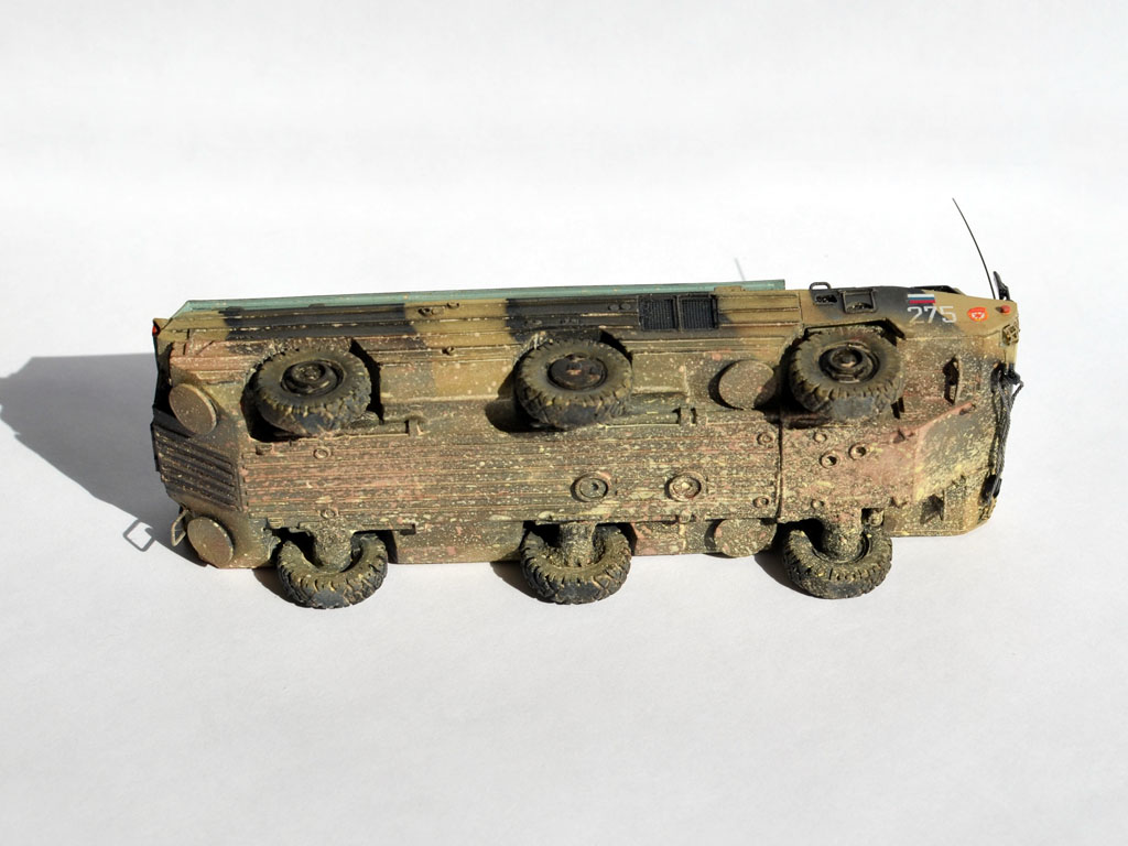 Смоляная модель оперативного тактического ракетного комплекса "Точка". Отливка, которая досталась мне была жуткого качества. Помимо недоливов, каверн, корпус был весь испещрён мельчайшими отверстиями, как после шрапнели. Из-за этого модель провалялась на полке несколько лет, и желания её собрать никак не появлялось. Но вот и она дождалась своего часа. Конечо долгие недели шпаклевания и шлифовки и сушки. Причём интересно, что зашпаклёванные участки через день оседали и на отшлифованном месте опять появлялась впадина. Так происходило несколько раз. Такое впечатления, что смола пожирала шпаклёвку. Ну вроде всё выровнял. Ходовая давалась очень примитивная и слабая. Корпус давался цельным куском смолы и очень-очень тяжёлый. Хлипкая ходовая не выдержала бы корпус. Поэтому я укрепил колеса и оси при помощи цианакрилата и соды. Сия комбинация даёт крепкое и прочное соединение, а главное наращивает недостающую толщину, упрочняя конструкцию. Из-за этого пришлось закамуфлировать ходовую грязью.