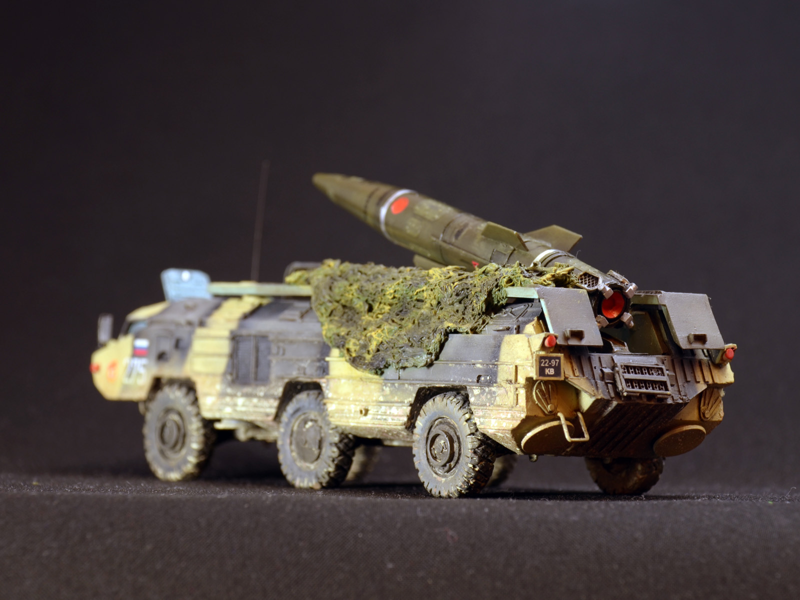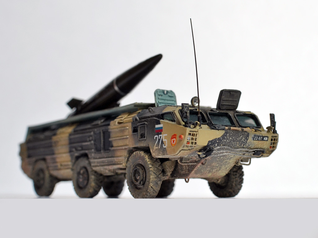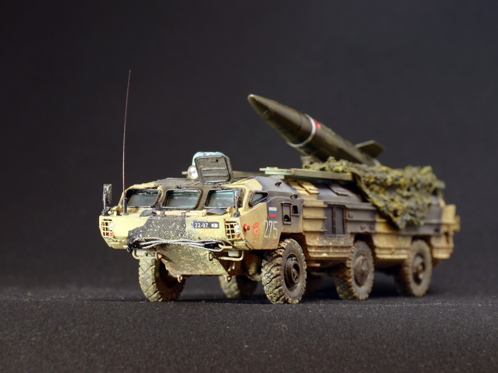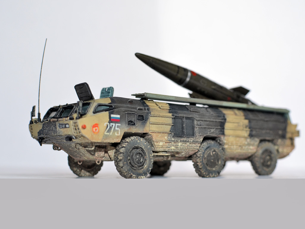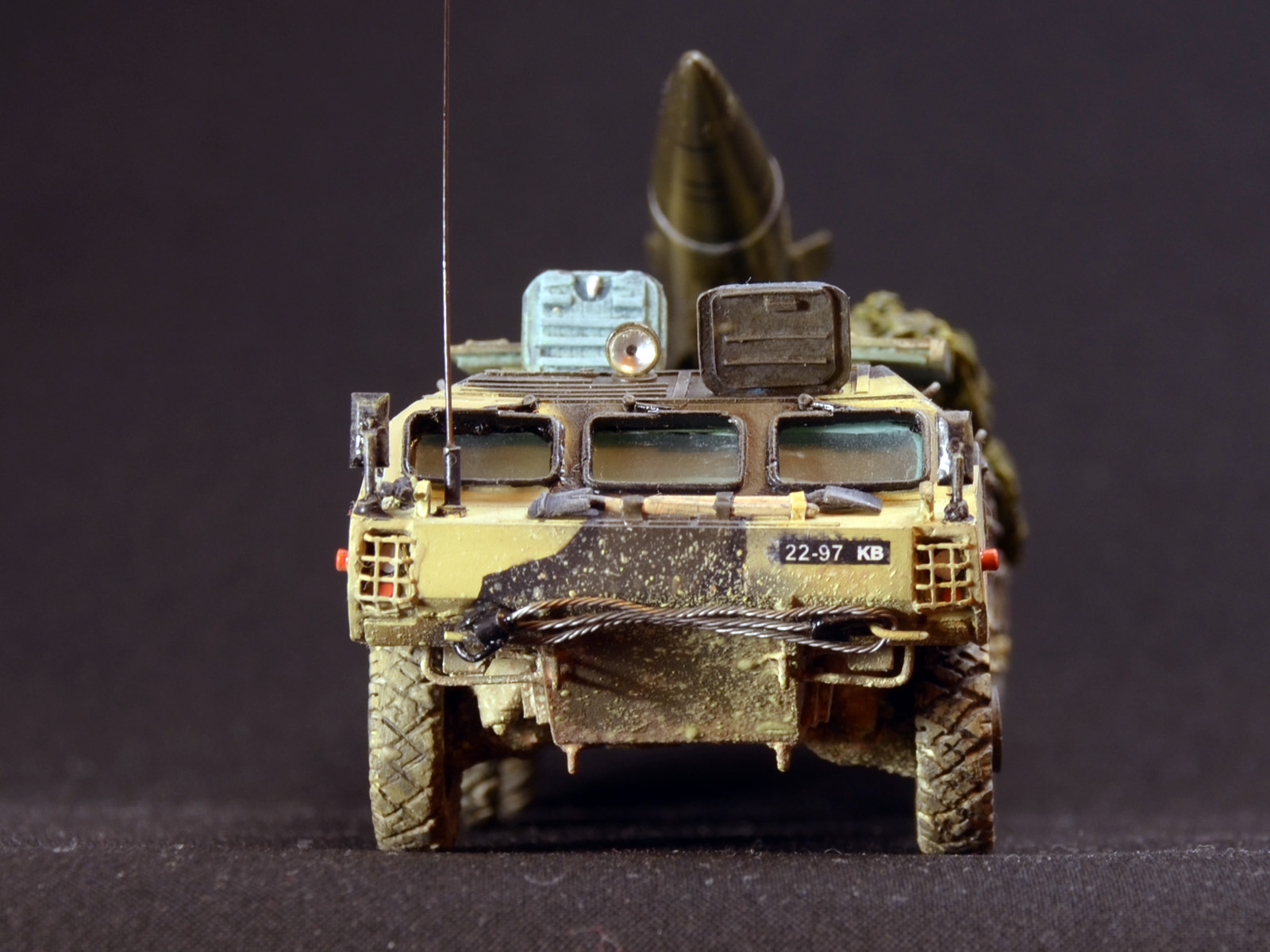 На ракете смотровые лючки из метализированного скотча. Фара-искатель от Эльф. Сетка ограждения передних фар - травление из запасов. Антенна -ус от домашней шиншиллы. Ну вот и всё. Окраска эмалями Revell. Тонировка, смывка, пигменты MIG.