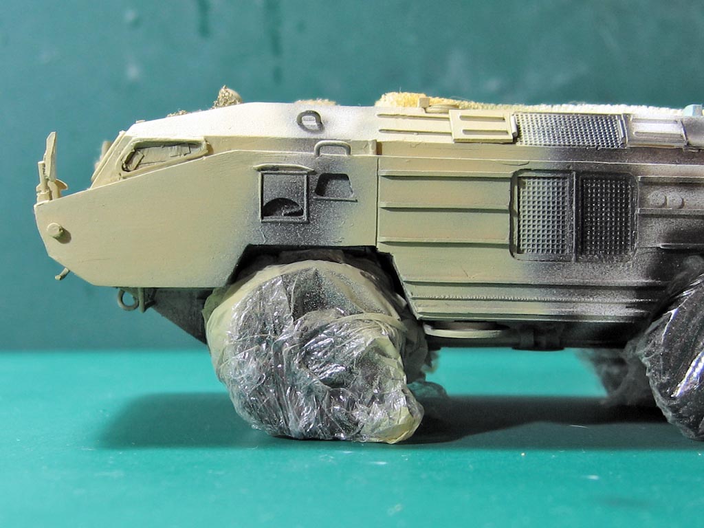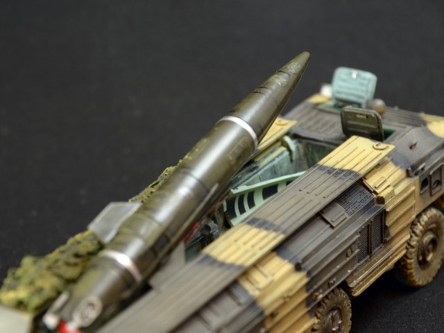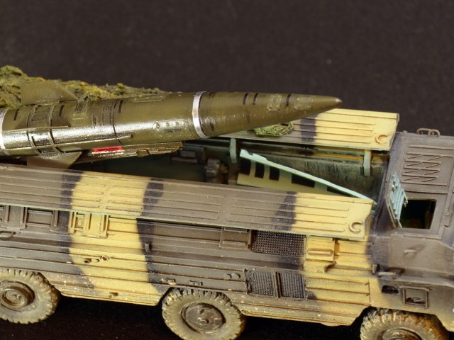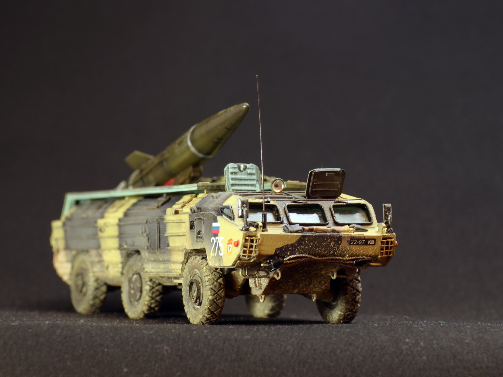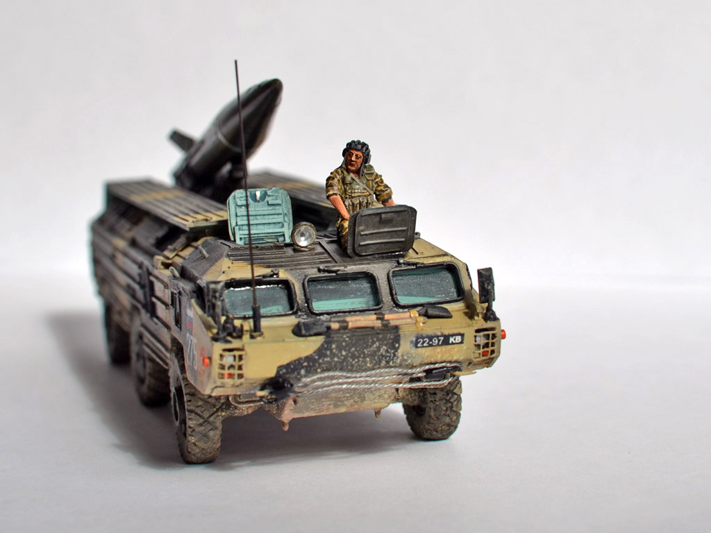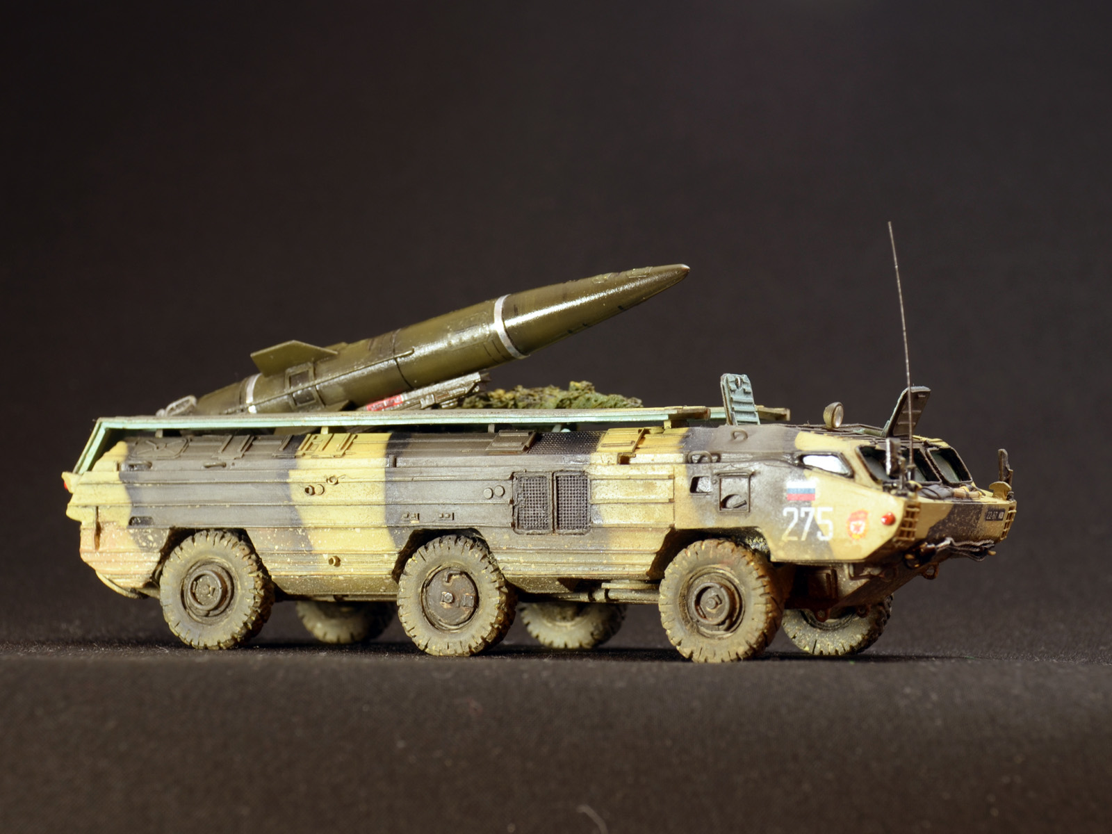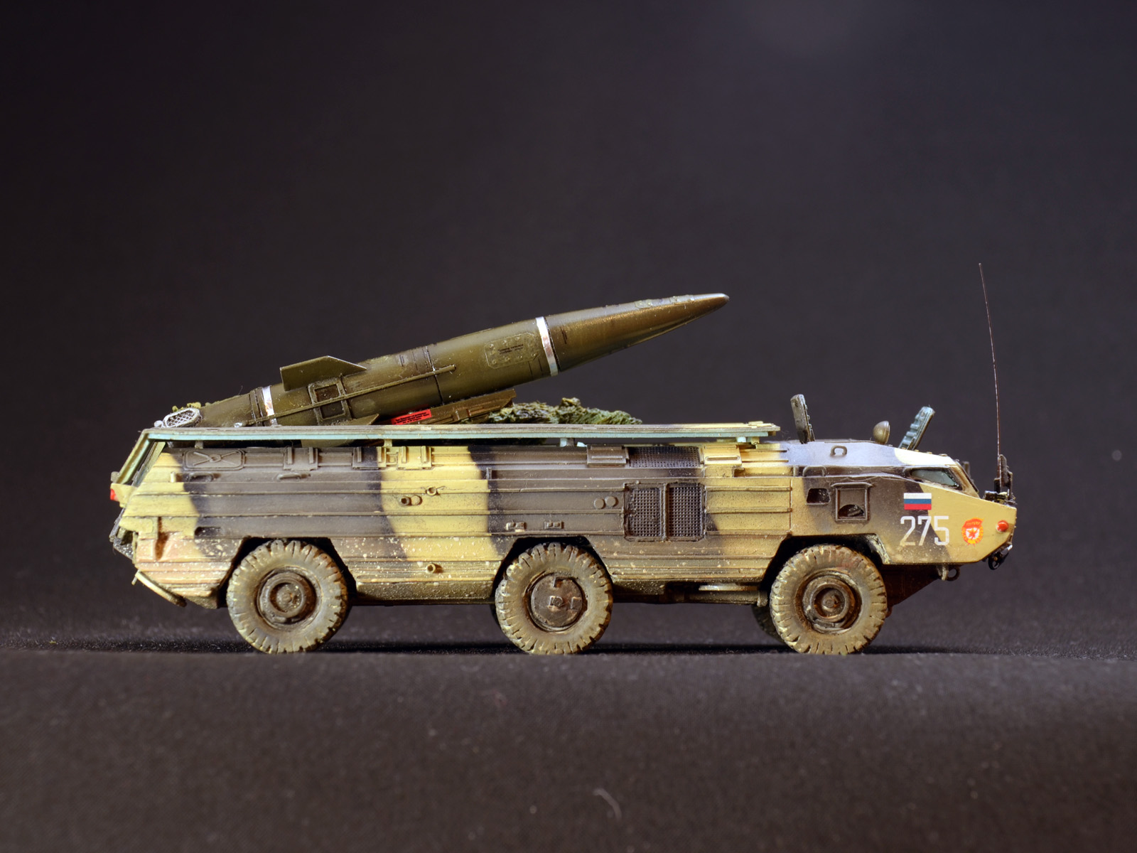 На ракете смотровые лючки из метализированного скотча. Фара-искатель от Эльф. Сетка ограждения передних фар - травление из запасов. Антенна -ус от домашней шиншиллы. Ну вот и всё. Окраска эмалями Revell. Тонировка, смывка, пигменты MIG.