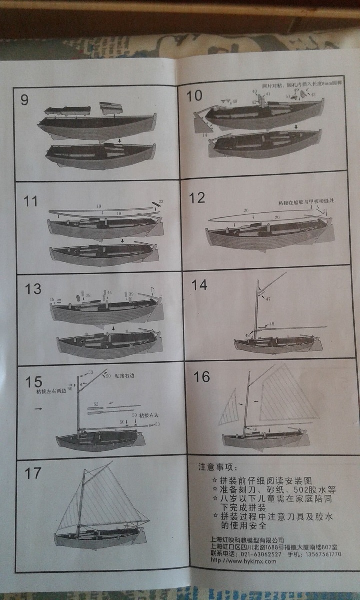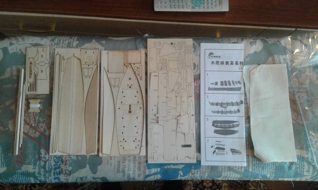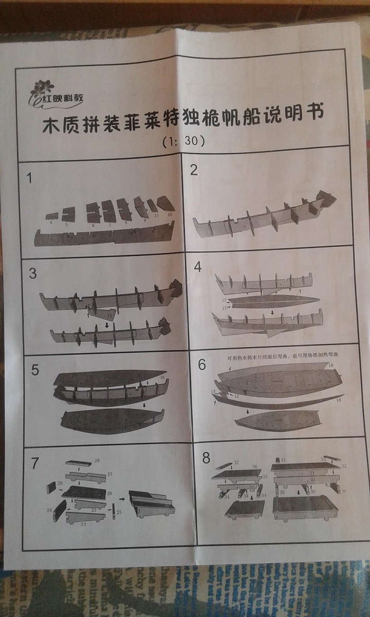 Я специально указал масштаб 1/30, ибо именно он заявлен продавцом. В отличии от набора в масштабе 1/35 (1/20???) обзор которого уже есть на сайте, данный набор упрощен - отсутствуют гвозди и другие элементы из металла (меди?), а также дана нить одного цвета. Ни о каком шпоне речь конечно не идет, только тонкая фанера (только хардкор!) Также, помимо чертежей сборки, дана выкройка парусов. Ткань и нить из набора можно выкинуть сразу.