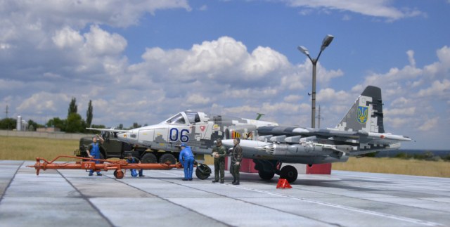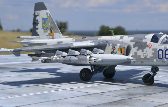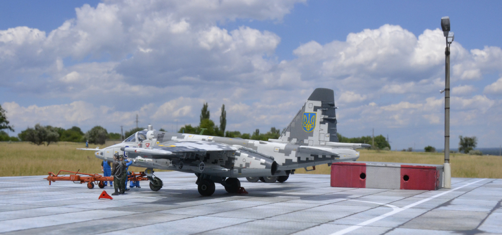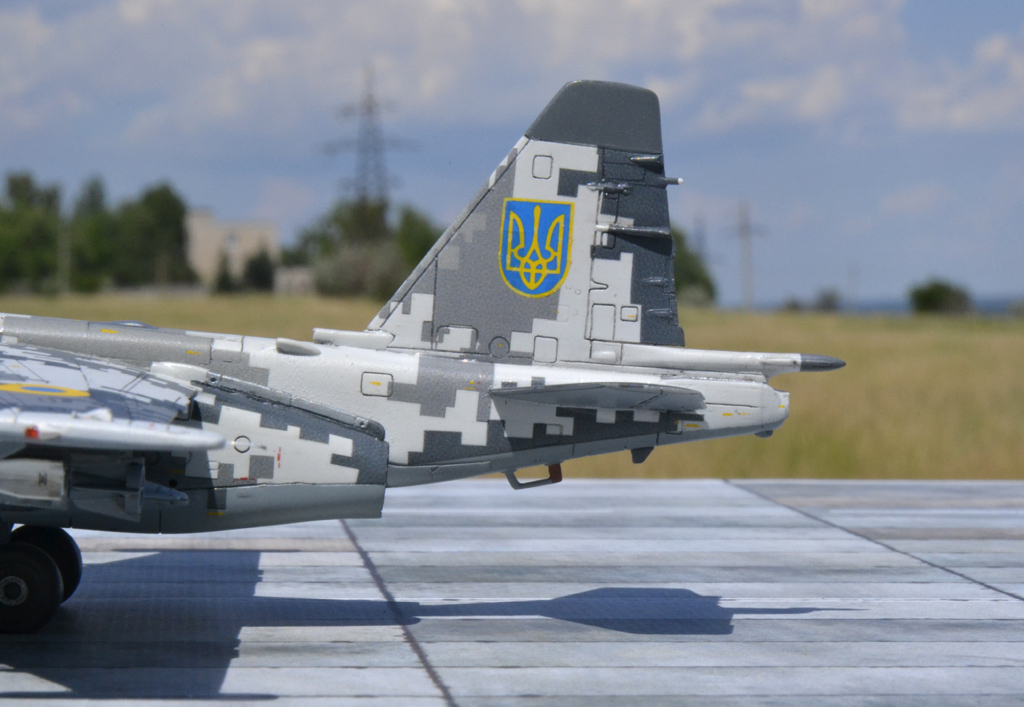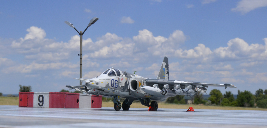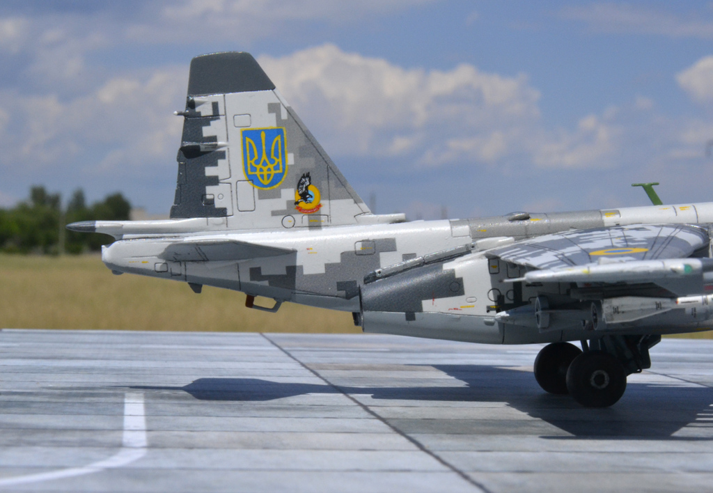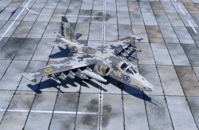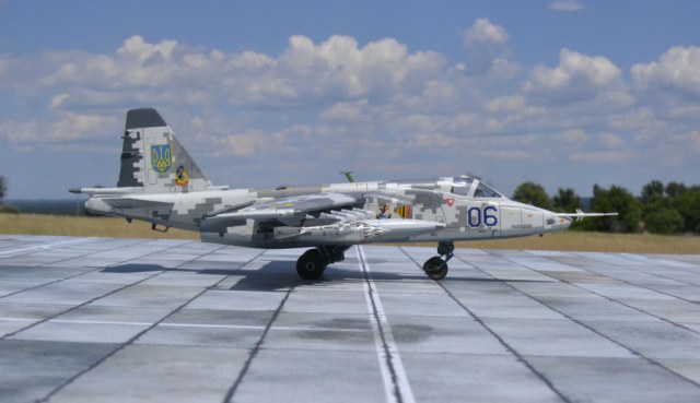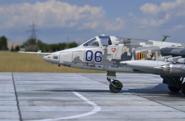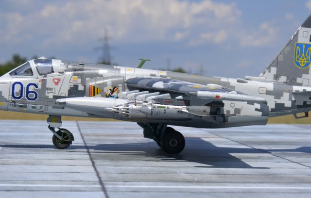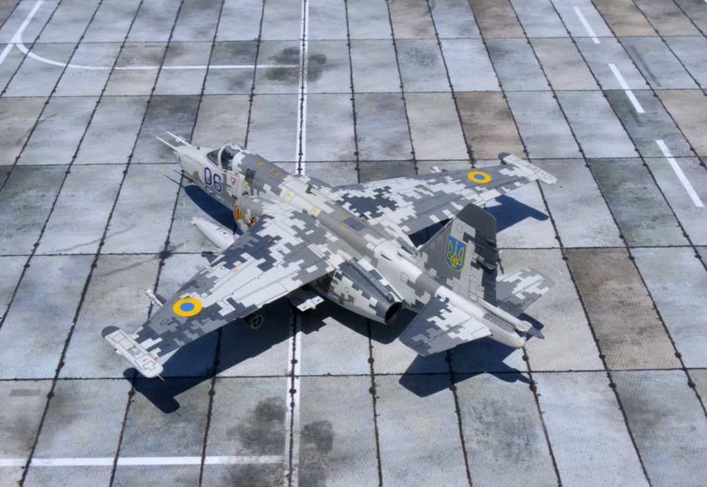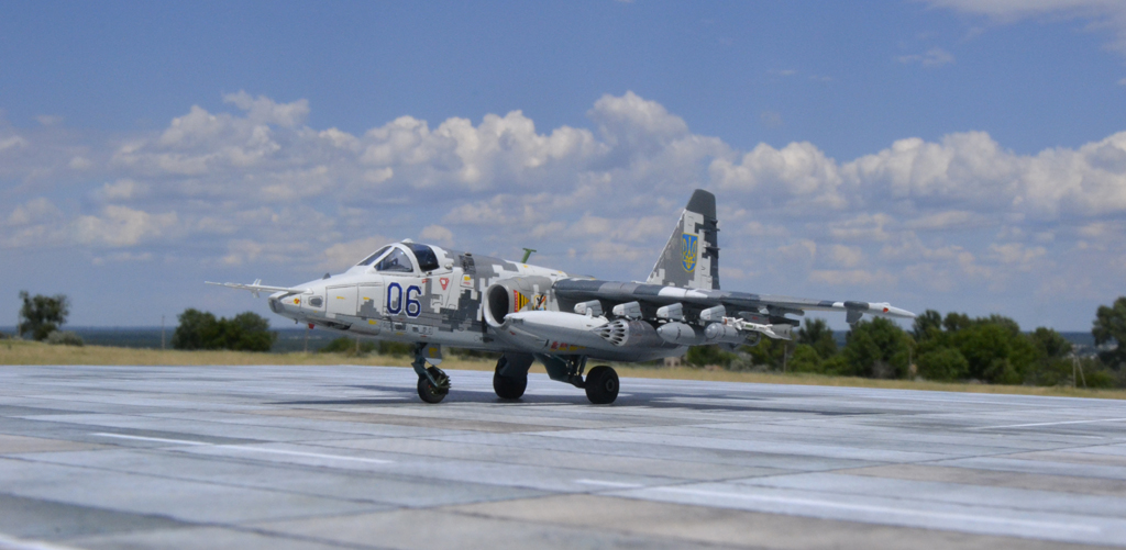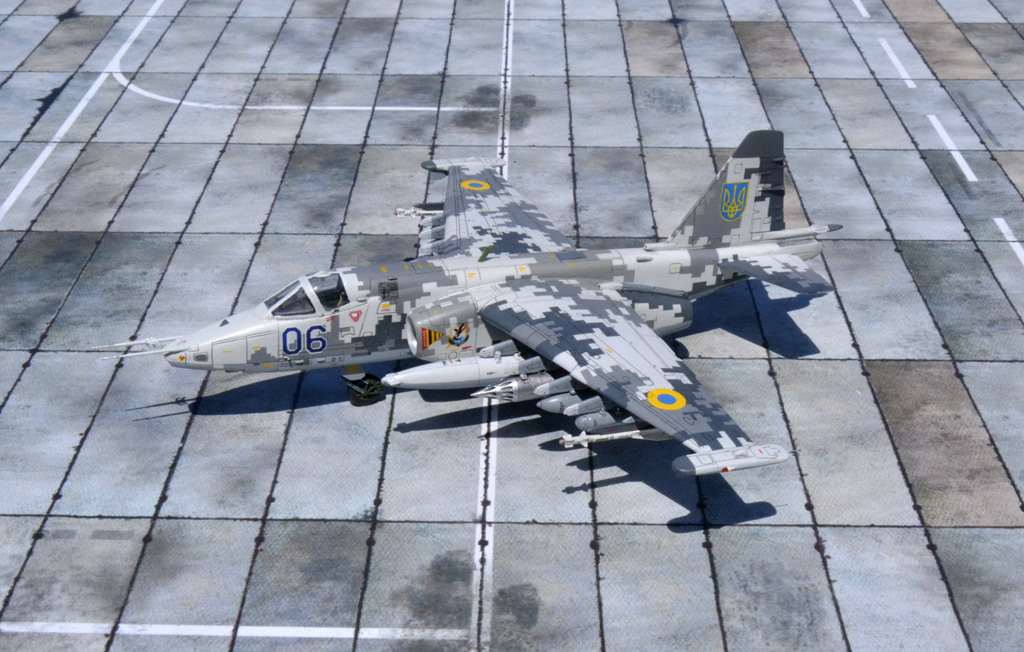 Всем привет! Представляю Вашему вниманию свою крайнюю работу – долгожданный Су-25М1 борт «№ 06 синий», который базировался в 299-ой авиабригада Кульбакино г. Николаев. Выбор пал именно на этот борт, поскольку именно он является первым в Украинских ВС самолетом окрашенным в пиксельный камуфляж и вступил в строй в 2012 году. Теперь о модели: сам набор мне не очень понравился, пришлось с ним повозится.