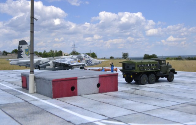 В процессе стройки сделал небольшой антураж к полочному аэродрому: Фонарный столб (в качестве прототипа была взята ЦЗТ г. Васильков). Основа столба плиты ИСМ, столб - литник, плафоны лапширак, стяжные ленты - фольга, громкоговоритель делал из кончика авторучки и т.д. На столбе добавил потеков, оттонировал маслянными точками. Также немного доработал фигурку пилота от «Звезды». Добавив на нее «парашютную систему», остальные фигурки «Эдуард».