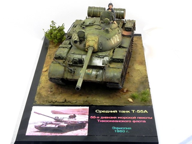 Модель среднего танка Т-55А, состоявшего на вооружении 55-й дивизии морской пехоты Тихоокеанского флота, принимавшего участие в операции в Эфиопии в 1980-м году.