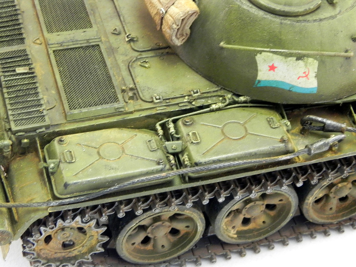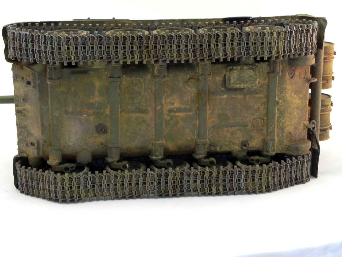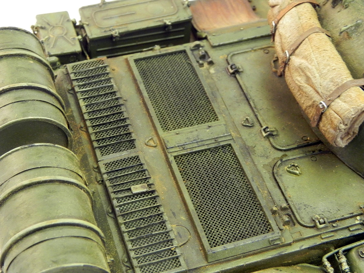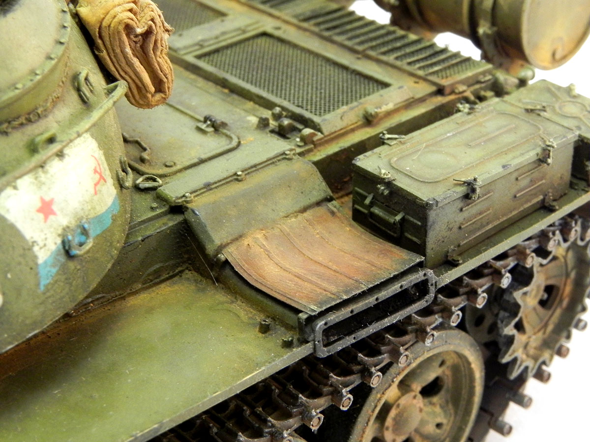 Модель Tamiya, сама по себе, очень хорошая. "Угадать" матчасть я сильно не стремился. Но на фото прототипа поглядывал. Не смог удержаться, и установил масляный баки, хотя на прототипе их нет. Набор травлёнки от Aber считаю избыточным. Многие элементы, которые предлагается заменить, в пластике выполнены весьма не плохо. Но есть места, где применение этого набора вполне оправдано. Кроме применения травлёнки, каких-то других серьёзных доработок не делал. Разве что, "сочинил" недостающий ящик ЗИП на правой надгусеничной полке.