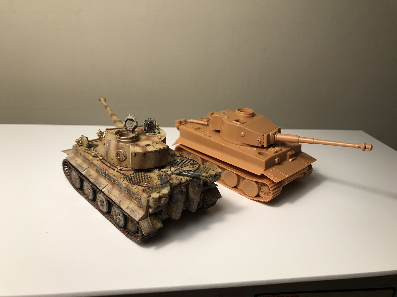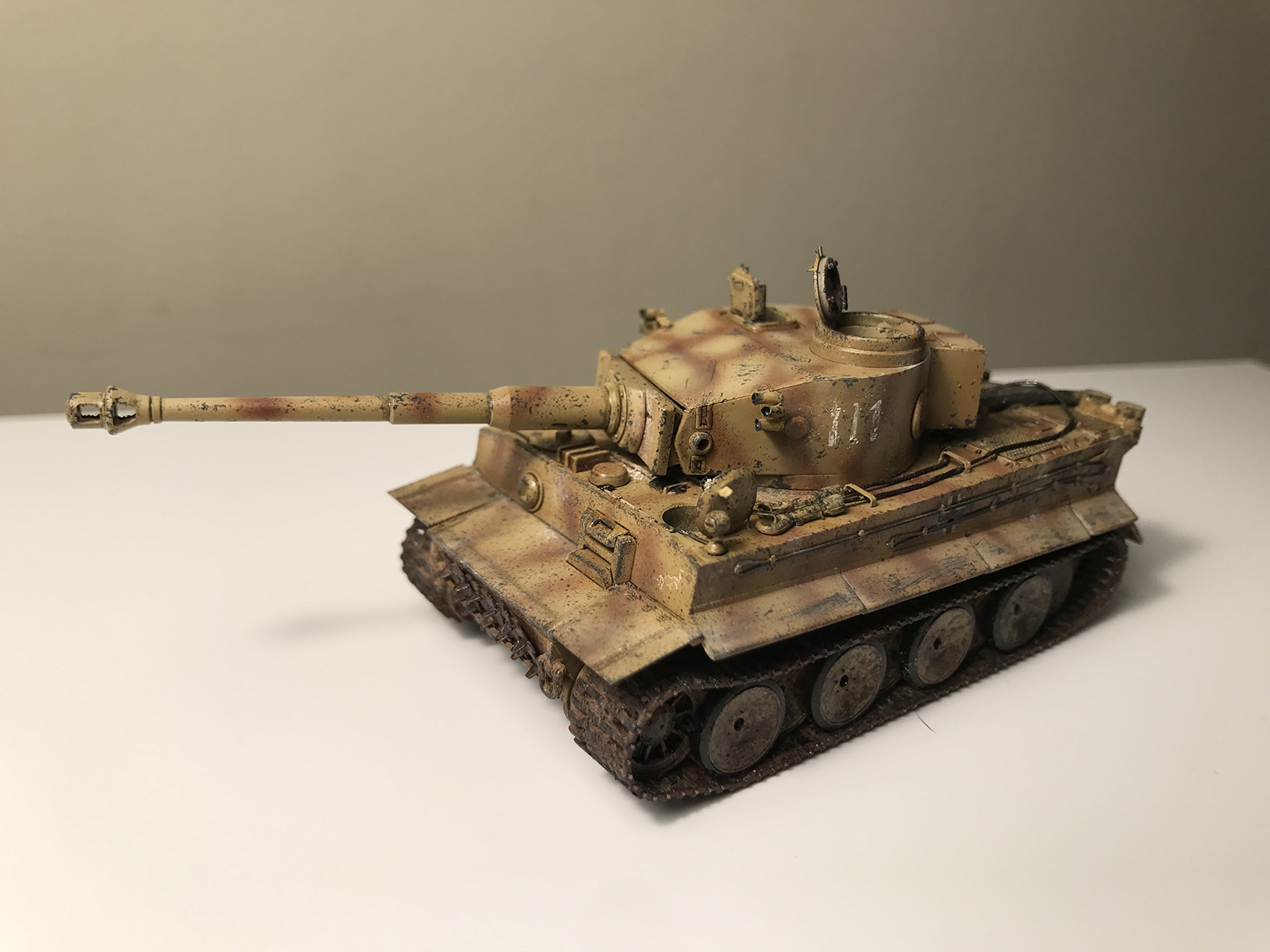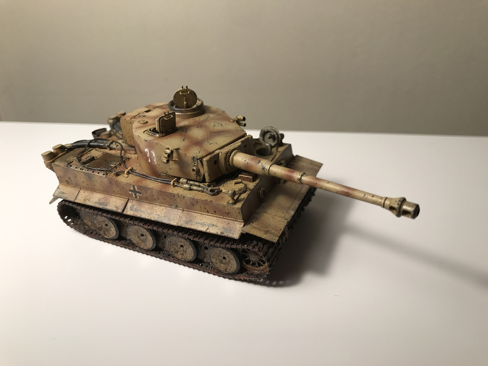 Из коробки модель конечно совсем голая, для сравнения сделал пару фото. Поэтому использовал ствол schatton modellbau, травление Hauler плюс самодел. Необходимые декали 505 тяжелого танкового батальона в масштабе не нашел, пришлось импровизировать. Трос тоже тонковат получился, на следующем Тигре исправлю. Пулеметы ставить не стал специально, т.к. танк встанет на диораму северного фаса курской дуги и его будет обслуживать экипаж.
