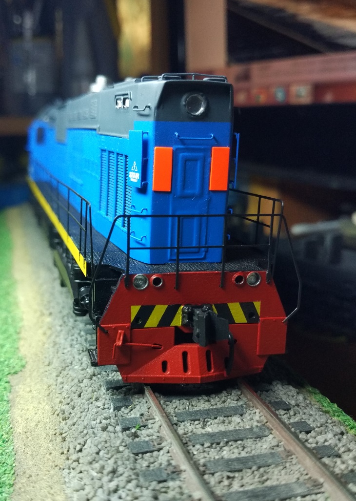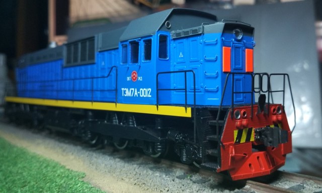 Материал - смола. Окраска автоэмаль. Набором не предусмотрены ни поручни на крыше, ни ступеньки на крышу, а без них модель довольно скучная, поэтому пришлось разметить и все же сделать их, и результат превзошел ожидания, это первая модель ТЭМ7 - будут и другие. За прототип взял ТЭМ7А-0012 он отличается от наборного варианта, но для заказчика это не критично. Нормальных фото сделать уже не получится, у модели новый хозяин.