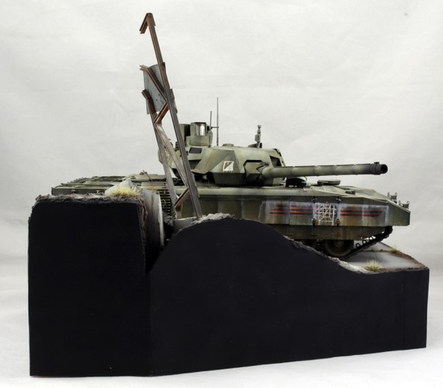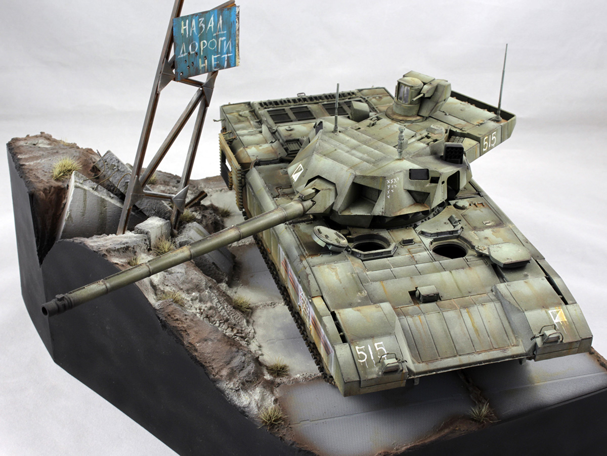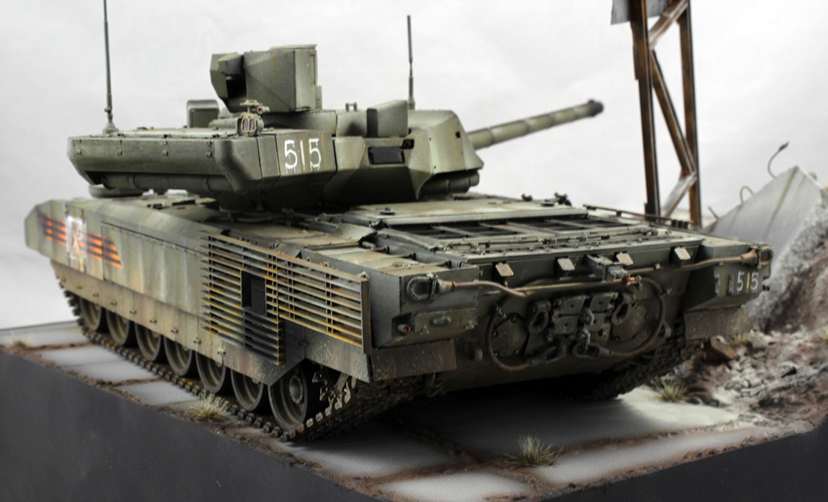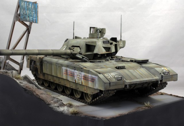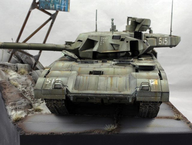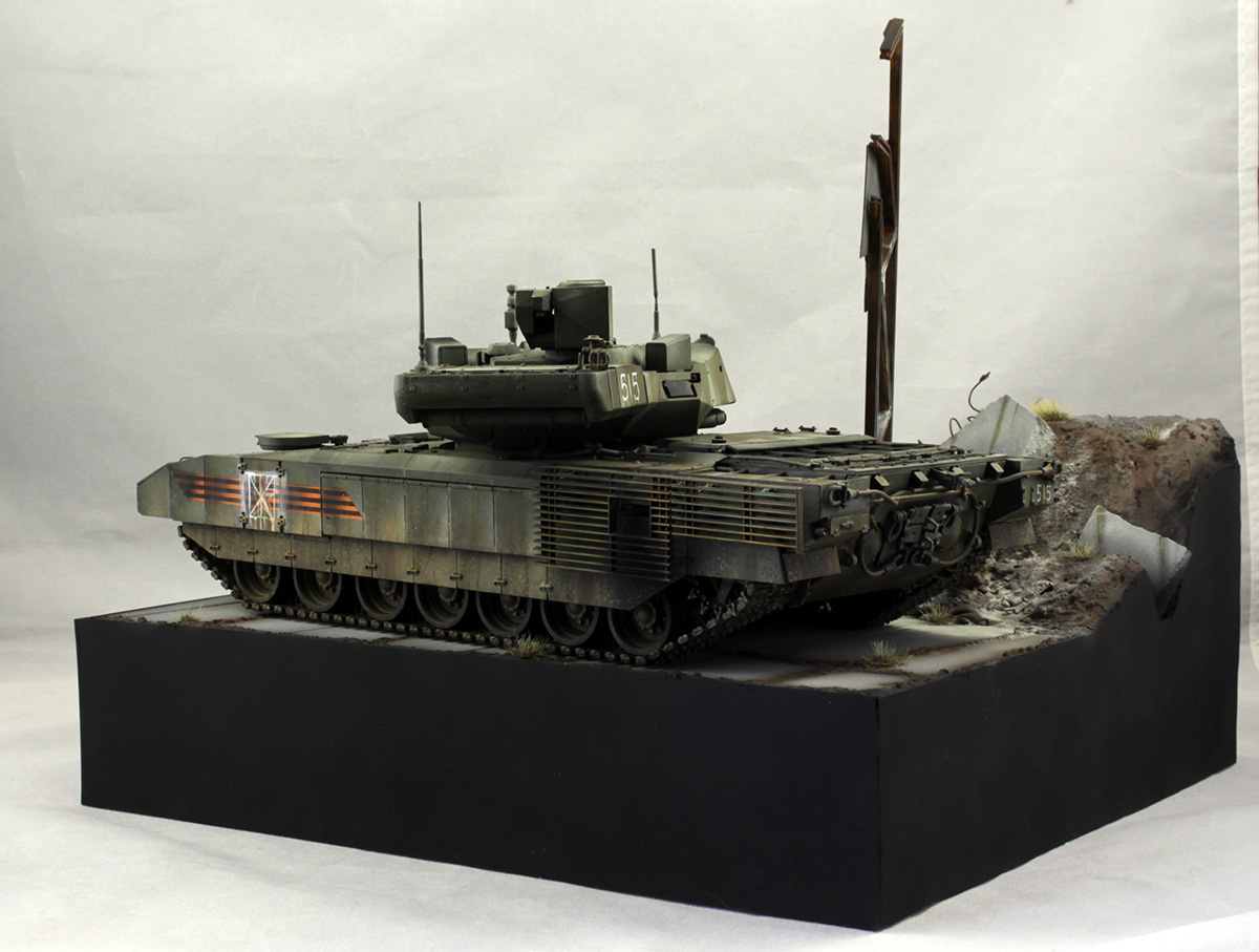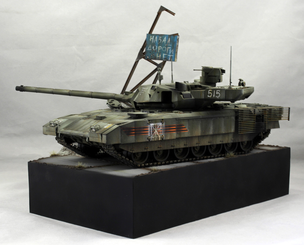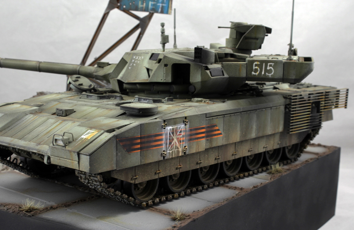 Хотелось изобразить технику, участвующую в локальном конфликте недалекого будущего. По задумке Т-14 отправилась на фронт чуть ли не с парада. Отсюда и знаки отличия, нанесенные на скорую руку, и закрашенные парадные звезды и ленты на бортах.