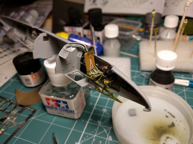 - Очень богатая деталировка кабины, которую я к тому же усложнил фототравлением. Причем, это все для фанатов моделизма, ибо это "суслик" 80 lvl, снаружи практически ничего не просматривается и остается только на фотографиях сборки.