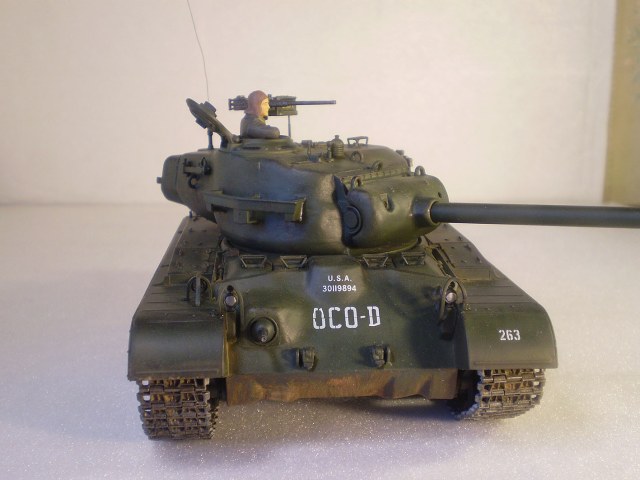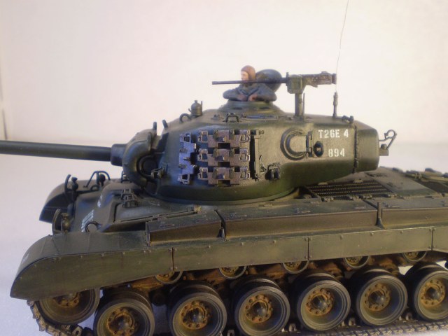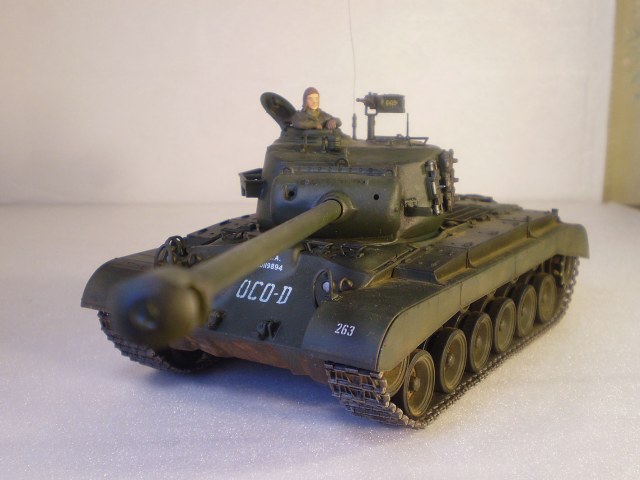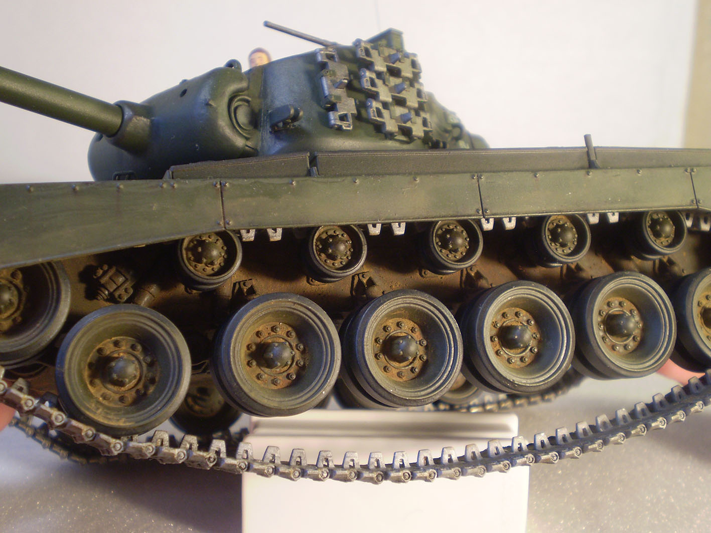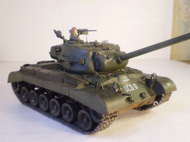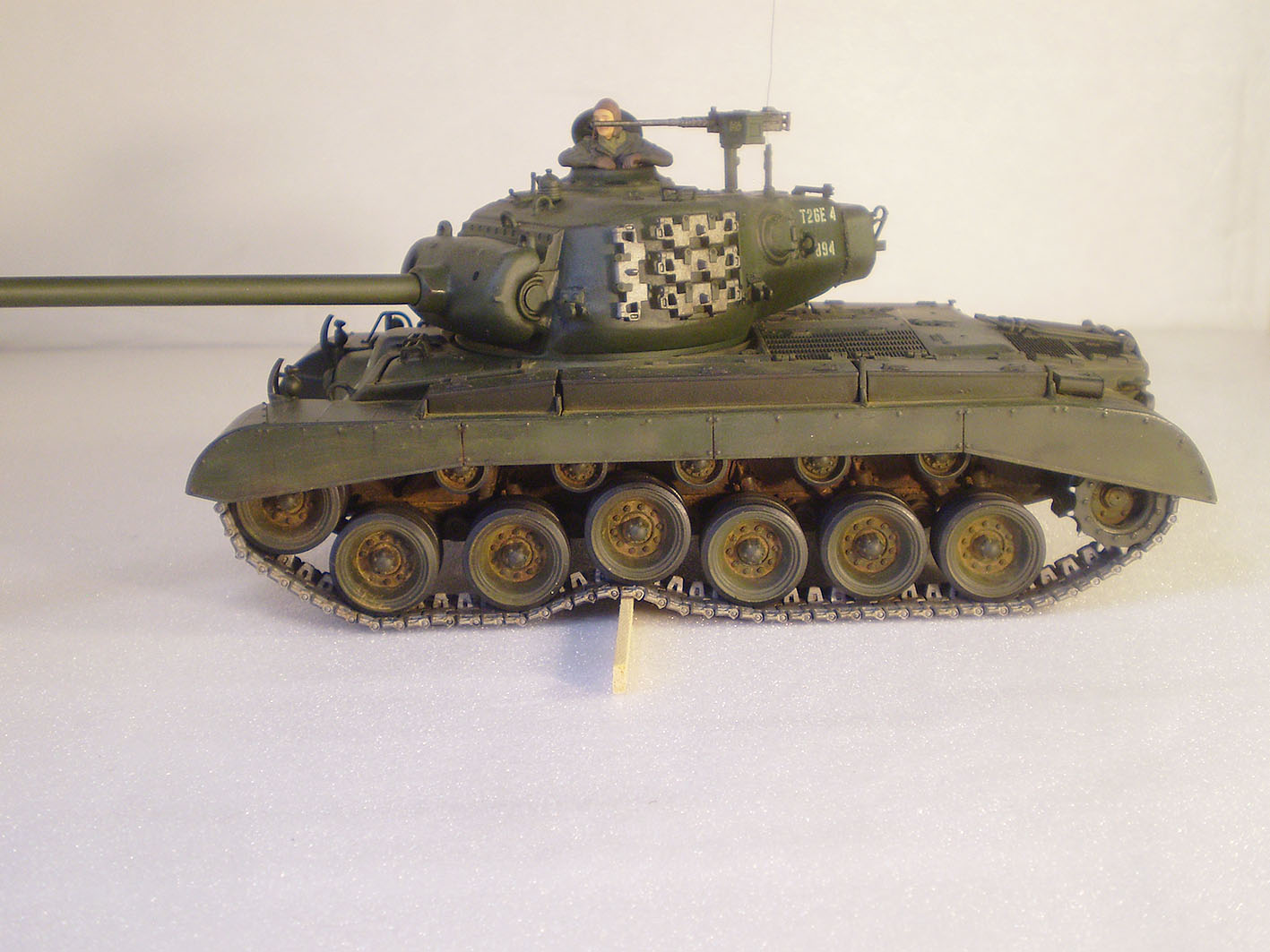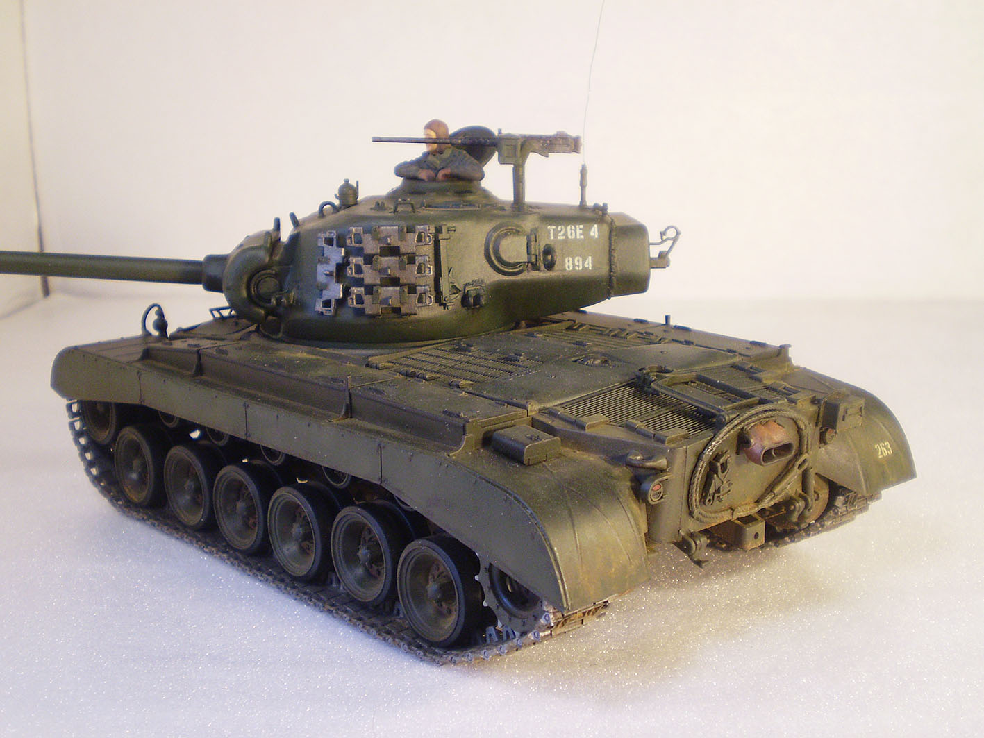 Хочу представить вашему вниманию свою крайнюю модель - Т26Е4 от Тамии. В матчасть особо не углублялся, но из той информации, что нашёл в сети, могу сделать вывод, что производитель предлагает собрать из коробки Т26Е4 Pilot №2 (Потому, как пружинные балансиры снаружи башни отсутствуют. Да и декаль соответствует прототипу). В сборке модель очень приятная, хорошая стыкуемость. Приятно удивила возможность сделать подвижную ходовую.