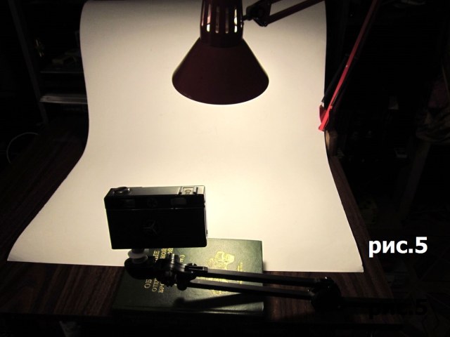 Все просто - лист ватмана, пара ламп (на фото одна) и фотоаппарат на штативе. На фото на штативе закреплен тот самый фотоаппарат "Смена", болт от которого я использовал. Так я фотографирую старым Canon-A2200HD. Как фотографировать очень хорошо описано здесь: