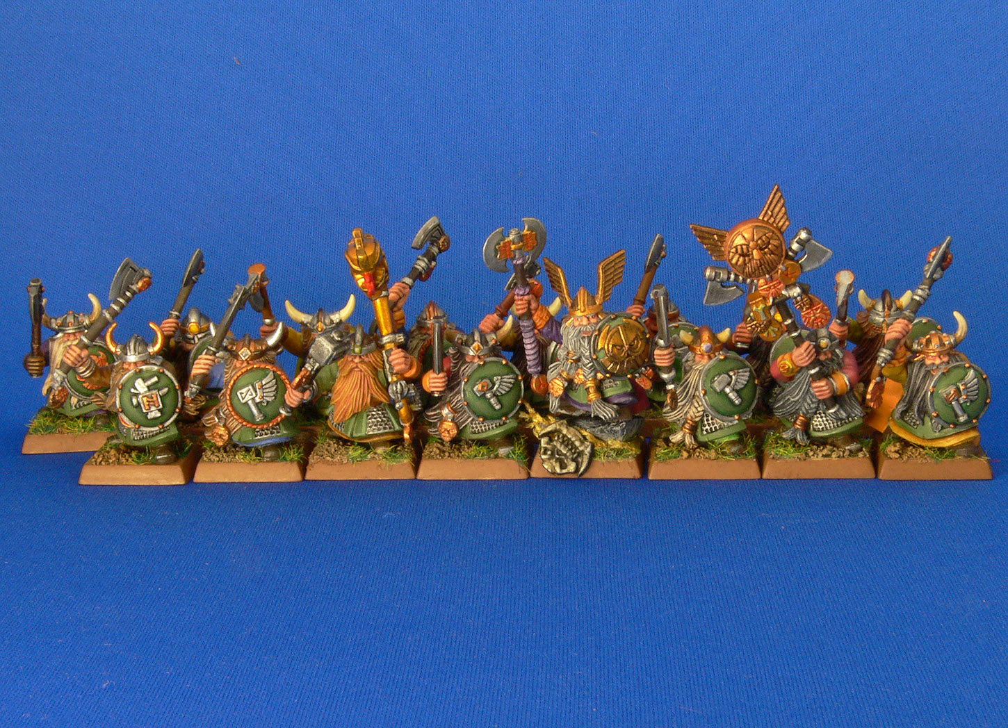 Я собираю армию гномов, чтобы играть в Вархаммер ФБ. Недавно подготовили с папой новый отряд в мою армию. Это - гномы-воины. Они относятся к основным отрядам, составляющим армию. Все они вооружены топорами и щитами. Они не богатые, поэтому вооружение оформлено железом и медью. Единой униформы у них нет, поэтому они в разных пестрых рубашках. Но чтобы они выглядели как один отряд, я покрасил им кафтаны и щиты в одинаковый цвет - зеленый. Папа помог мне красить самые важные фигурки - командира, трубача, знаменосца и некоторых воинов.