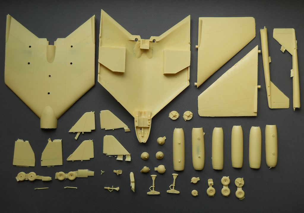 Модель из смолы от фирмы Cape Hobby & Gift в масштабе 1/72 упакована в картонную коробку с боковым открытием. В данном наборе нам предлагается собрать вариант Arado Ar. E555-10 – один из самых оригинальных по компоновке. Литьё среднего качества, имеются многочисленные дефекты. Членение планера относительно рационально, но исполнение деталей местами оставляет желать лучшего. При достаточно подробно проработанных подшассийных нишах, кабина пилотов довольно бедновата. Элементы остекления – самый грустный момент во всей модели. Они отлиты из прозрачной смолы отвратительно – мутные и с дефектом. Частично этот вопрос можно будет решить путём «донорства» от ревелльной модели (на одном из фото я показал эти элементы от двух наборов вместе), однако остекление места заднего стрелка придётся давить самостоятельно. Декали смотрятся неплохо. Инструкция, как таковая, отсутствует. Вместо неё прилагается пачка скреплённых степлером плохеньких ксерокопий фотографий отображающих разные этапы сборки модели. Все эти весёлые «картинки» я объединил на одном фото в обзоре.
