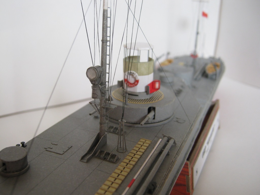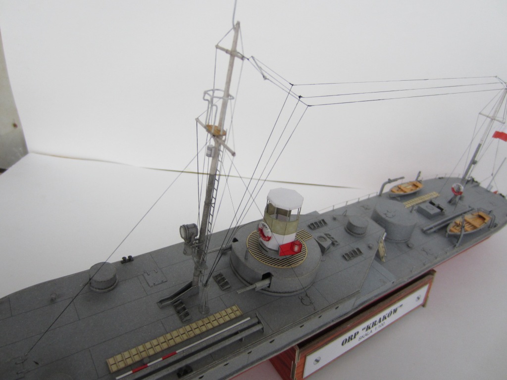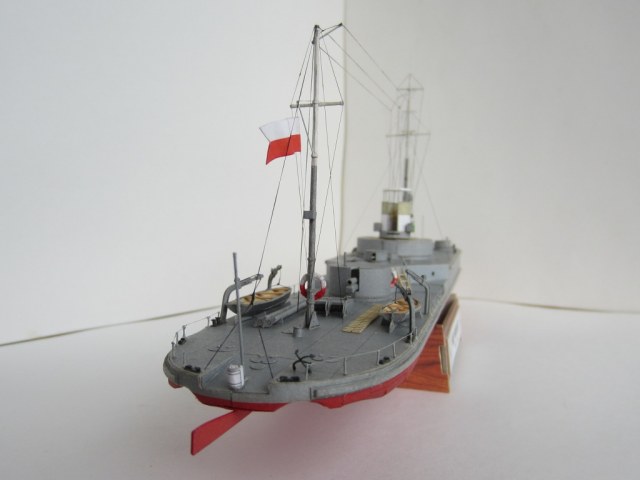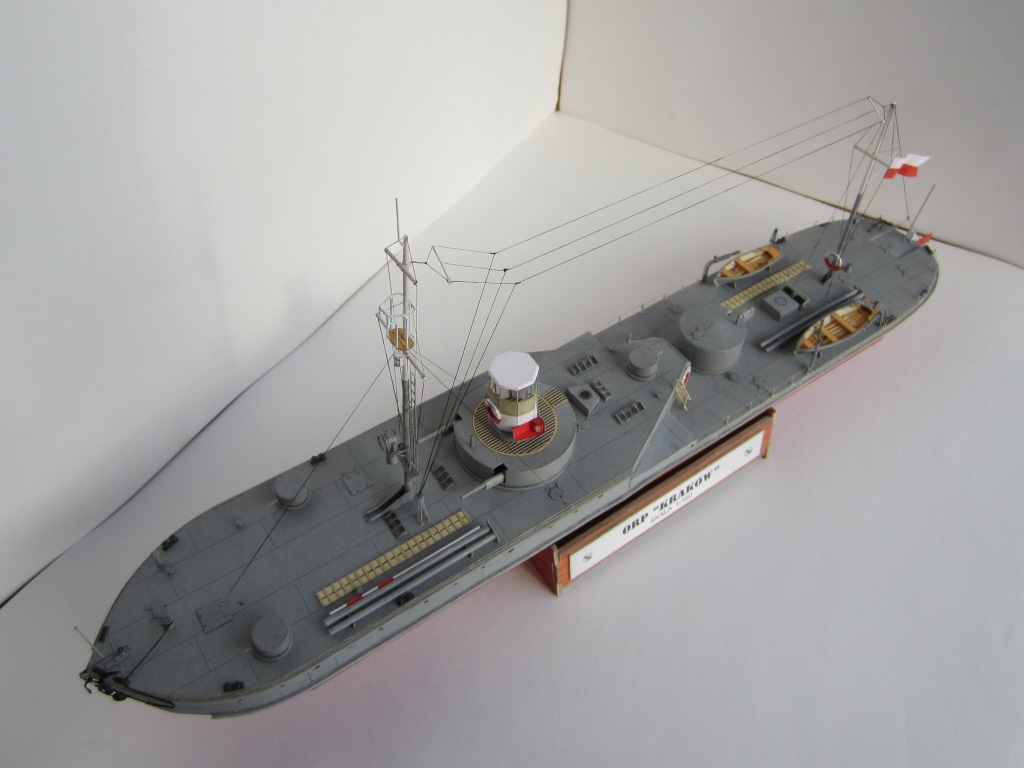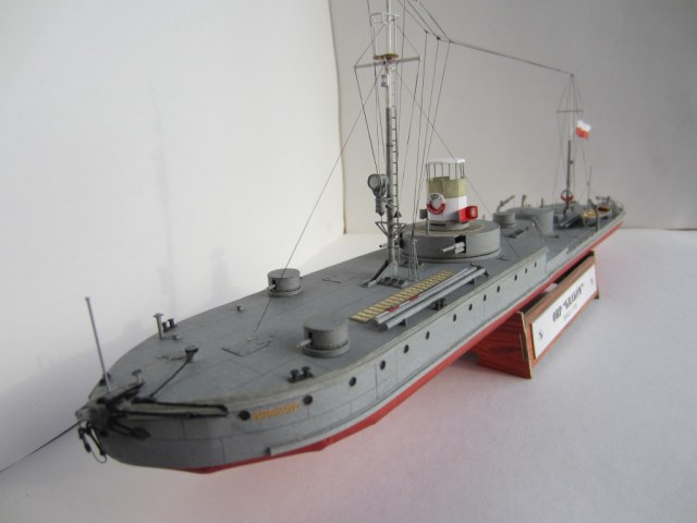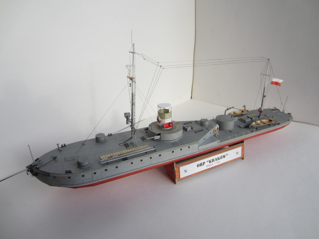 Несколько слов о прототипе: "Краков" вместе с однотипным "Вильно" вошел в строй в 1926 году (именно на этот период и изображает его модель – в дальнейшем корабль модернизировался и перевооружался). В ходе скоротечной военной компании в сентябре 1939 года ничем особым проявить себя не успел. Был затоплен экипажем на реке Пина при приближении Красной Армии. В дальнейшем был поднят и восстановлен, и вошел в состав советской Пинской военной флотилии под именем "Смоленск". С началом Великой Отечественной войны действовал на Припяти, Березине, Днепре и Десне. 15 сентября 1941 года, не имея возможности прорваться из окружения, был взорван экипажем в Ладинском затоне реки Десны неподалеку от Чернигова, где его останки в полузатопленном состоянии находятся и сейчас.