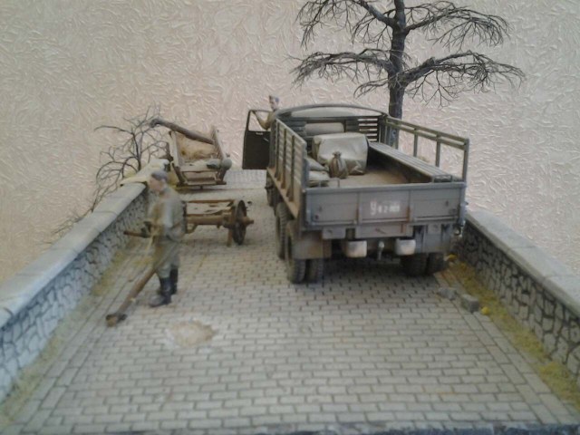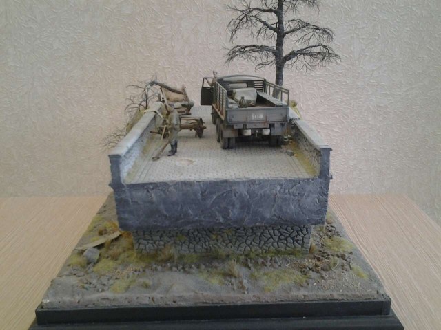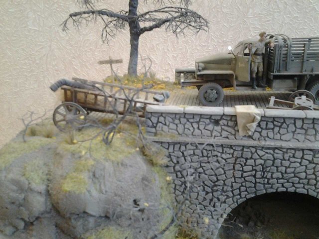 Фото бледноваты. Композиция - очень здорово, заготовка основания - великолепна, это ж сколько труда надо гипс резать, ствол и ветви дерева - просто отлично, но есть ощущение художественной недоработанности, в частности основания. На мой взгляд, мосту, мостовой и тому, что под мостом (а где река?) нужна тонировка с использованием, различных оттенков, т.е. опогоживание, как-то монотонно-однотонно выглядит большое пространство диорамы. Непонятно, дерево не живое, без листьев, обгорело, наверно, но мелкие ветви целы? Может зима, но в то же время, шофер по летнему, травка зеленеет. Может пылевая буря все накрыла? Авто и солдат рассмотреть четко практически не возможно. Итог. Композиционно работа - отлично, но по художке - желательно бы подработать. Желательно фото сделать профессионально или хотя бы с использованием лучшего разрешения, аппаратуры, ну и снять не на фоне обоев, а придумать, какой-нибудь задник.