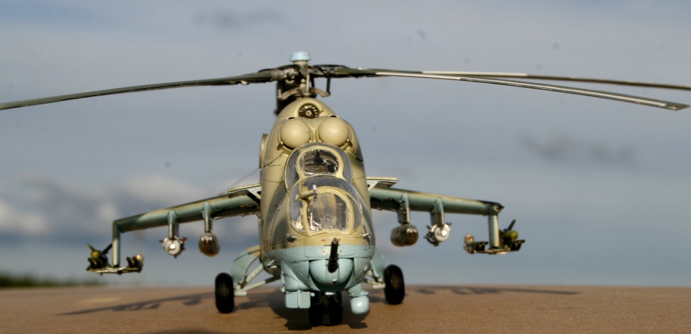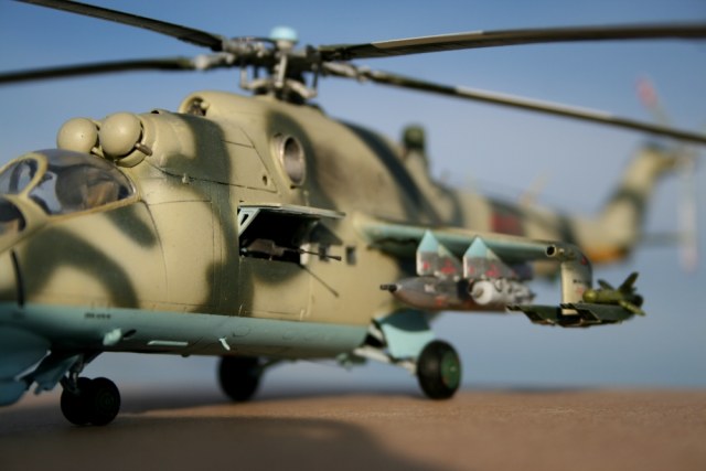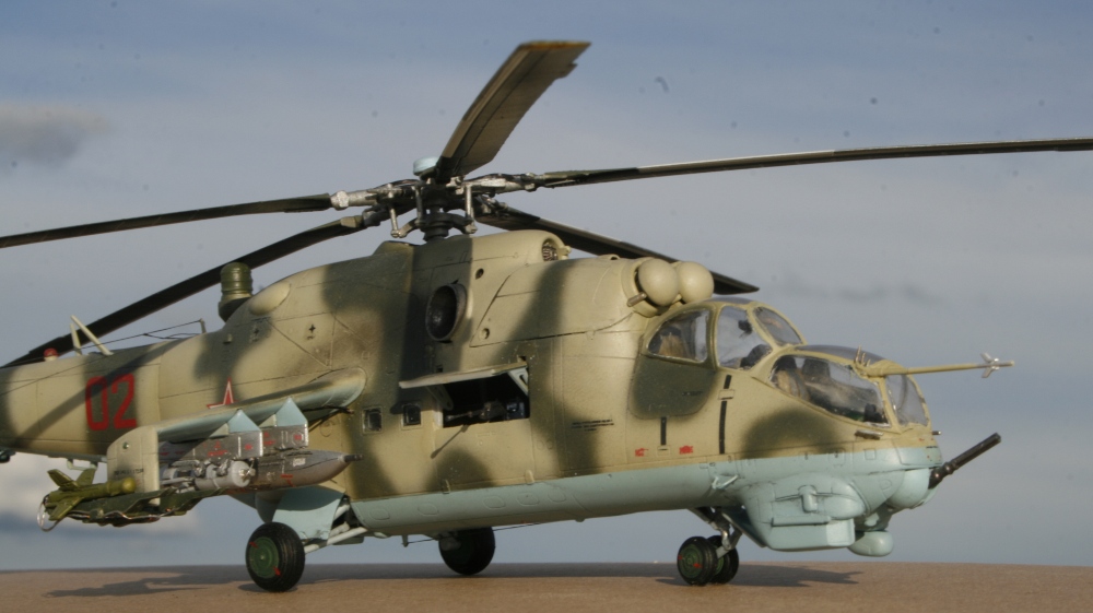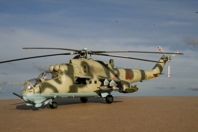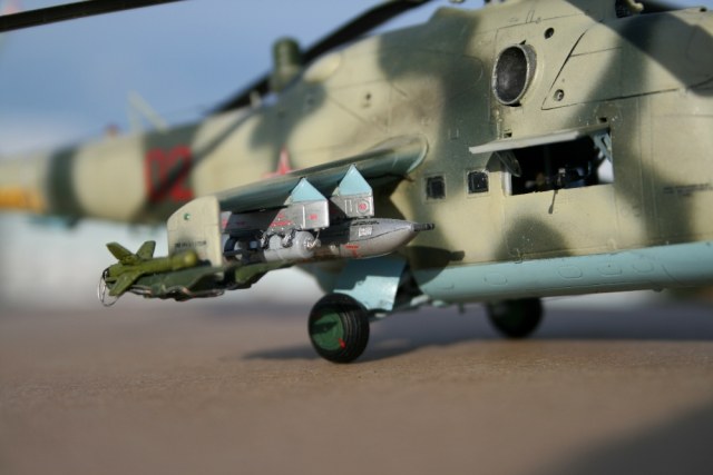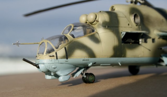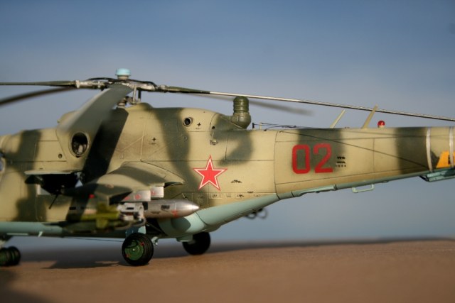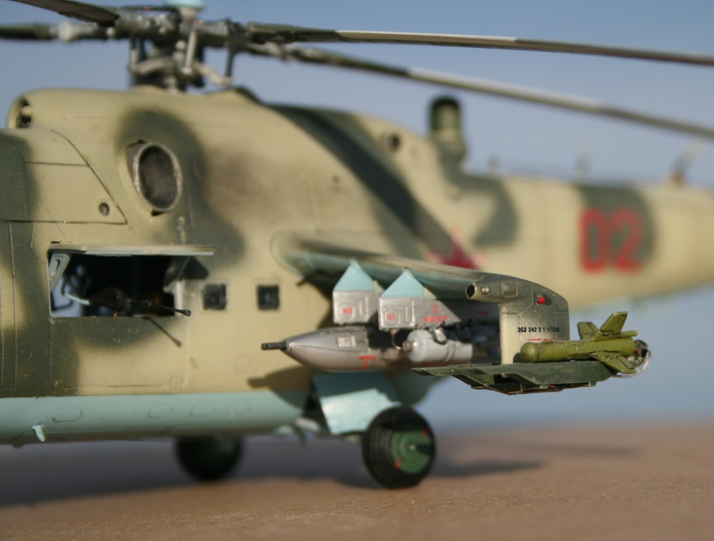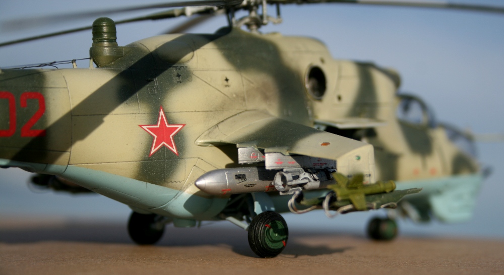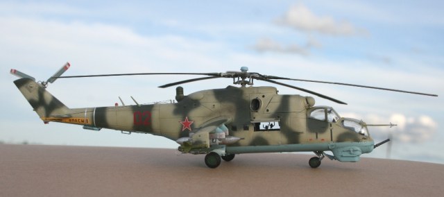 Ми-24 от ХобиБоса - приятная в сборке. Местами хромает точность и шов по остеклению немного портят картину, но радует богатый выбор вооружения. Модель собрана практически из коробки. Немного доработана «борода» и антенна наведения ПТУР соответственно модификации, сточены «гребни» на лопастях. УПК взяты с набора Звезды, бомбы из запасов. Пулеметы ПКТ и прицел ПКВ самодельные. Красил TAMIYA, финишный полуматовый мебельный лак.