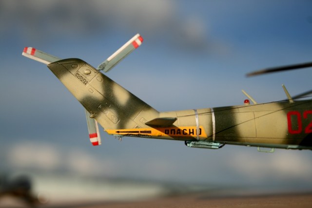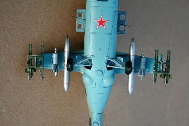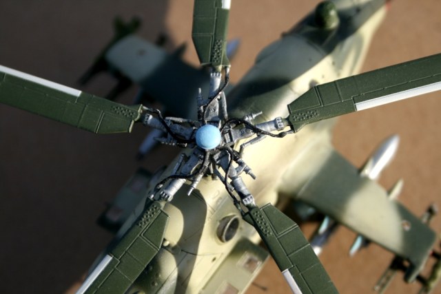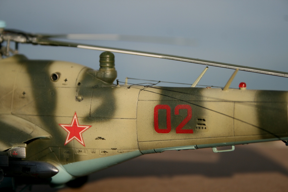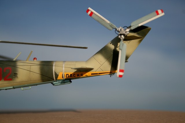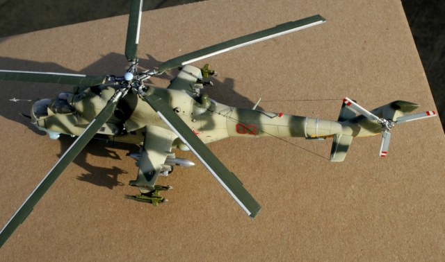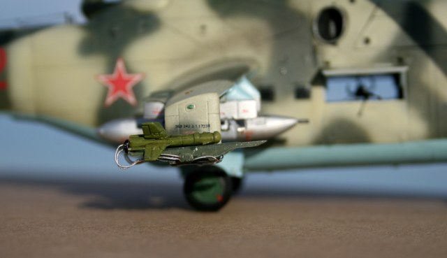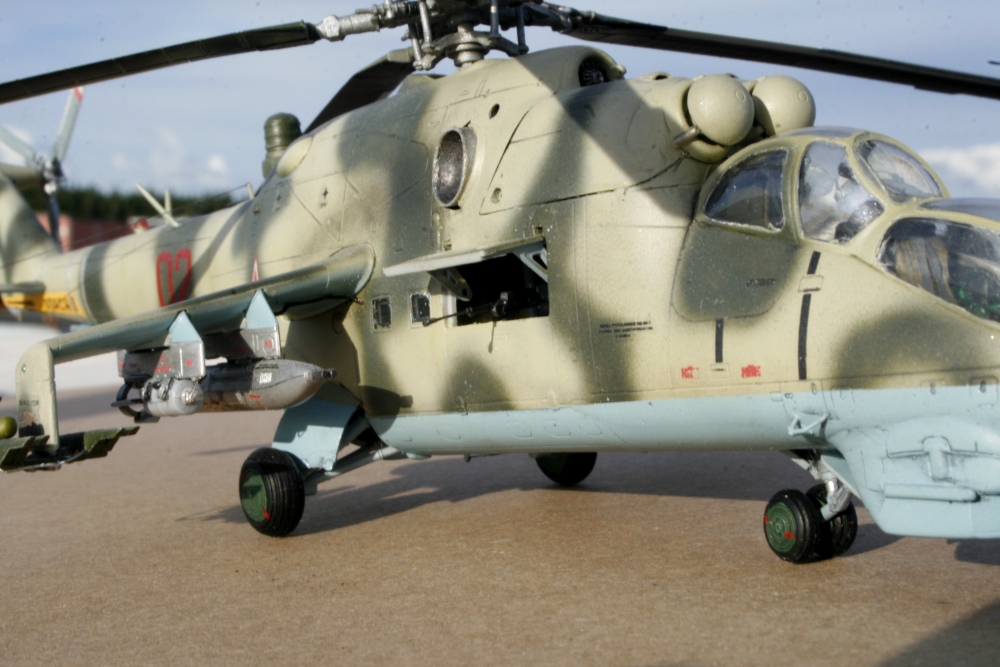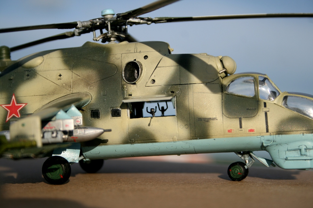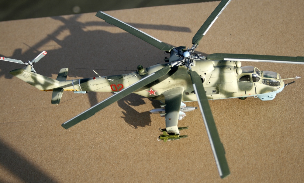 Ми-24 от ХобиБоса - приятная в сборке. Местами хромает точность и шов по остеклению немного портят картину, но радует богатый выбор вооружения. Модель собрана практически из коробки. Немного доработана «борода» и антенна наведения ПТУР соответственно модификации, сточены «гребни» на лопастях. УПК взяты с набора Звезды, бомбы из запасов. Пулеметы ПКТ и прицел ПКВ самодельные. Красил TAMIYA, финишный полуматовый мебельный лак.