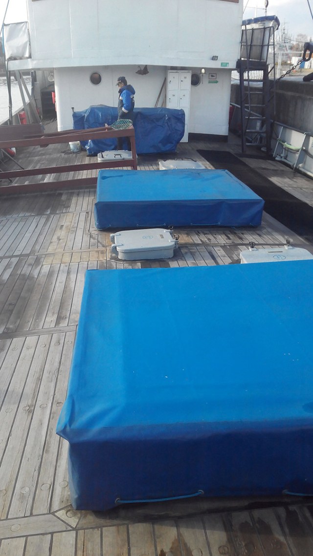 Среди палубного оборудования наибольший интерес представляют паруса. На судах типа СРТ поднимали паруса, используя их для увеличения скорости судна на переходе из одного района промысла в другой. Носовой парус (кливер) поднимался на фок-мачте, кормовой парус (трисель-грот) - на грот-мачте. На палубе также представлен рыбодел, на котором обрабатывалась выловленная рыба.