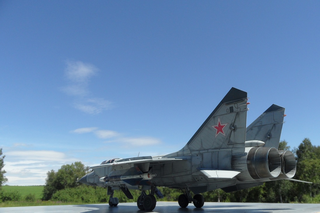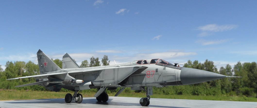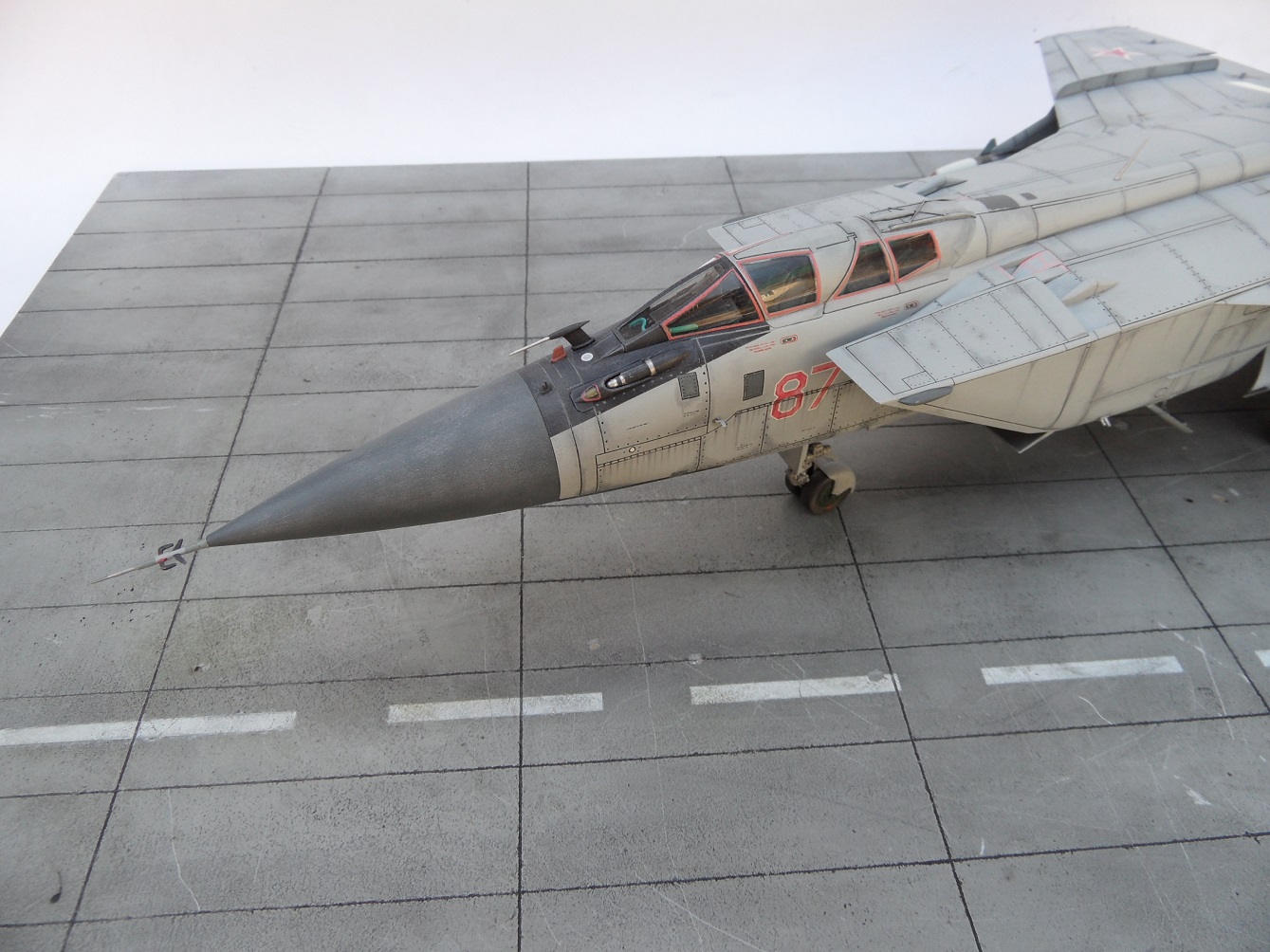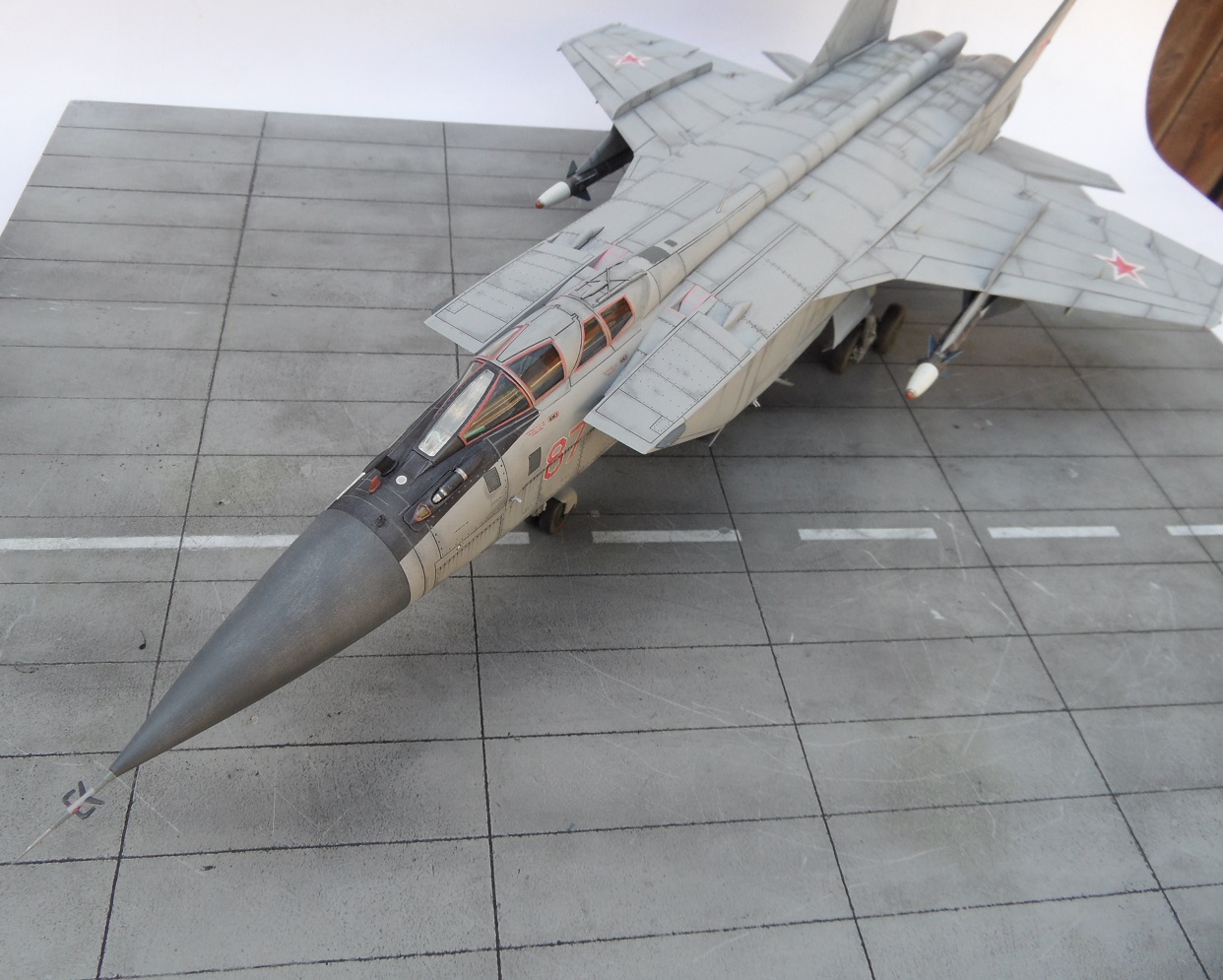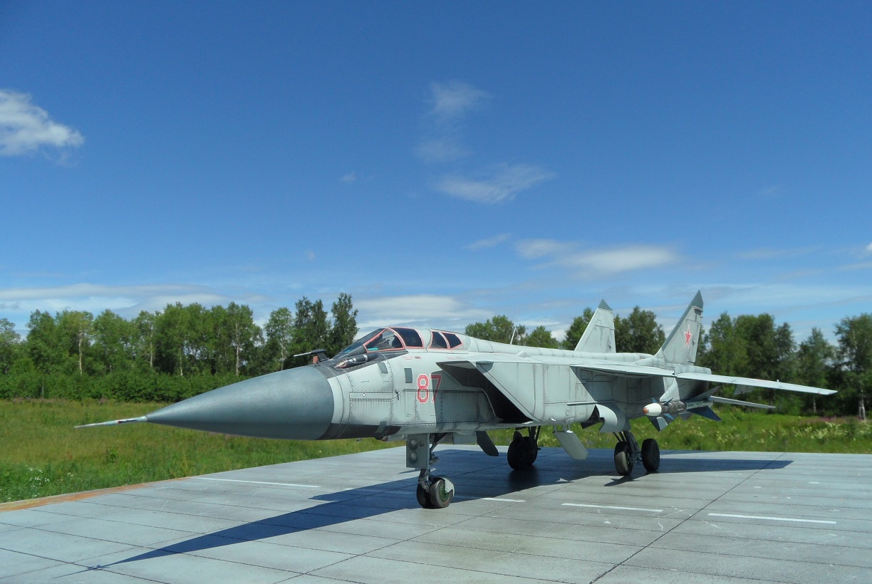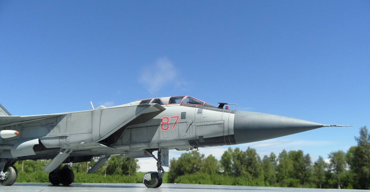 Привет всем! Представляю вам свое видение самолета Миг 31 в 48 масштабе от фирмы АМК. Модель просто потрясная, лучше ничего я не собирал, чудо а не модель ! Сборка ,детализация , качество просто супер! Этот набор примечателен тем что даны деколями герметик фонаря, два вида остекления( белое и желтое) я использовал желтое, платой фототравления(ремни, радар нчф, и антенки). Из доработок пришлось прорезать расшивку на фонаре чтоб обозначить ее откидные части( глухое остекление почему то не имеет прорезей), а так как я не люблю открытые кабины то пришлось резать, кое где добавил клепку, антенки , теплопеленгатор АМК почему то дает в выпущеном положении, пришлось малость переделать крепеж,проводку добавил-в общем по мелочи, модель самодостаточна и позволяет собрать из коробки детализированный самолетик. Проработка воздухозаборников, сопел поражает , жаль на фото не покажеш но на полочке всегда есть возможность рассмотреть, и кабину и ниши и сопла). В общем доволен очень , работать над данным самолетом одно удовольствие. Окрашена Мотип серый из баллона, тонирована пигментом серый тамия, сопла тамиевская пудреница. Герметик накрашивал сам кисточкой. Приятного просмотра! Саня AkaR спасибо тебе за фотки , я их тогда все сохранил и они мне опять пригодились!