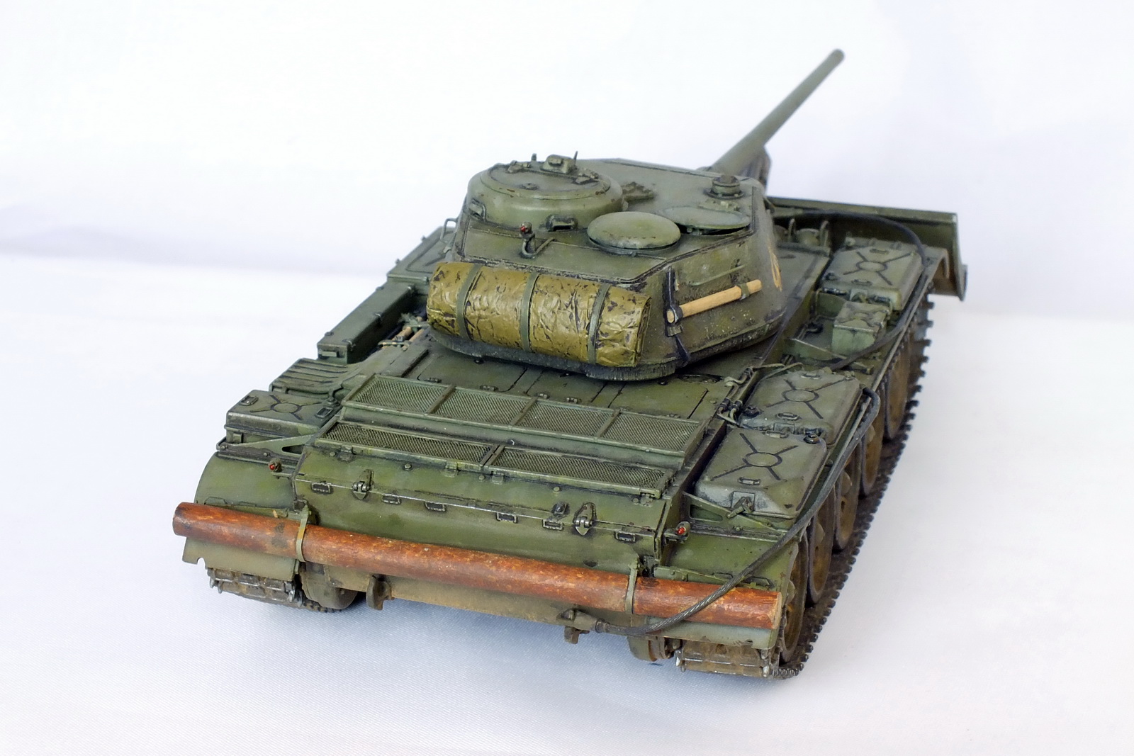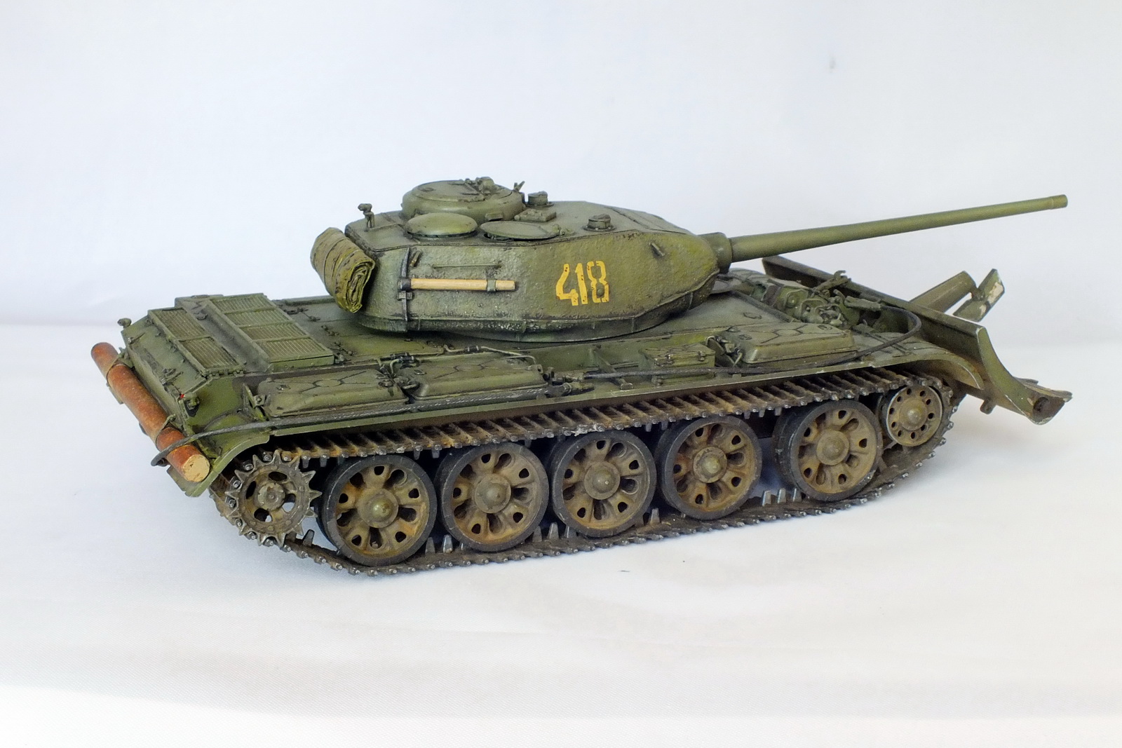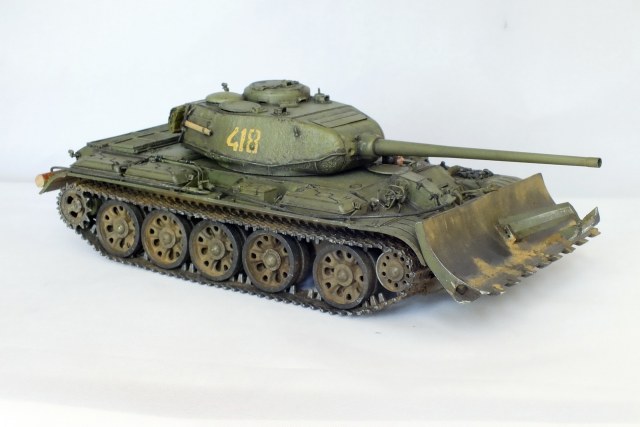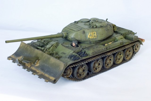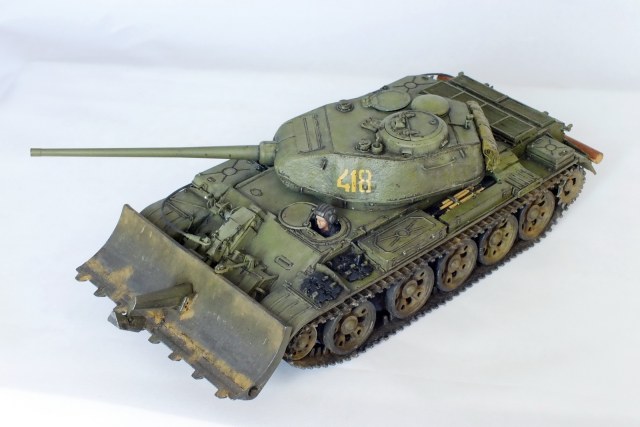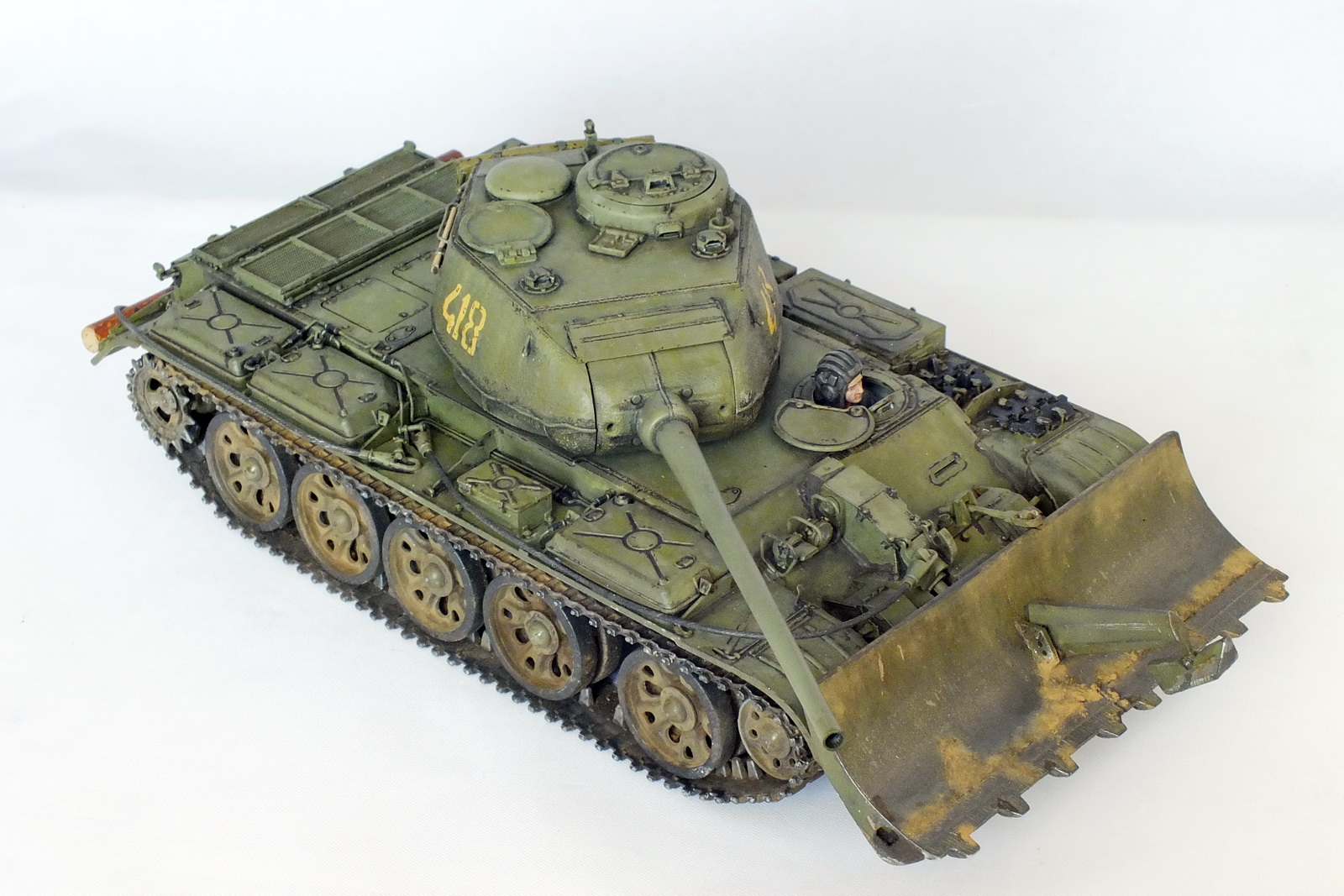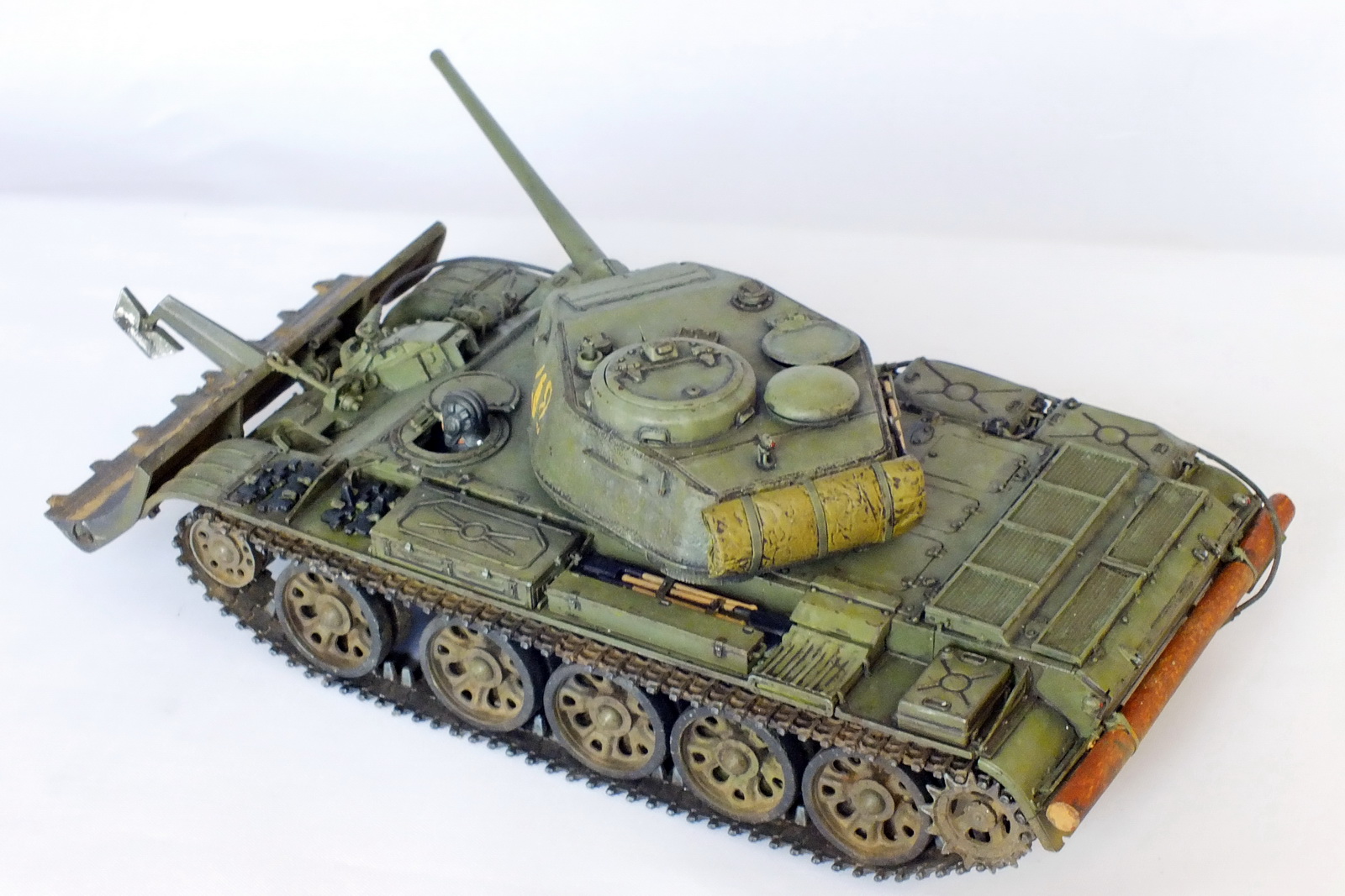 Сборка известного набора с небольшими доработками. Металлические ствол и антенный ввод, тросик из хозмага, бревно из палочки. Заменены поручни и топливопроводы на проволочные. БТУ от Hobby Planet, собралось немого криво. Пришлось подтачивать, чтобы отвал стоял прямо относительно танка. Фигурка мехвода не моя, я так красить лица ещё не умею. Интерьер присутствует, только сфотографировать забыл.