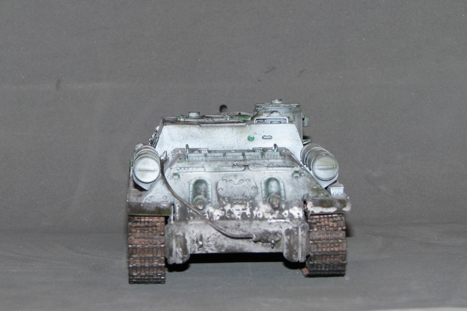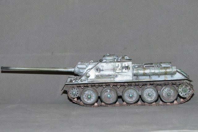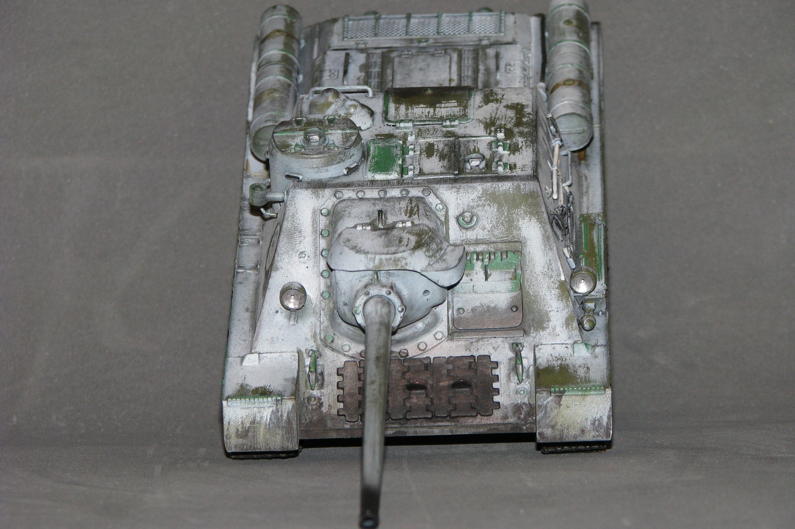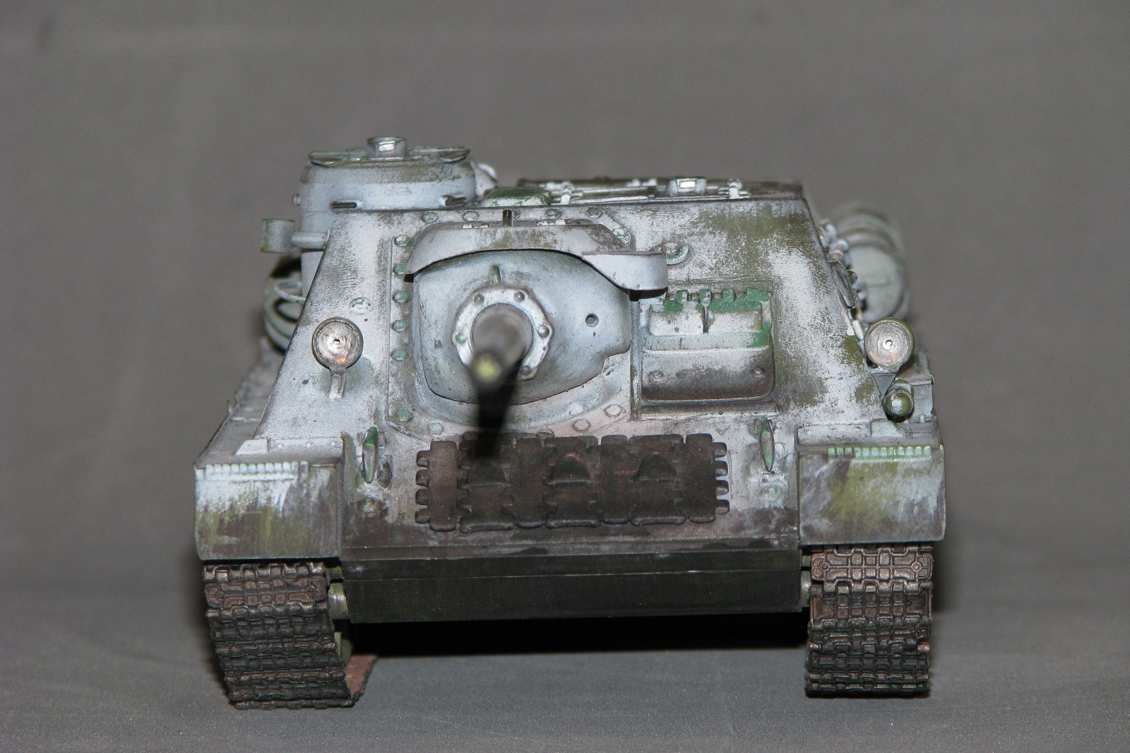 Неоднозначное впечатление от модели. Вроде направление правильное, на мой взгляд. Но отпечатки пальцев, сине-зеленые пятна в "базе", отсутствие "дорожки" от катков, "парящие" траки, страшно закопченный ствол, девственно чистые катки изнутри, а снаружи - грязь, не рассверлены выхлопные (по крайней мере на фото это выглядит так). Матчасть не обсуждаю, потому как "песок".