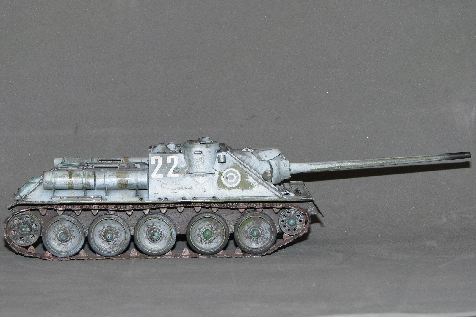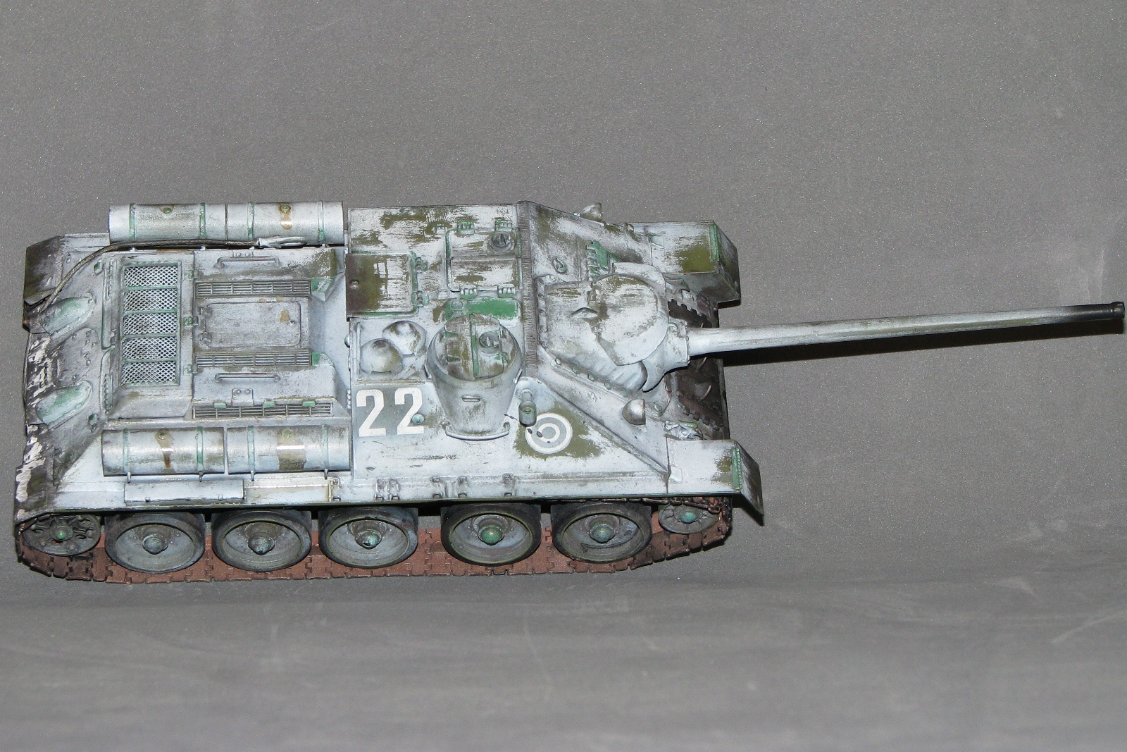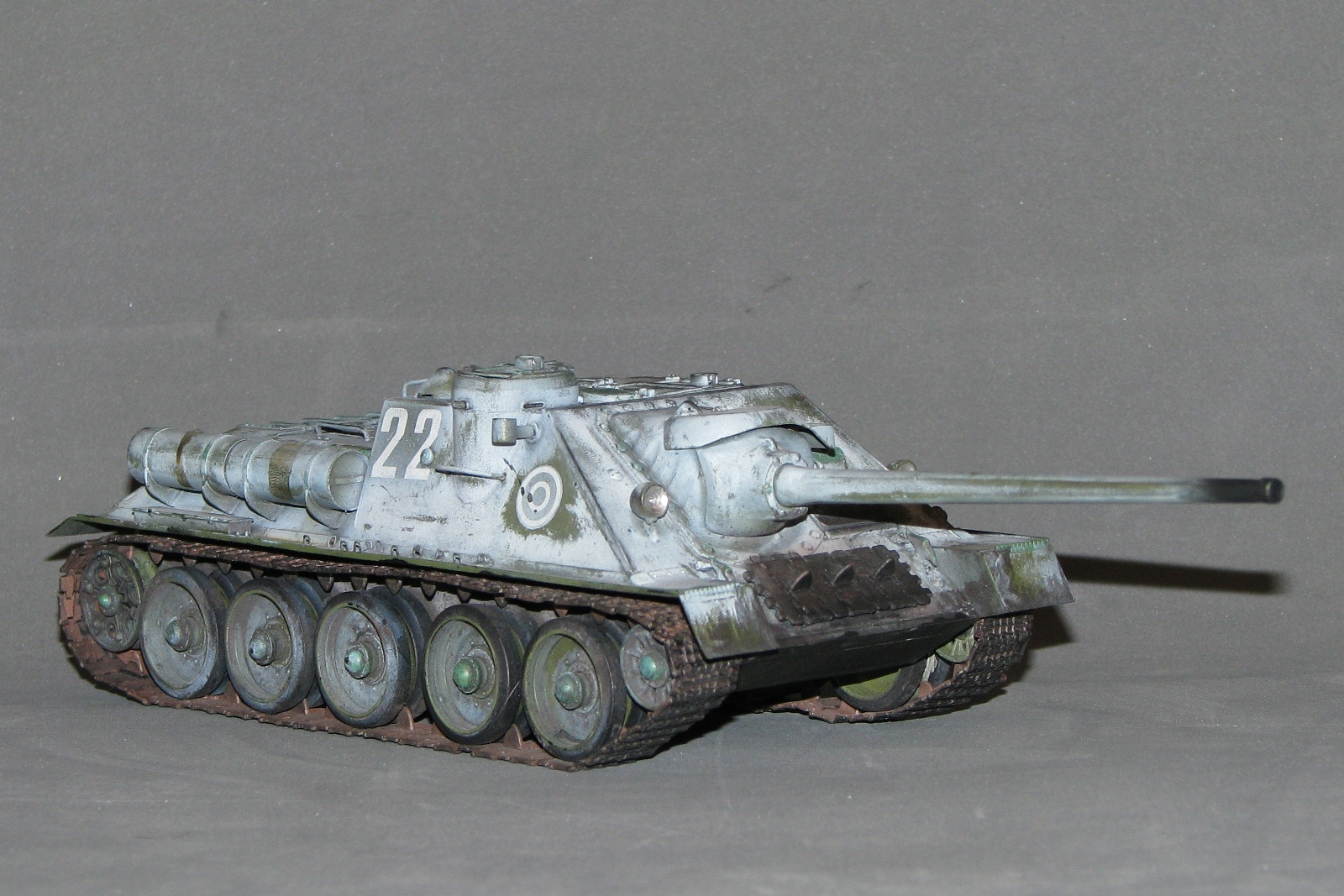Неоднозначное впечатление от модели. Вроде направление правильное, на мой взгляд. Но отпечатки пальцев, сине-зеленые пятна в "базе", отсутствие "дорожки" от катков, "парящие" траки, страшно закопченный ствол, девственно чистые катки изнутри, а снаружи - грязь, не рассверлены выхлопные (по крайней мере на фото это выглядит так). Матчасть не обсуждаю, потому как "песок".