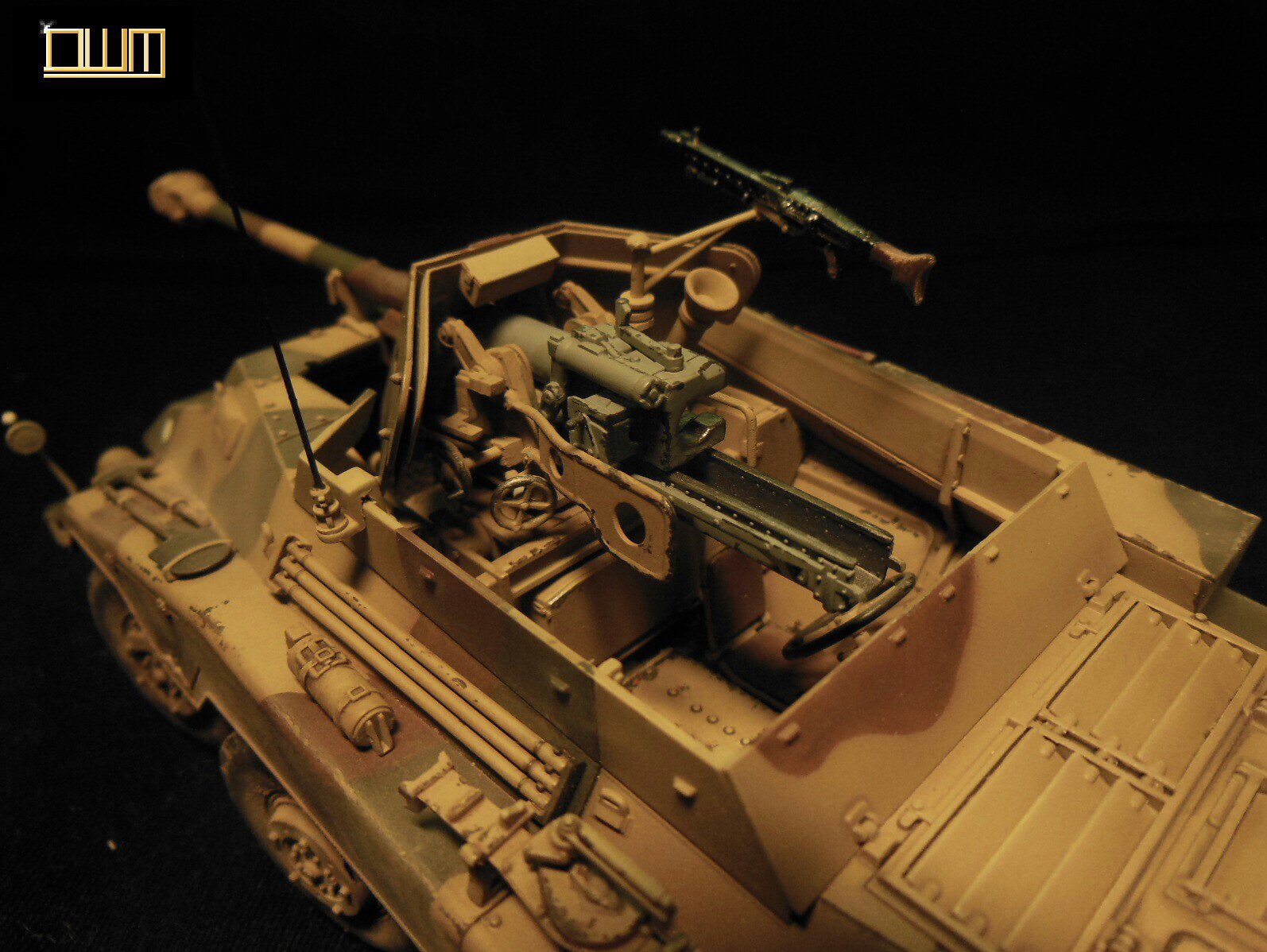 А теперь к самой работе. Набор я строил полностью изкоробочный, так как исходником остался крайне доволен ( да что уж там, был в восторге ) Никаких проблем при постройке не возникало, все шло как по маслу. Красил модель акрилом от " Тамии ". Базовый темно-желтый с пятнами двухцветного камо с надписью " Blücher " и опознавательным белым кругом на левом боку спереди. Этот камо в инструкции назван " неопознанное подразделение, Прага 1945 ". Камуфляж имел ровные границы, что было воссоздано на модели при помощи маскировочной малярной ленты. Я решил сделать модель, прототип которой пожил немного, не успев сильно износиться. Для создания пыли, ржавчины и потертостей на казённой части орудия использовались пигменты " Mig " и " Wilder ", ничего необычного. Какого-то сверх крутого визеринга я делать не стал, так как откровенно не умел и портить такую модель не хотелось. Исполнил на ней только те техники, которые уже освоил. Результатом я остался крайне (!) доволен и модель по сей день занимает самое главное и видное место на полке. С уважением