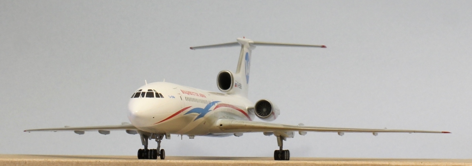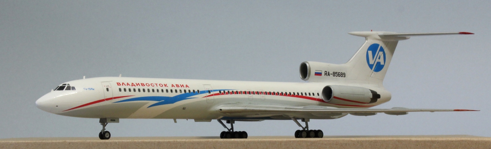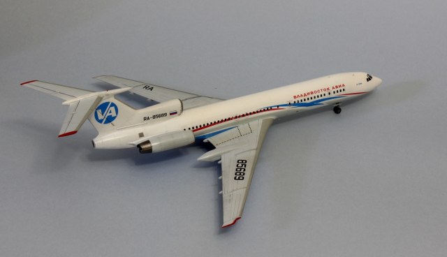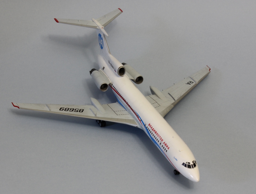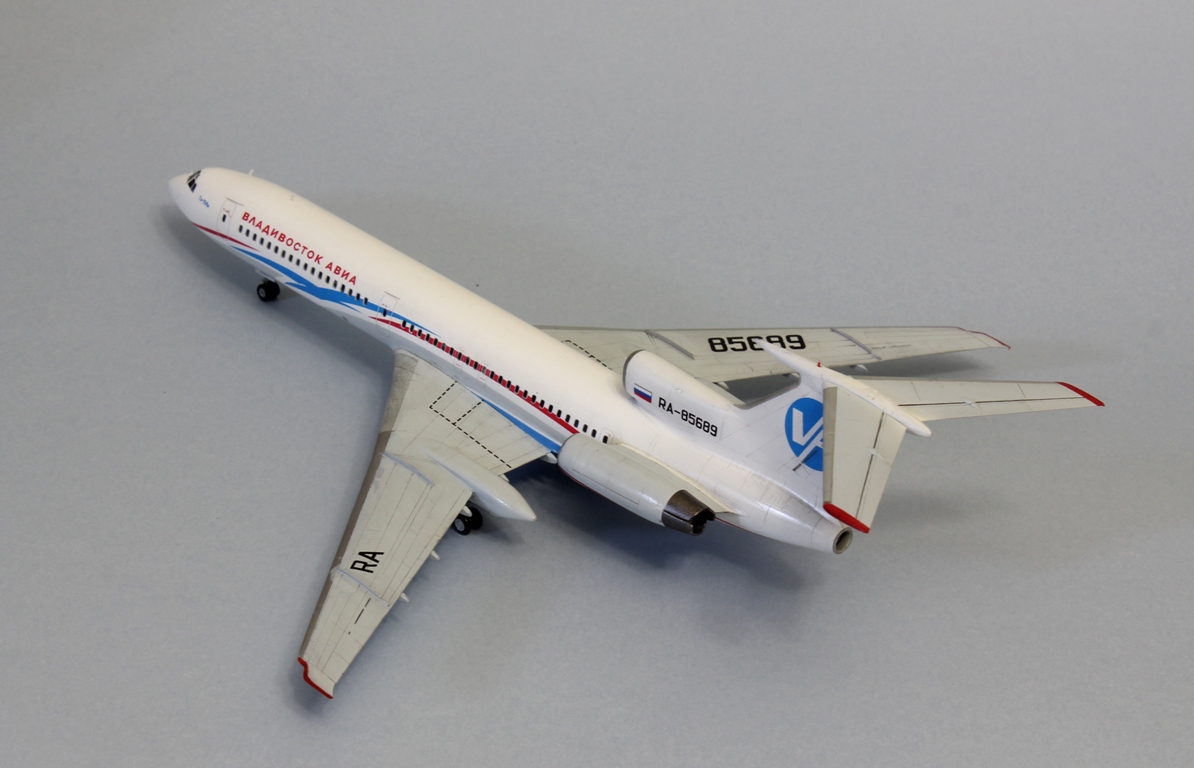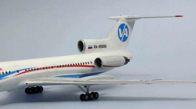 Всем привет! Долго раздумывал перед тем, как решиться на эту модель. А точнее, в этой ливрее. Как по мне, так это самая красивая ливрея для 154-го из всех, что когда-либо были, да и первый в моей жизни полёт был именно на этом борту, поэтому желание иметь его в коллекции жило во мне давно. Почему долго думал? Потому что не представлял как покрасить все криволинейные участки серого цвета - до этого на всех моих моделях границы цветов были достаточно просты и прямолинейны. Для этого я использовал декаль в качестве шаблона, контуры сделал тонкими полосками синей изоленты - она хорошо гнётся и приобретает нужную кривизну, хотя в двух местах получилось немного ниже положенного. Главное перед этим как следует просушить основной слой белого цвета, иначе изолента краску поснимает. Следующей проблемой был подбор синего цвета на брюхе - он должен повторять декаль, попасть в него мне удалось раза с 15. Вроде бы простой, а никак не получалось. Запорол клеем лобовое остекление, пришлось наклеить декаль, согласен, немного нелепо, так как остальные окна настоящие, даже шторки на них сделал). По сборке говорить нечего, все эту модель прекрасно знают. Тонировкой не увлекался, только расшивку слегка выделил и то не везде, сильнее выделять не вижу необходимости. Красил тамией, декаль Аскенсио - очень хорошая декаль, не тянется, прочная, проблем с нанесением не возникло. Конечно, можно было углубиться в матчасть, много чего проработать - но такой цели не стояло, поэтому прошу особо к ней не придираться (к матчасти)) Приятного просмотра)