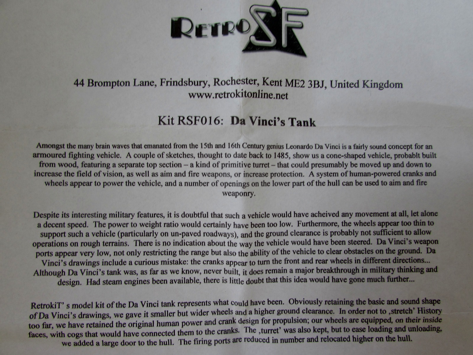 Инструкция короткая - правда, и деталей не так много. Фирма сразу предупреждает, что модель "по мотивам" - по сравнения с чертежом Леонардо "гуляют размеры" и разительно меньше пушечного вооружения.
