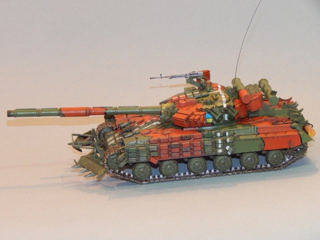 Хотелось сделать машину с боевыми повреждениями, но, к большому сожалению (или счастью) эти машины принимали участие только в Приднестровье, первой Чеченской, да на Украине. И самыми колоритными мне показались именно машины ВСУ. Машина УМЫШЛЕННО НЕ ИМЕЕТ БОРТОВОГО НОМЕРА и является скорее неким собирательным образом машин с подобным камуфляжем. Чтобы не заляпывать грязью красоту машины, пусть её предыстория будет такой: машина была помыта экипажем, затем вступила в непродолжительный бой, где получила несколько попаданий противотанковых гранат в динамическую защиту, после чего своим ходом прибыла к месту ремонта.