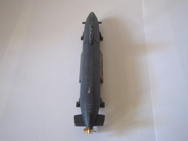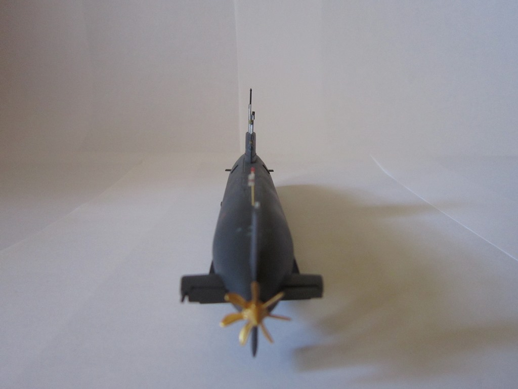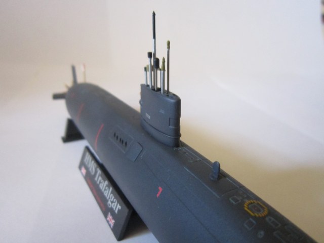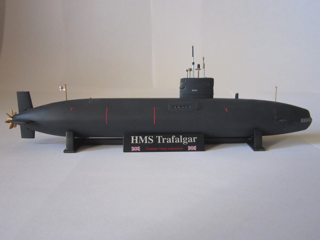 Лодка собиралась как на средний срок прохождения службы , после модернизации . Не помню где прочитал , что именно на «Trafalgar» до конца службы стоял гребной винт , а не насадка "pump jet" . По этому было решено на лодку установить винт. Сборка лодки прошла без затруднений , если не считать плохую стыкуемость маленькой детали перед винтом , на этом месте пришлось не много повозится. Лодка полностью покрашена в цвет резины , расшивка выделена светло-серой акриловой краской , и после лодка задута матовым лаком. Гребной винт задут золотым металликом и покрыт футурой , флагштоки покрашены в светло-песочный , а не в белый , примерно такие же имеются на фото «Trafalgar» . На кормовом флагштоке установлен флаг и красный фонарь , на носовом белый фонарь , так же белый огонь установлен на вертикальном руле. ВУ сделаны из медицинских игл , на ограждение ВУ установлен поручень и дверь из алюминиевого скотча. Подставка задута стальным металликом и глянцевым лаком.
