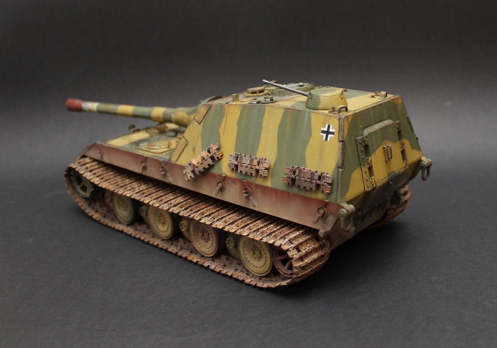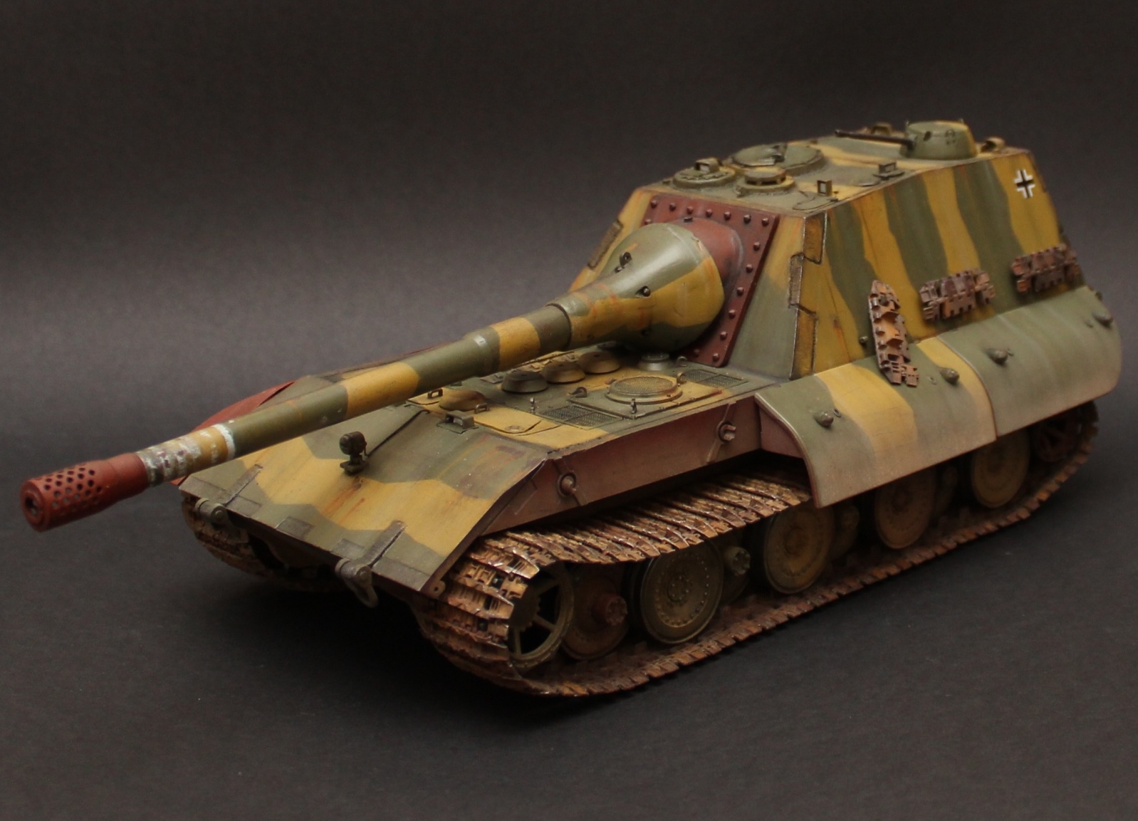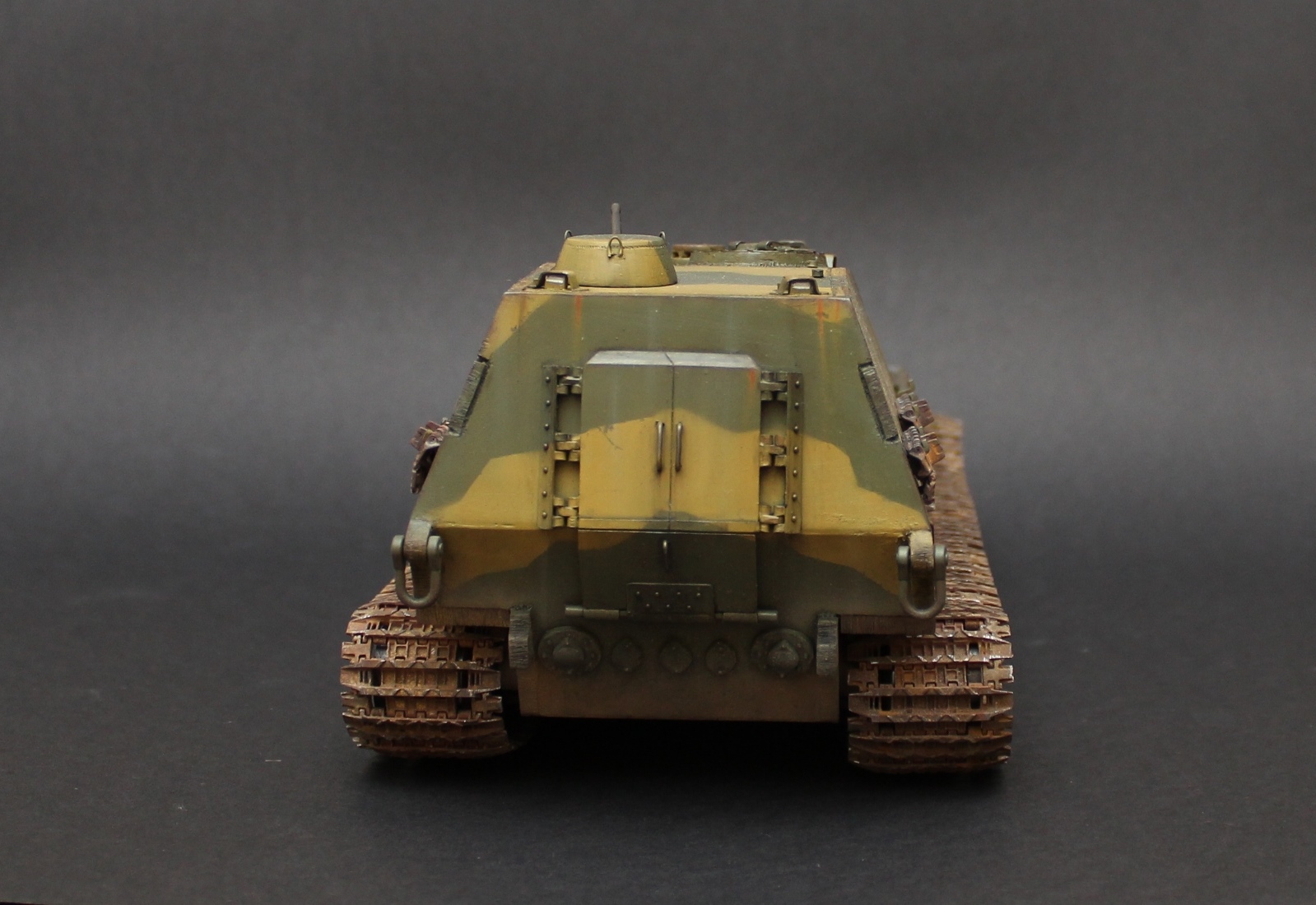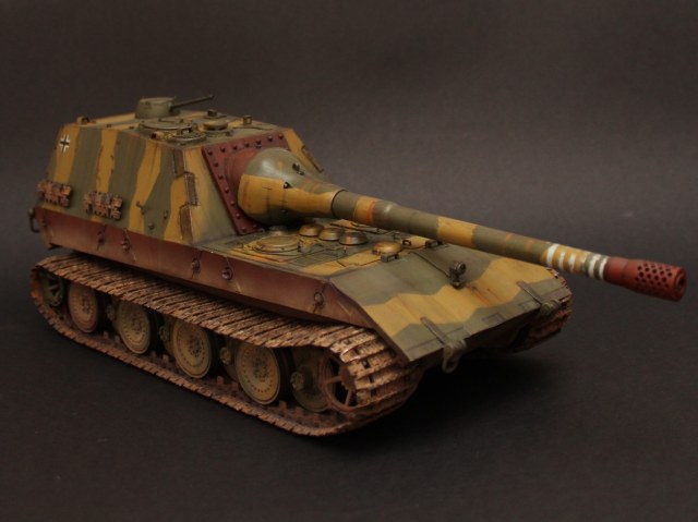 Перезаливаю модель. За основу был взят набор Jagdpanzer E-100 от Trumpeter. Из набора использована ходовая часть + всякая мелочевка. Образ машины взят из всеми известной игры WOT, где такой агрегат имеет заднее расположение рубки. Танк является выдумкой. Рубка и лючки изготовлены из листового пластика, а маска орудия выточена из двух-компонентной шпатлевки. Траки от Friulmodel. Окраска Mr. Hobby, Tamiya, масло, пигменты Mig, жидкость для чернения гусениц. .