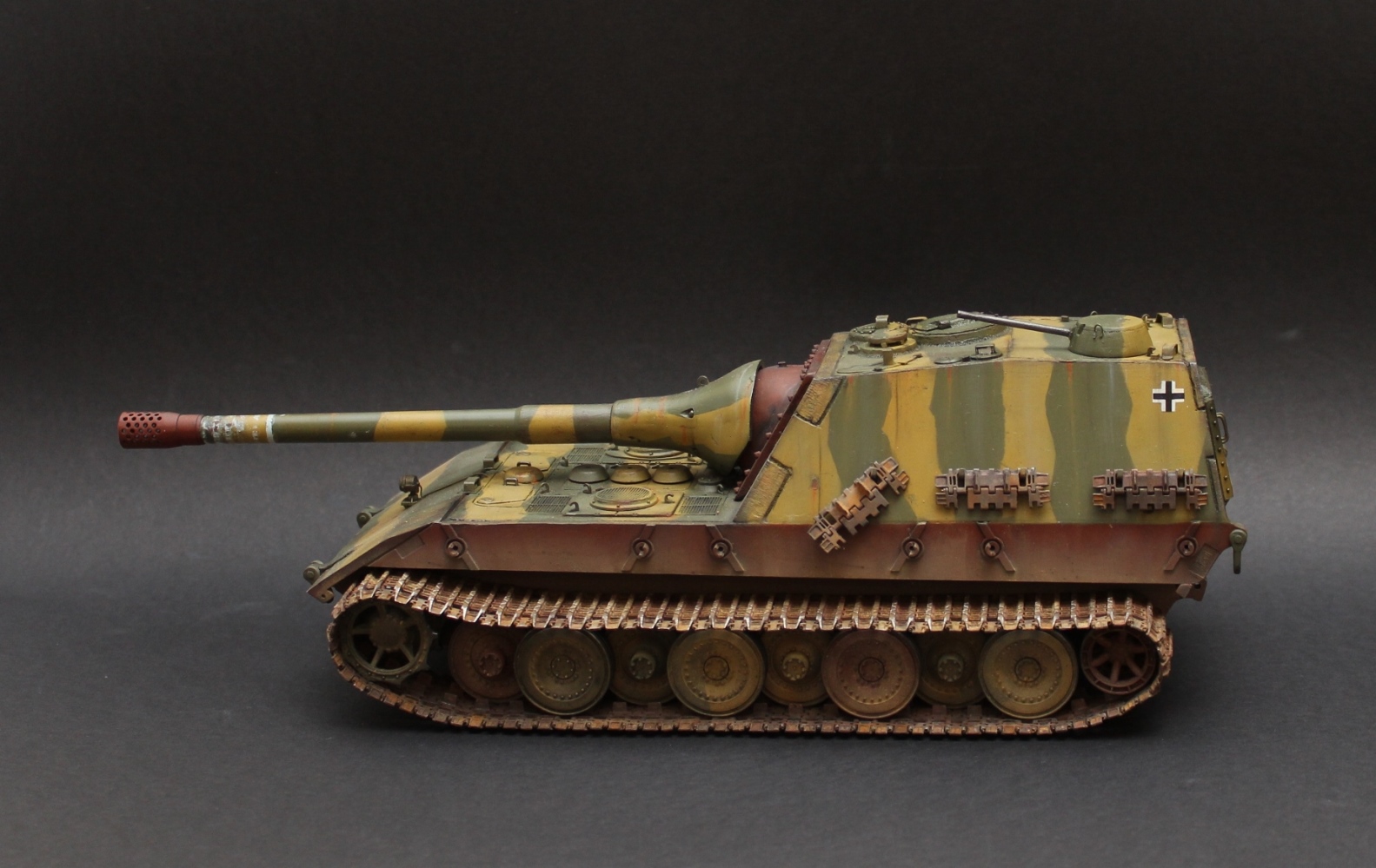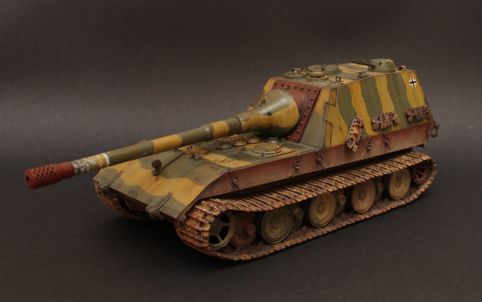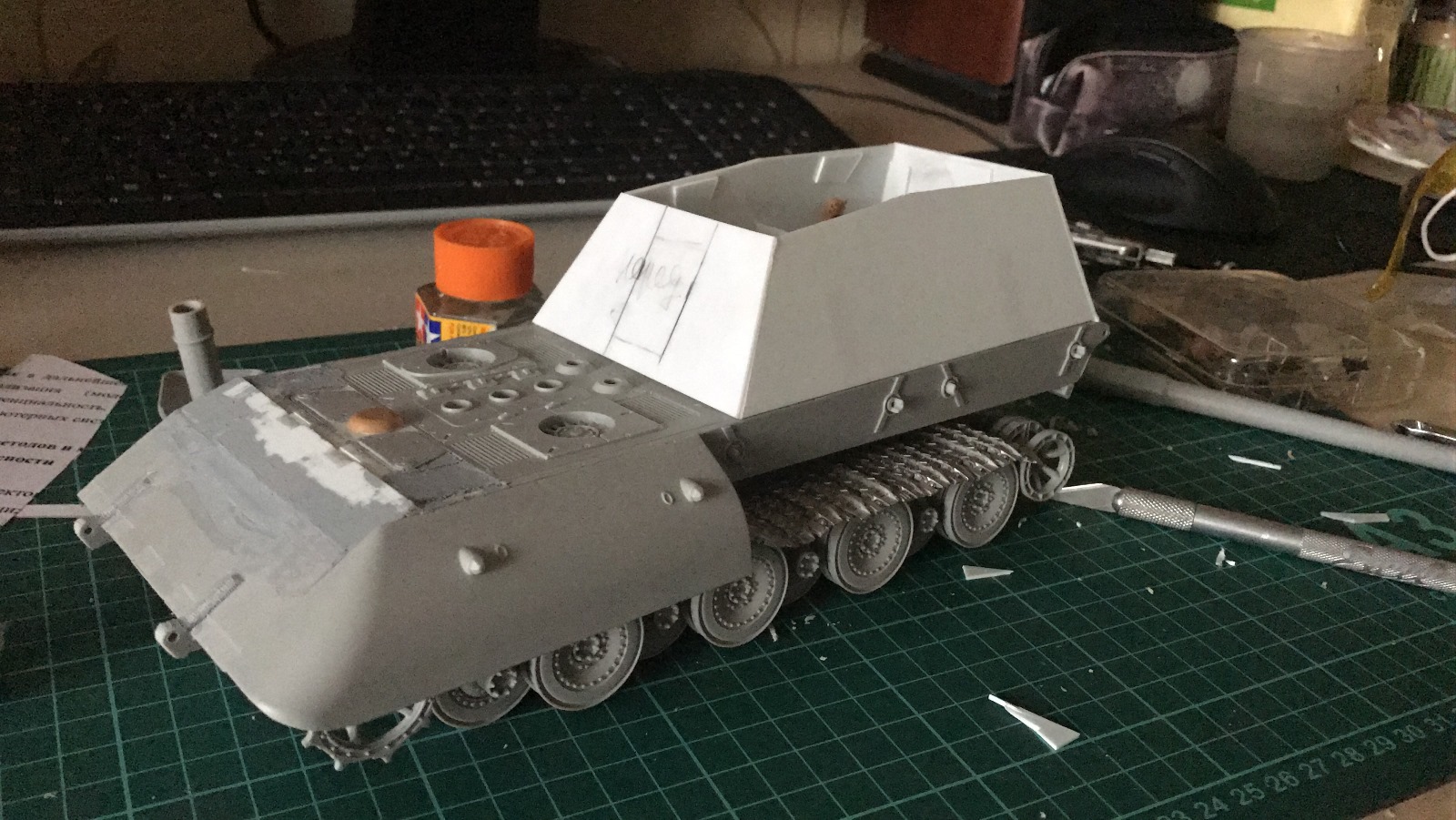 Перезаливаю модель. За основу был взят набор Jagdpanzer E-100 от Trumpeter. Из набора использована ходовая часть + всякая мелочевка. Образ машины взят из всеми известной игры WOT, где такой агрегат имеет заднее расположение рубки. Танк является выдумкой. Рубка и лючки изготовлены из листового пластика, а маска орудия выточена из двух-компонентной шпатлевки. Траки от Friulmodel. Окраска Mr. Hobby, Tamiya, масло, пигменты Mig, жидкость для чернения гусениц. .